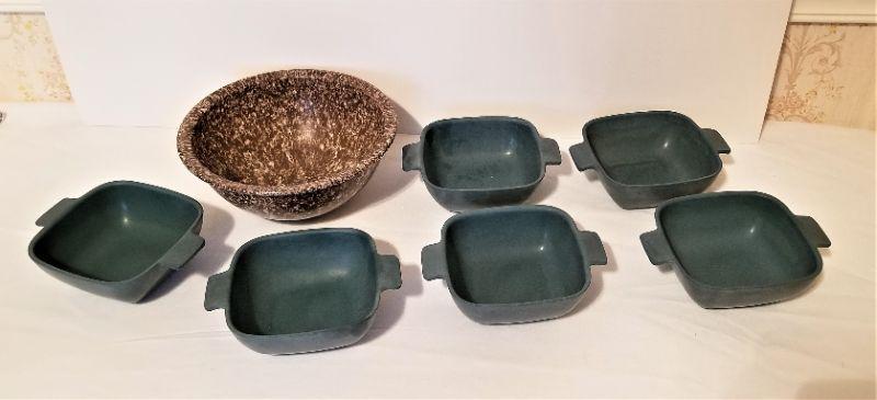 You get all you see here - Mid Century mixing bowl and set of six serving/cereal bowls - all Melamine and made by the Arrowhead Company. Good vintage condition - perfectly usable. Mixing bowl is 8.25 " across. Cereal bowls measure 6.25" across handle to handle.
