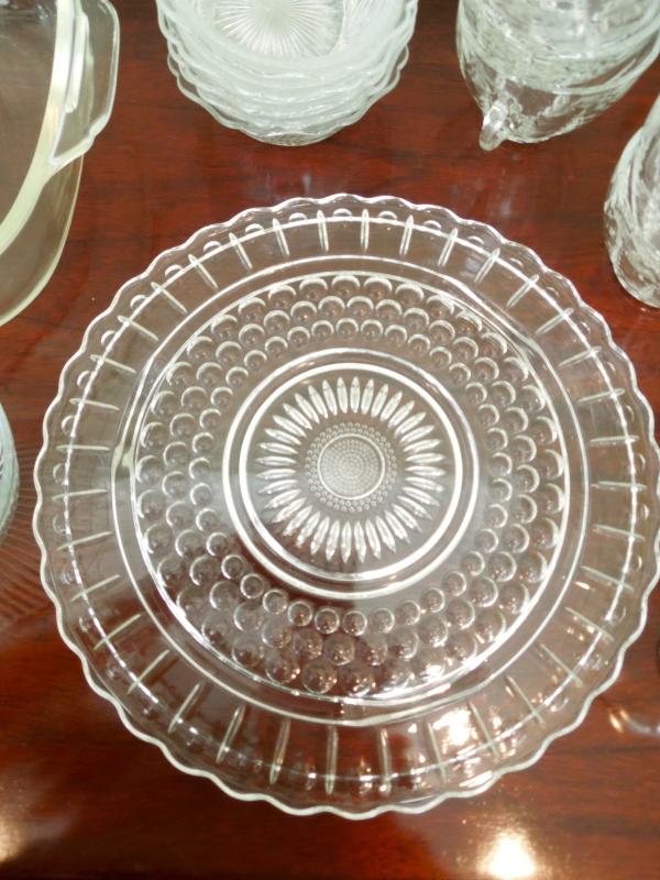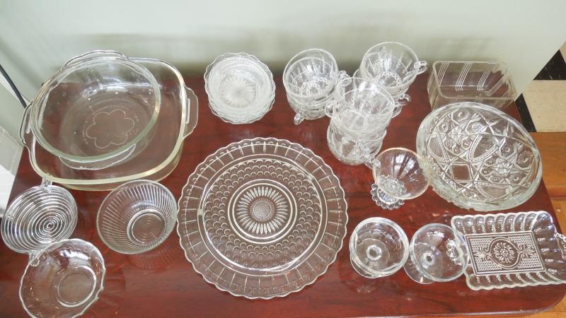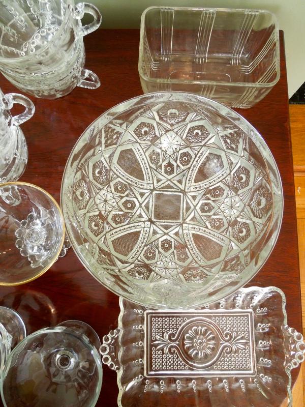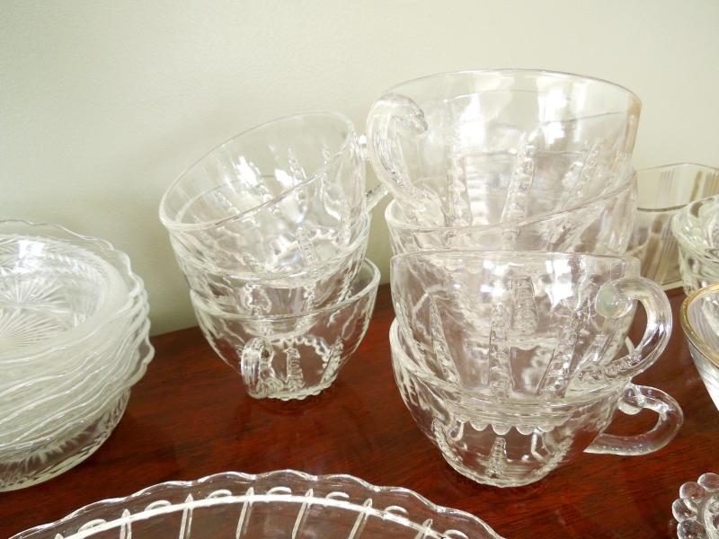 Punch cups, sherbets, cake plate, cut glass bowl, candy dish. No chips or cracks noted.