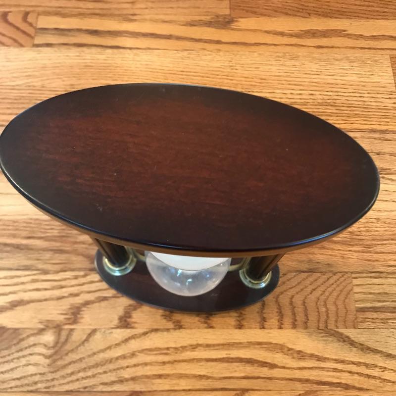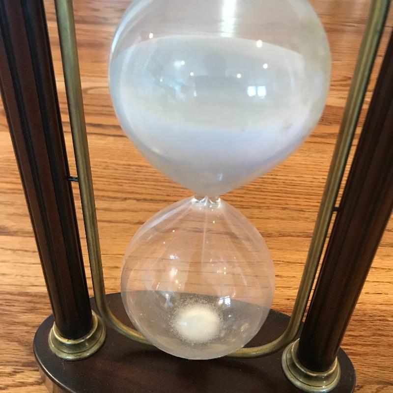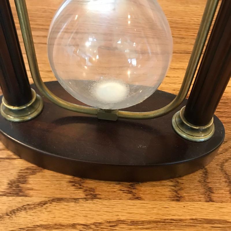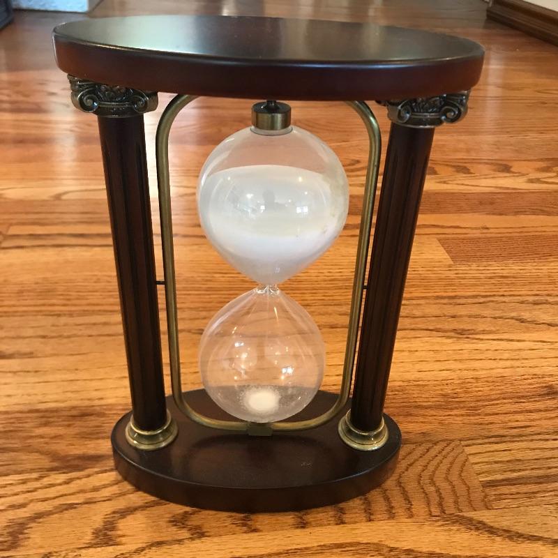 This beautiful large hour glass is made of dark wood, glass, and gold trim with white sand. Not certain what the time measurement is. Made in Taiwan. Approx. 7.5” x 4” x 10.5”. Shipping available.