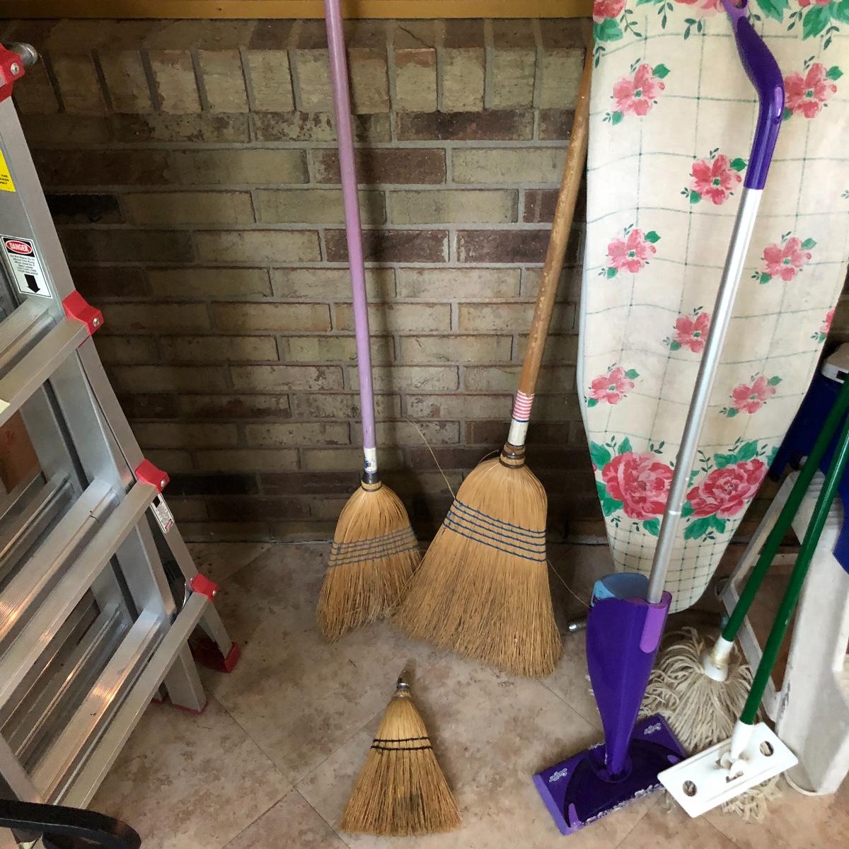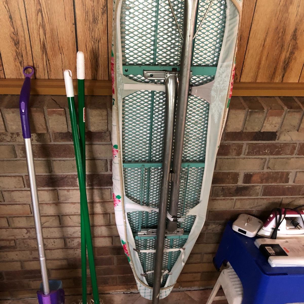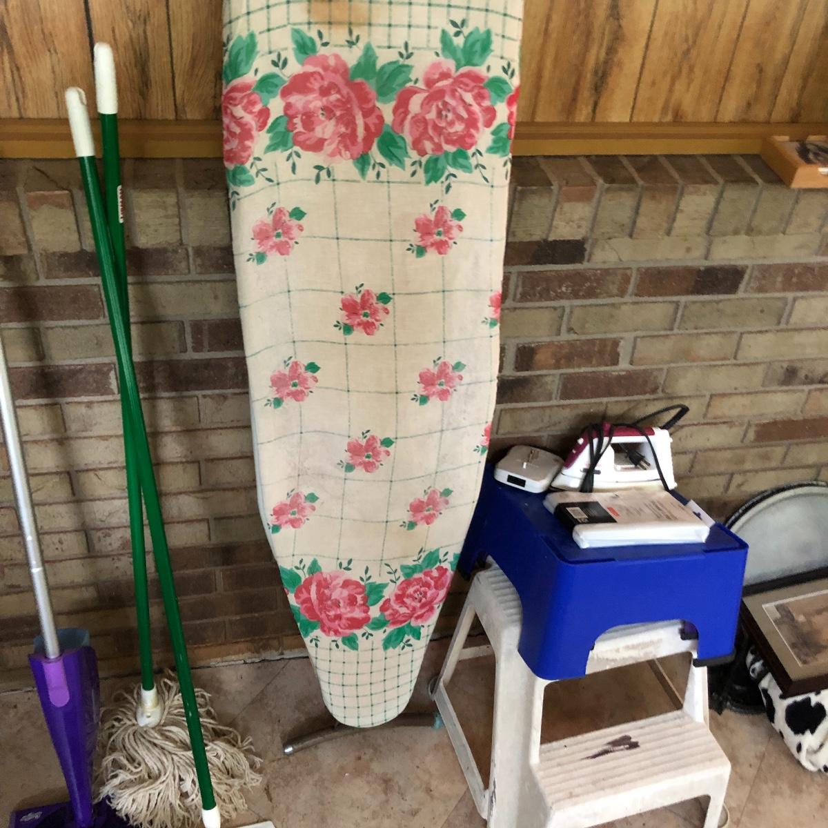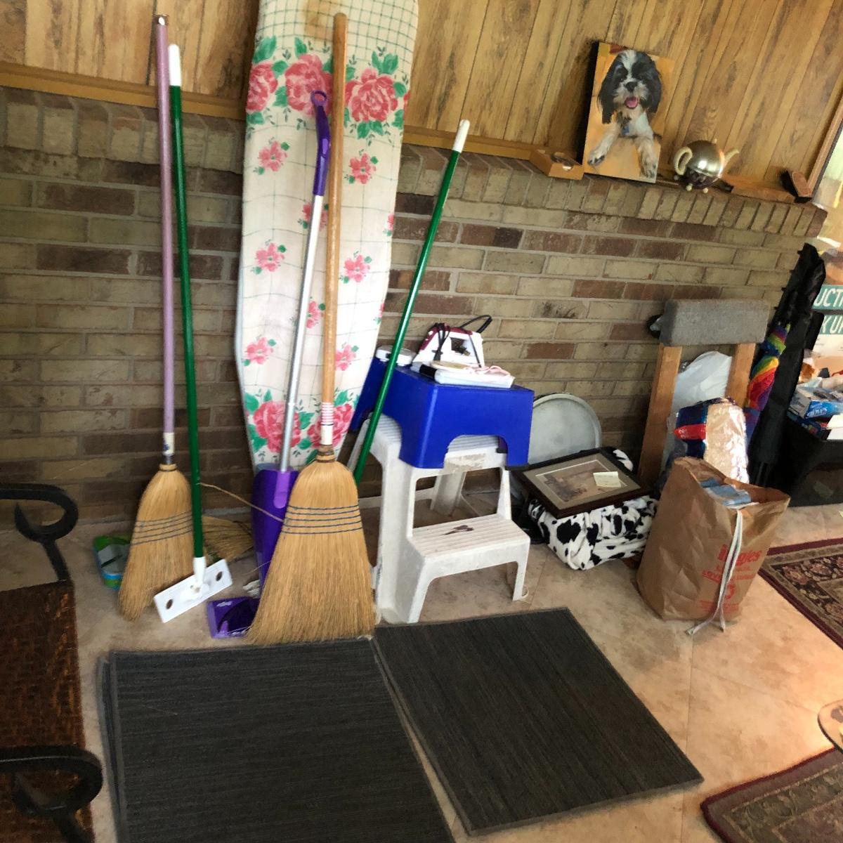 A great assortment of items every household can use. Lot includes a Sunbeam iron, three stools (the largest is about 15.5” x 15.5” x 16” tall) vintage ironing board, brooms, mops, four 24” x 24” square floor mats and more. Iron worked when tested.