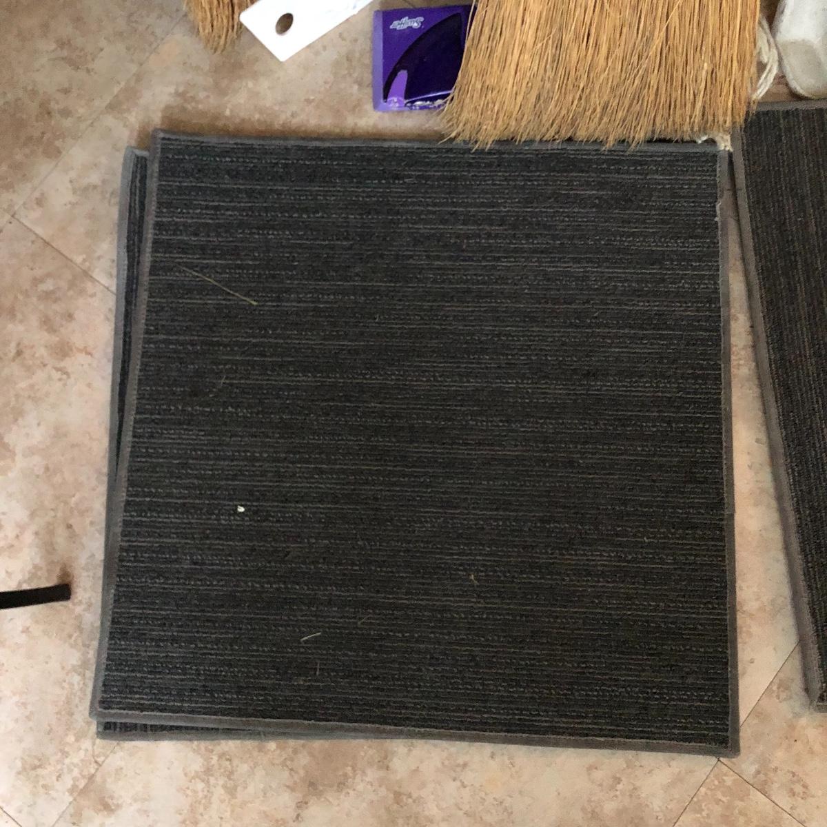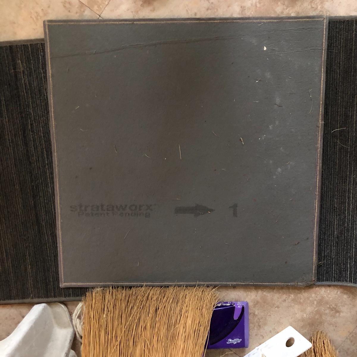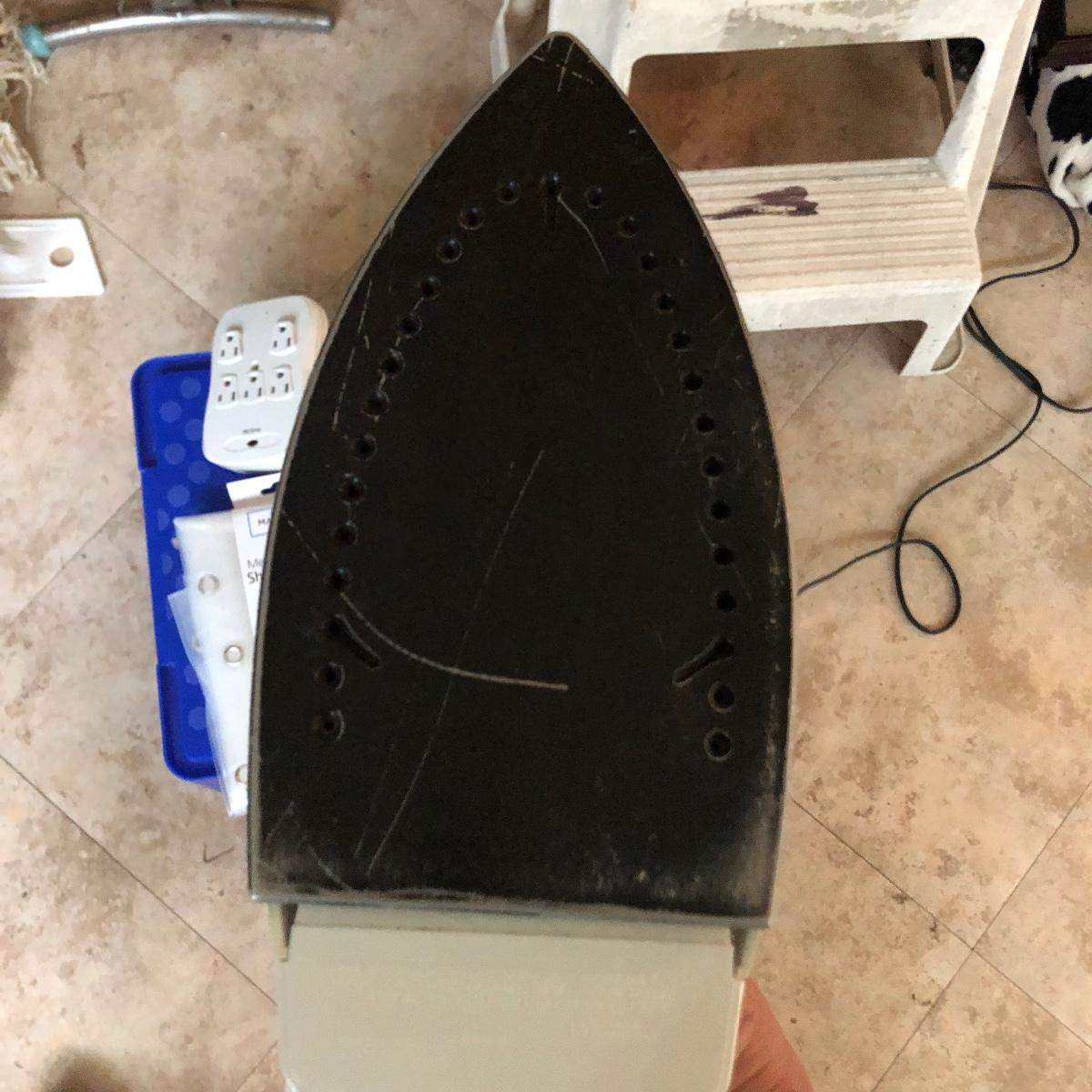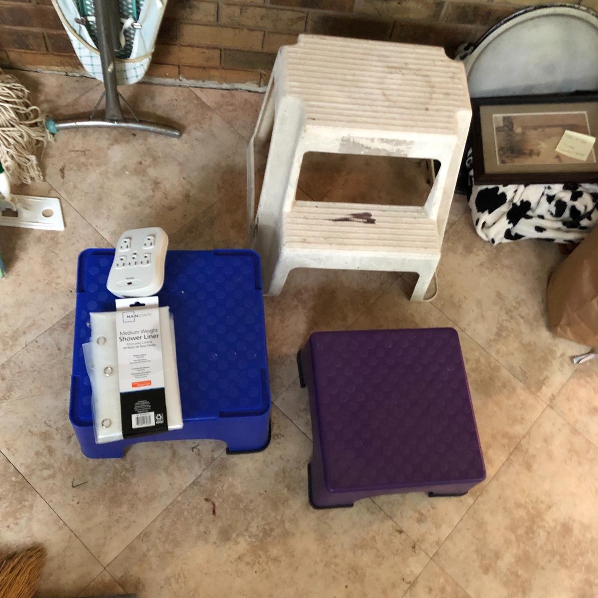 A great assortment of items every household can use. Lot includes a Sunbeam iron, three stools (the largest is about 15.5” x 15.5” x 16” tall) vintage ironing board, brooms, mops, four 24” x 24” square floor mats and more. Iron worked when tested.