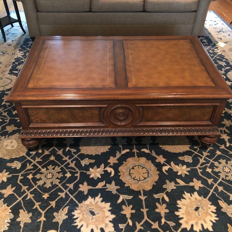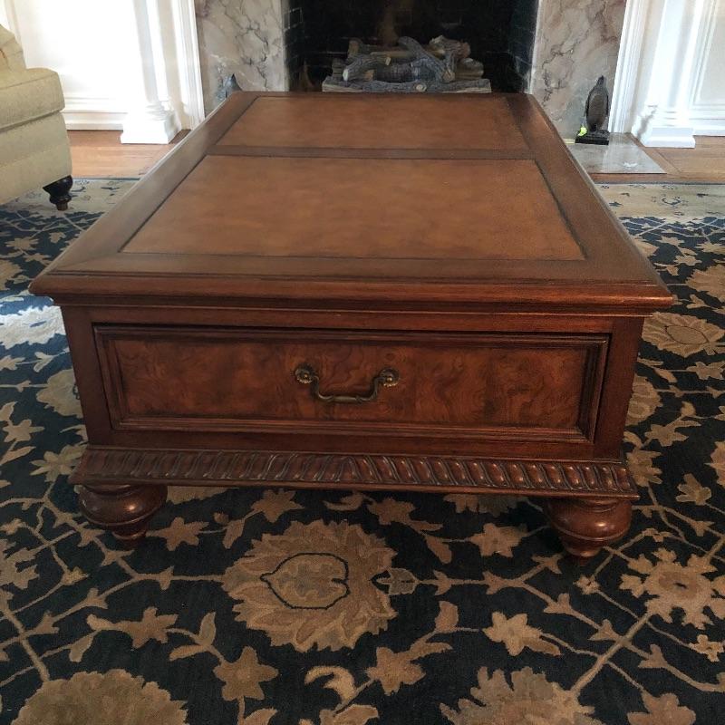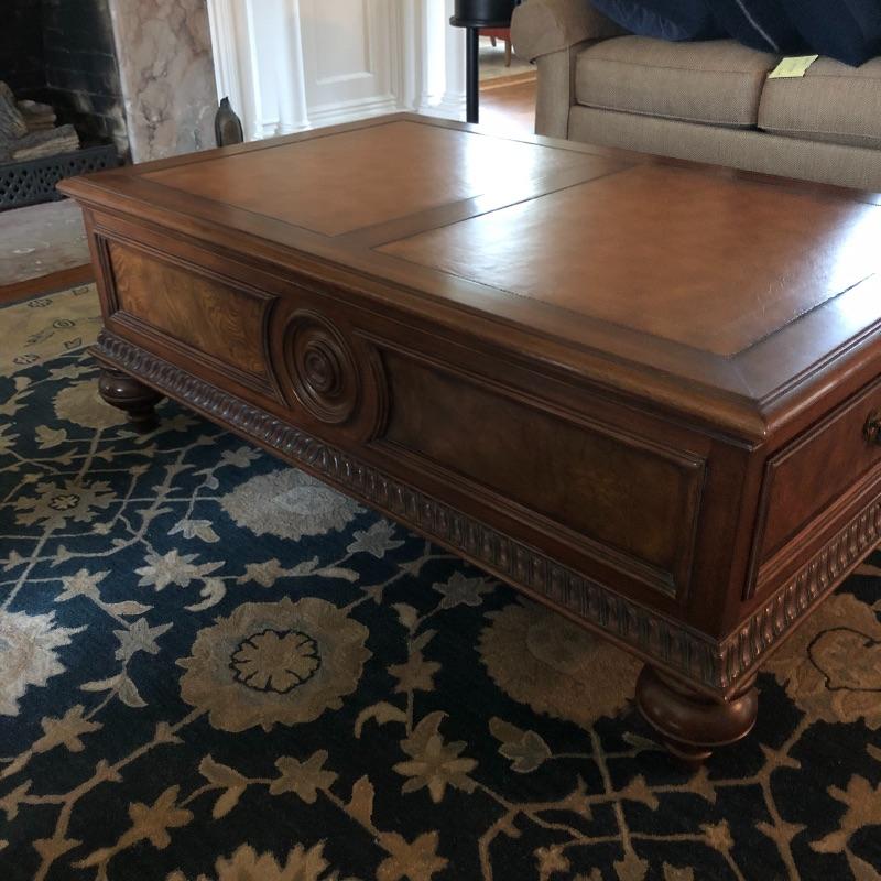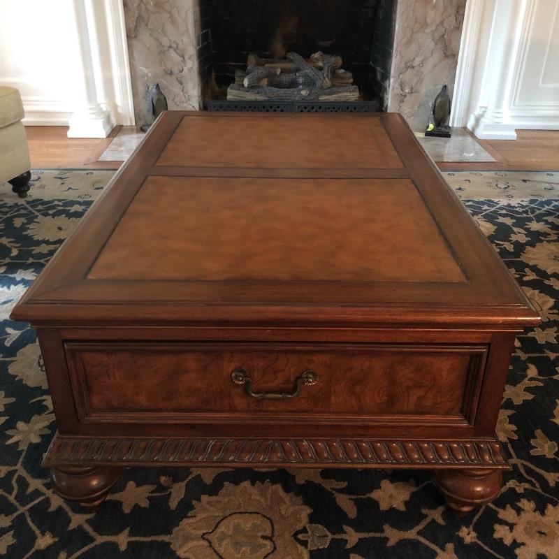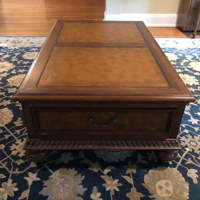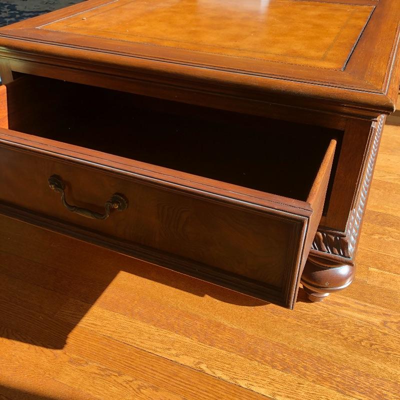 This coffee table is the epitome of a classic with its leather top and deep coloring. Table has one nick on corner, see pictures. Table has dovetailed drawers on ends and embossed leather top. Table measures 31.5” x 50.5” x 19”. Bring help item is substantial and down four steps.