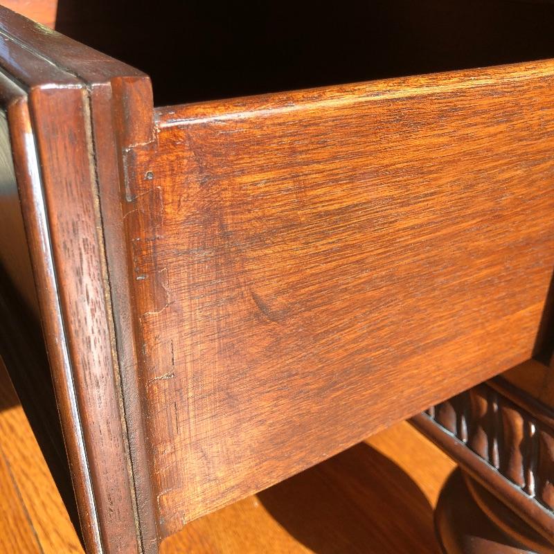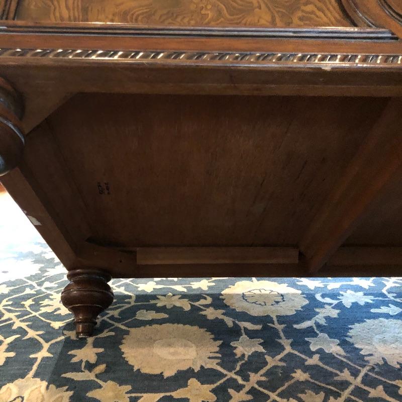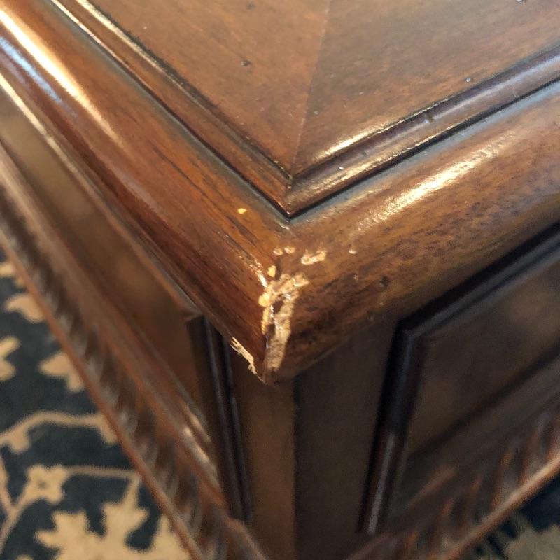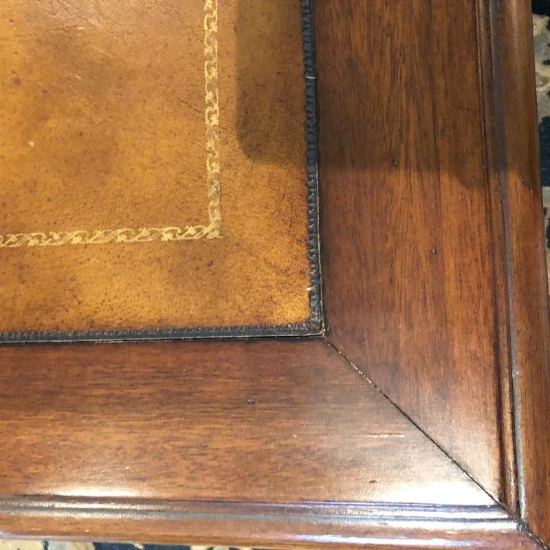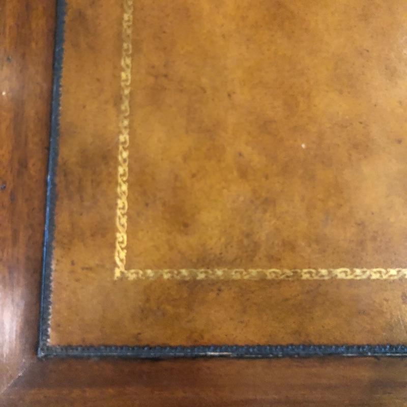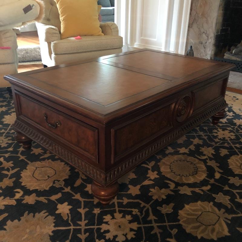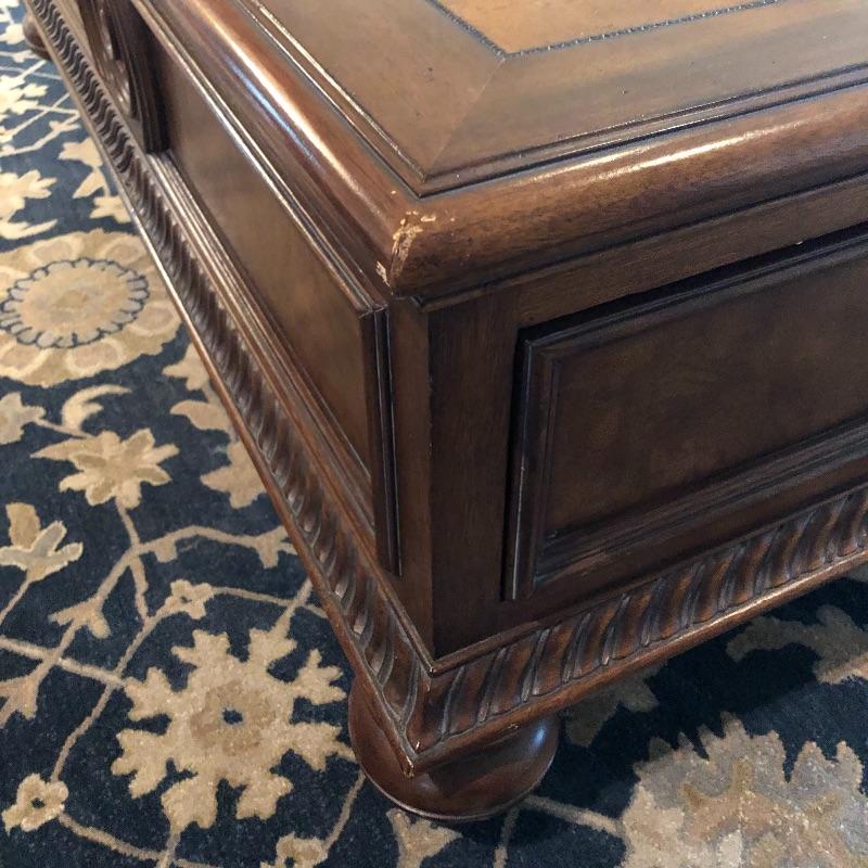 This coffee table is the epitome of a classic with its leather top and deep coloring. Table has one nick on corner, see pictures. Table has dovetailed drawers on ends and embossed leather top. Table measures 31.5” x 50.5” x 19”. Bring help item is substantial and down four steps.