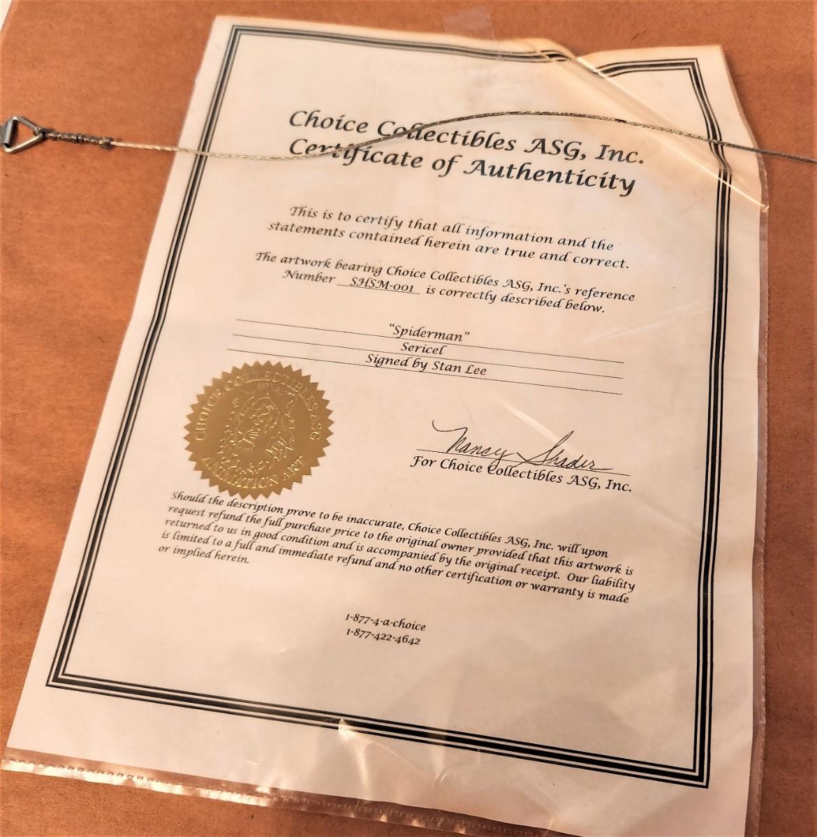 From Choice Collectibles ASG - Spiderman Sericel hand signed by creator Stan Lee. Has seal and Certificate of Authenticity. We checked out Choice Collectibles and they are a reputable gallery that specialized in animation art. Double matted, 17.5" tall, 16" across. Plexiglass front. Piece is numbered: SHSM - 001. Stan Lee died a few years back - so obviously he isn't signing any more.