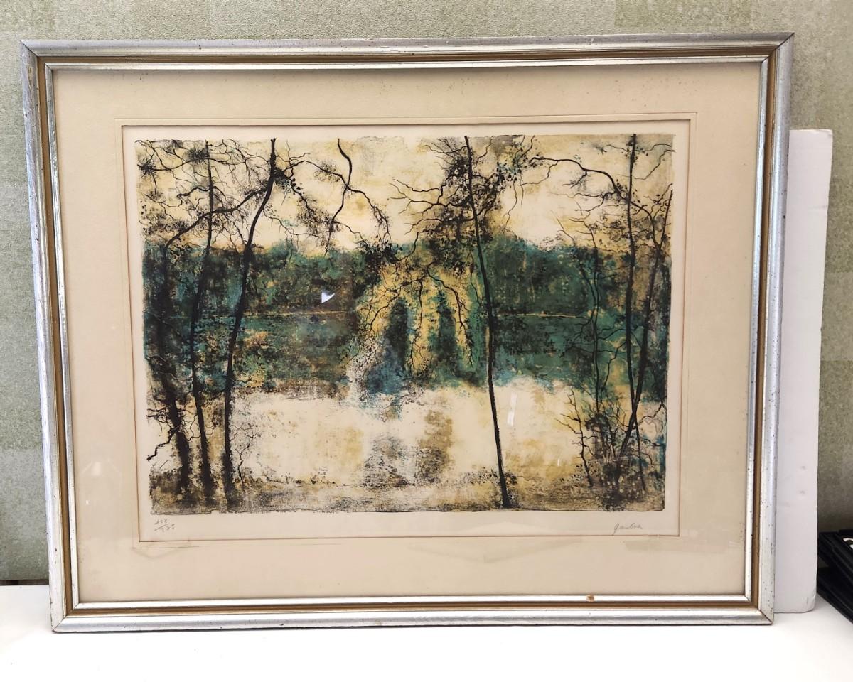 "Winter Lake" - signed/numbered lithograph by listed French landscape artist Bernard Gantner (1928-2018) - nicely matted and framed - 108/275 - 29.5" across, 23.5" tall, .75" deep. One small chip to framed. His work has appeared at various auction houses with regular results in the print category in the $400-600 range. This is a nice example of his work.