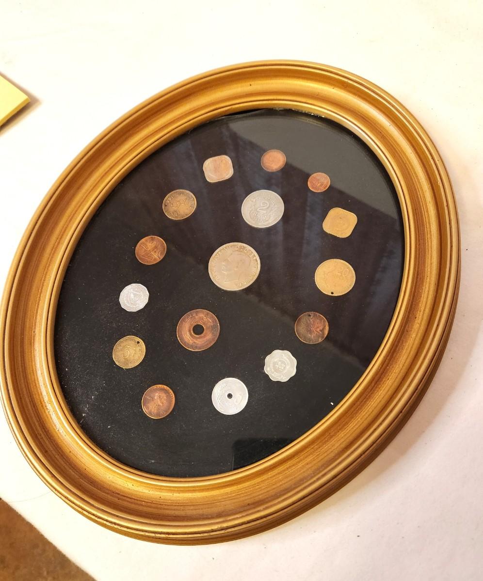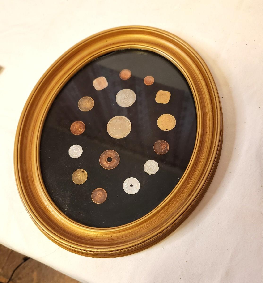 Lot of about 16 Foreign defunct coins in an oval frame - coins from Britain, France, Africa, India, etc. 12" tall.