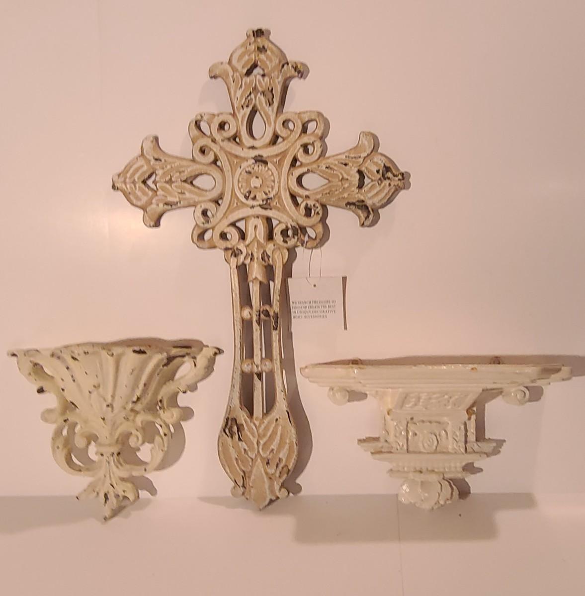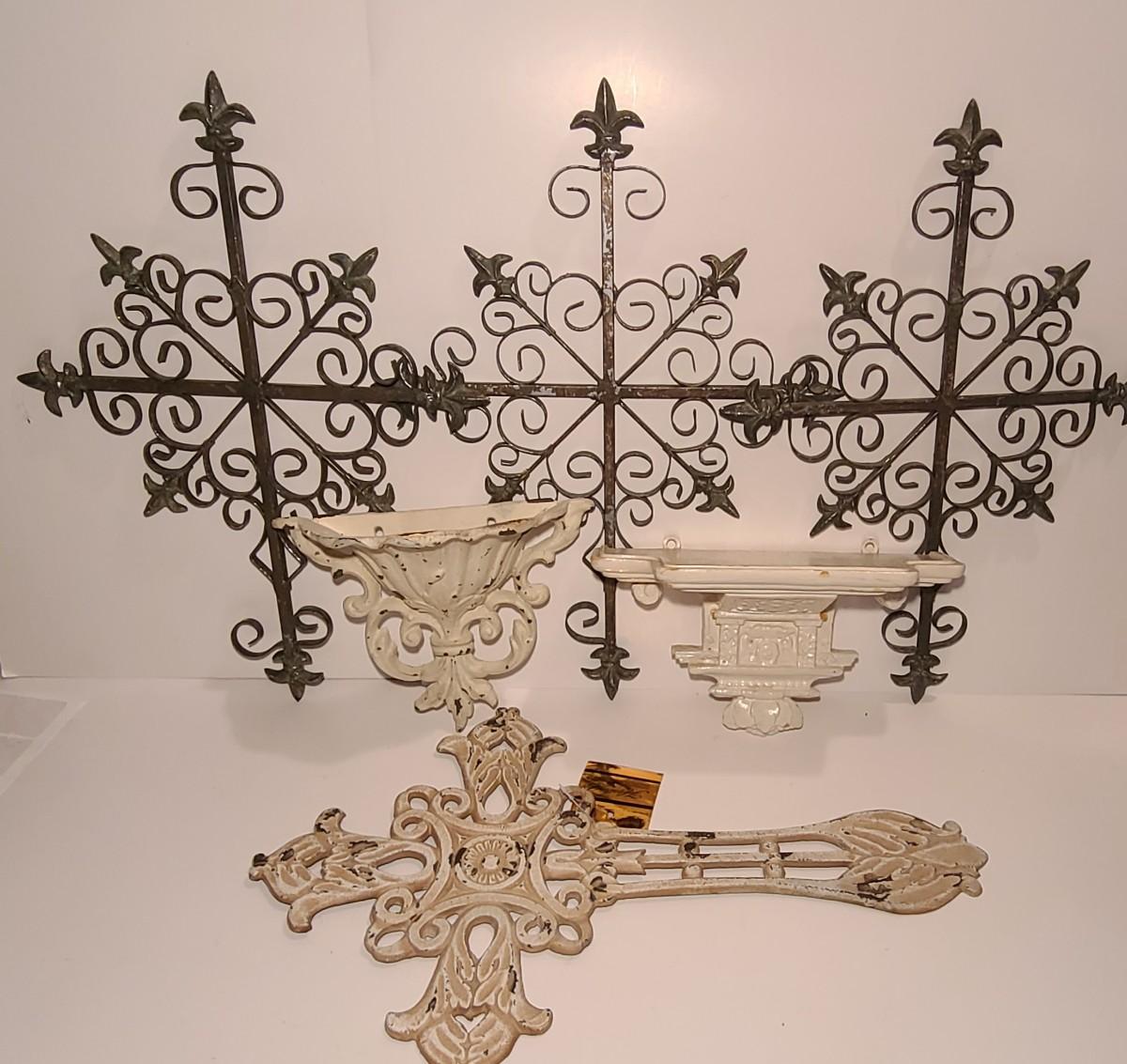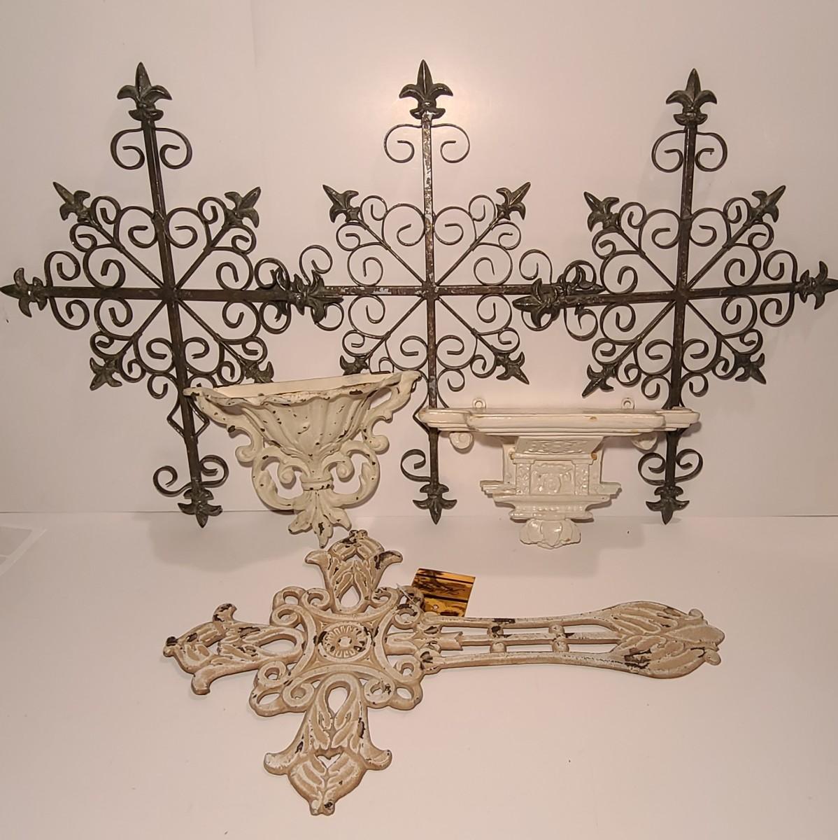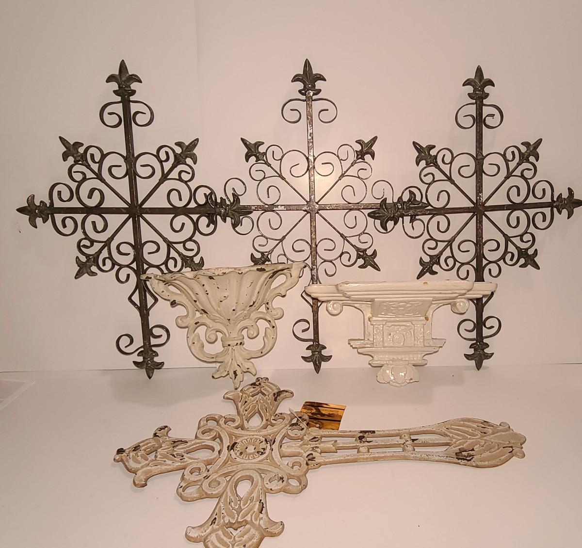 Metal crosses, Metal wall ornaments, metal wall planter, and chalkware shelf; all great for indoors or out. Please see all pictures for content of the lot, condition of the lot, and measurements if taken. Pictures are the best representation of the items listed and items are untested unless indicated in description. Thank you for looking and have fun bidding!