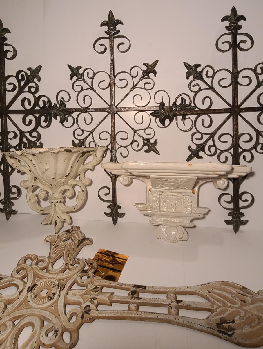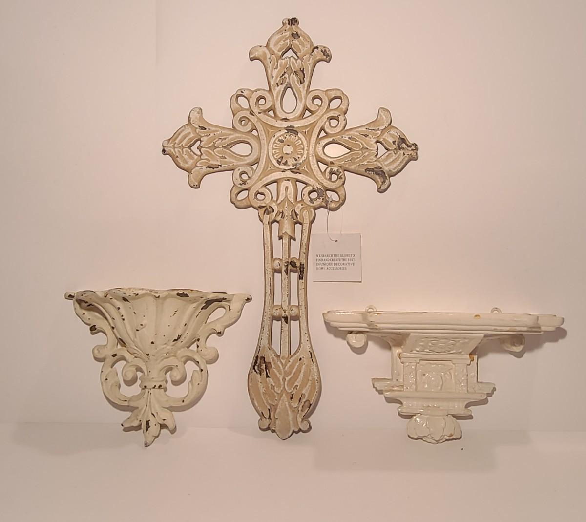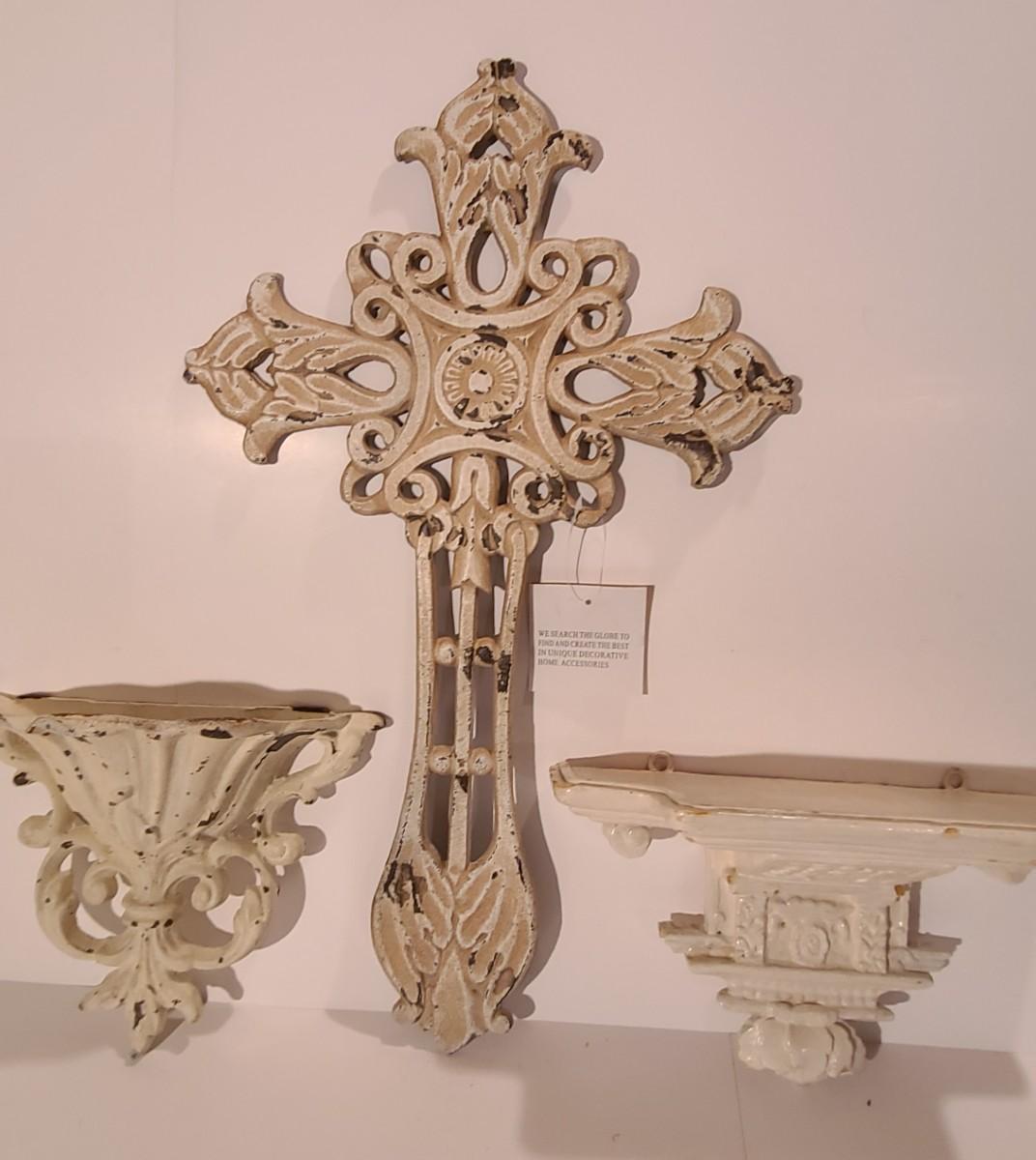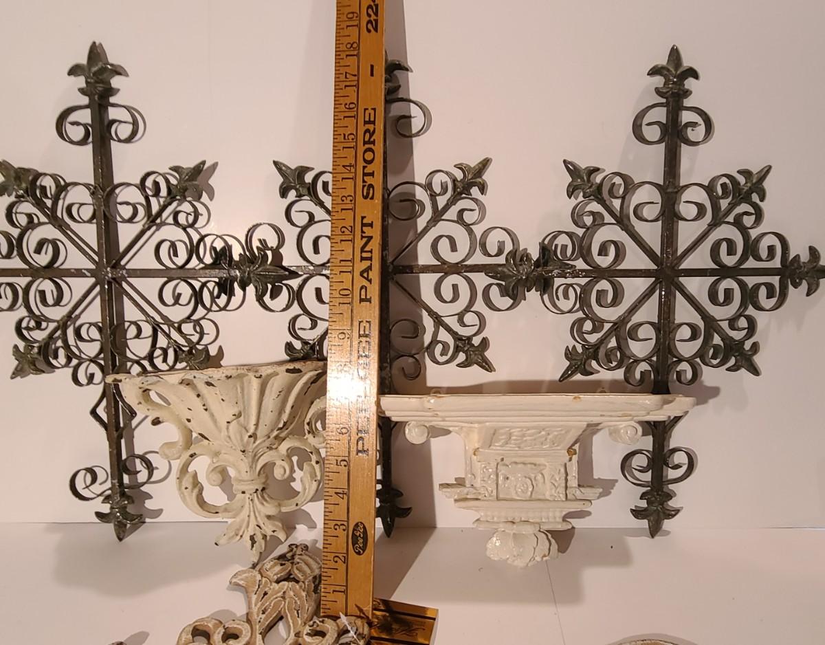 Metal crosses, Metal wall ornaments, metal wall planter, and chalkware shelf; all great for indoors or out. Please see all pictures for content of the lot, condition of the lot, and measurements if taken. Pictures are the best representation of the items listed and items are untested unless indicated in description. Thank you for looking and have fun bidding!