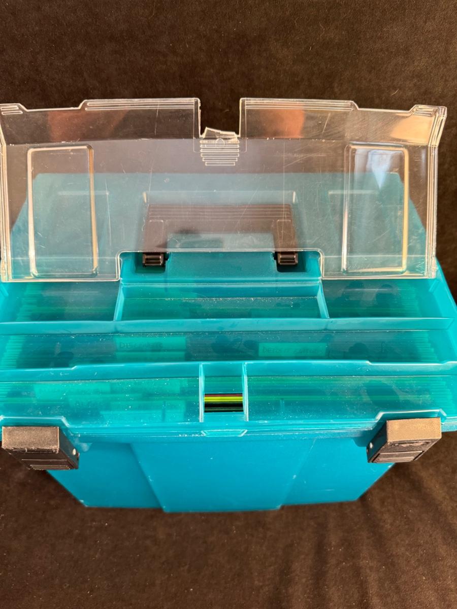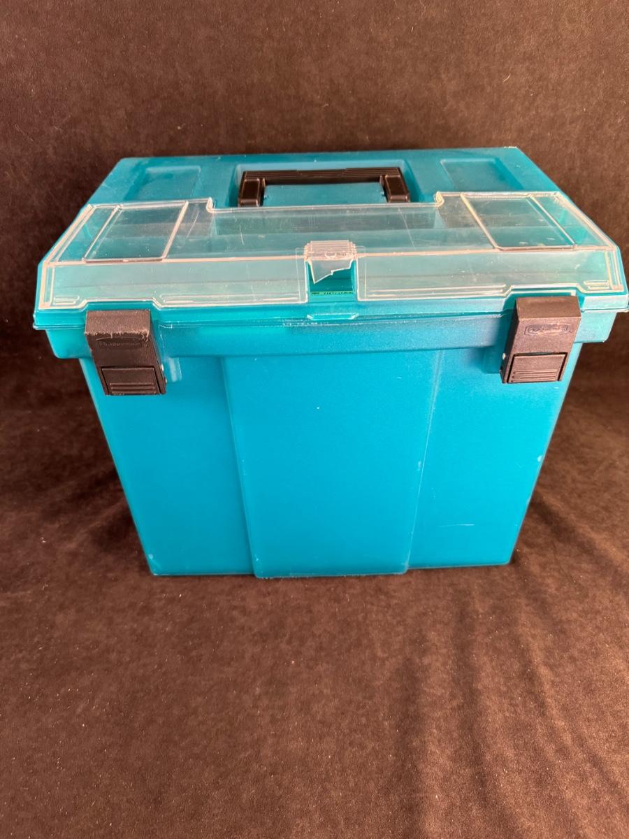 8 1/2” x 11” Dark teal portable file folder with folders. Top has crack in plastic lidded area.
