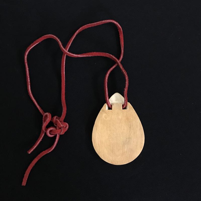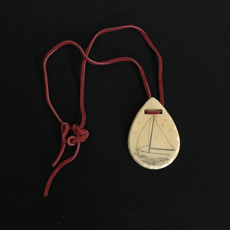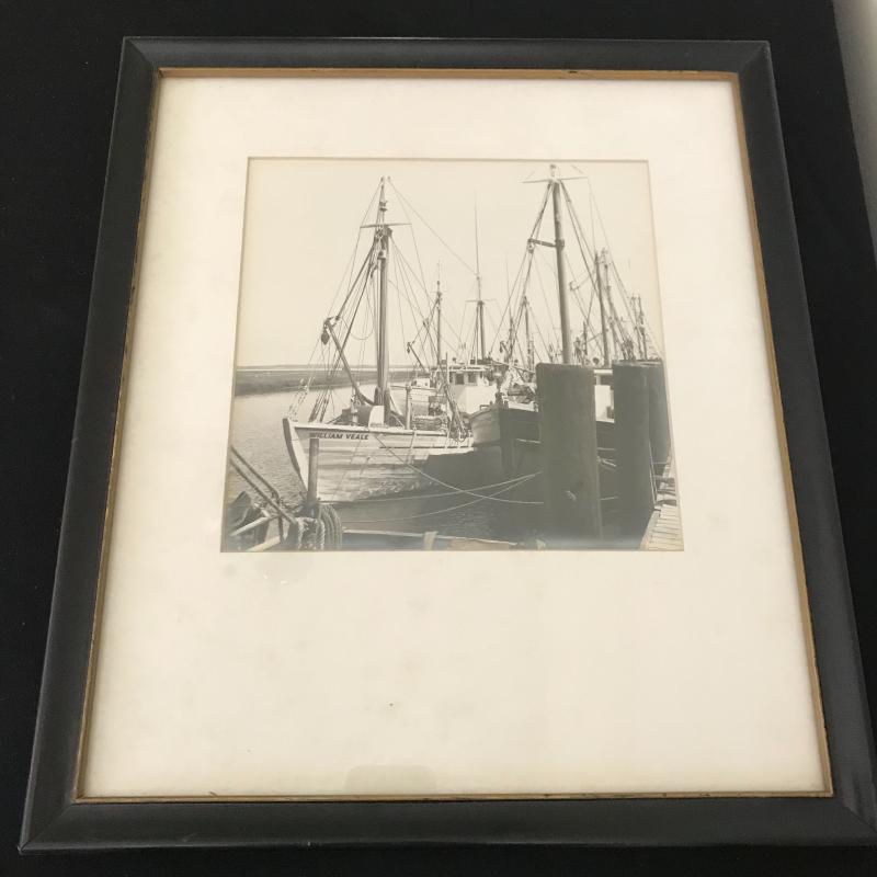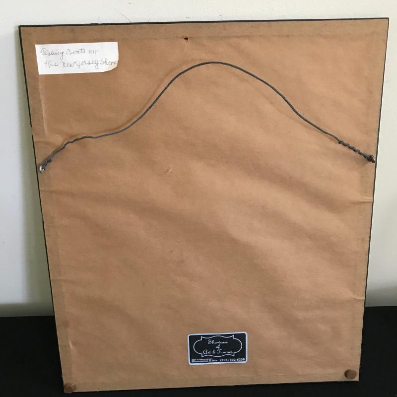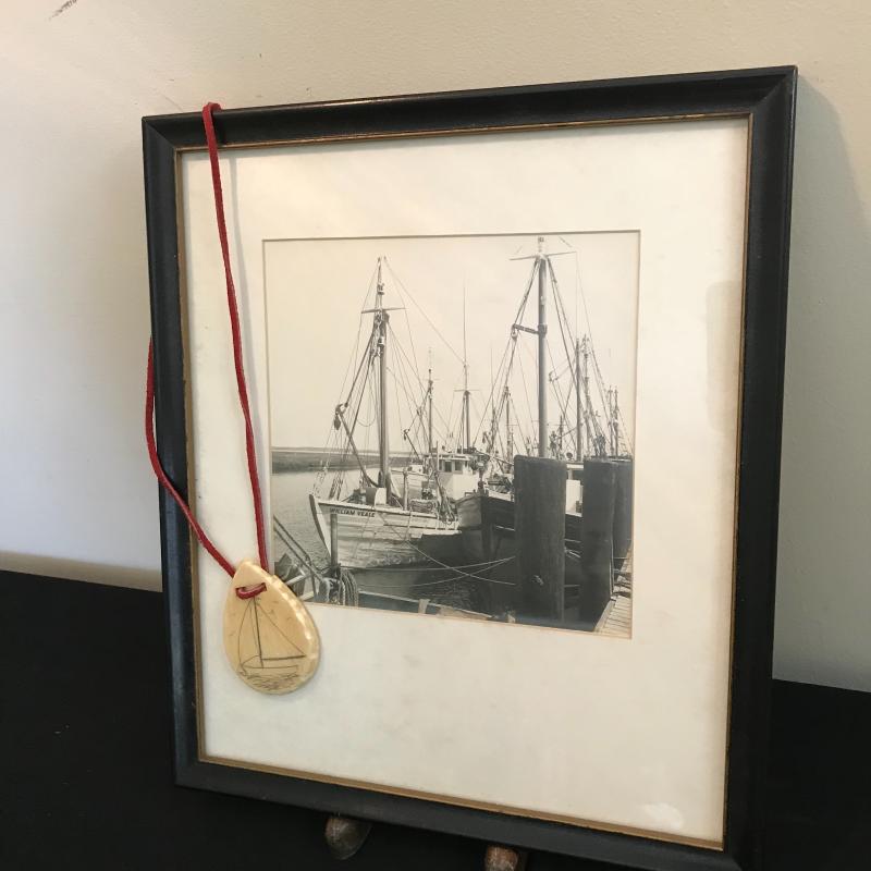 Great print of a fishing boat, label on back states "Fishing Boat on the New Jersey Shore." Frame measures approx. 13” x 15”. Print is accompanied by a carved pendant on a leather string. Shipping available, please call UPS for a quote prior to bidding.