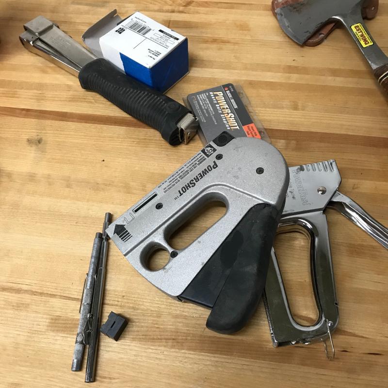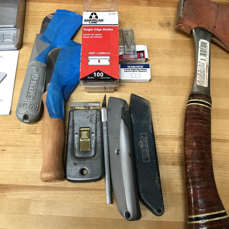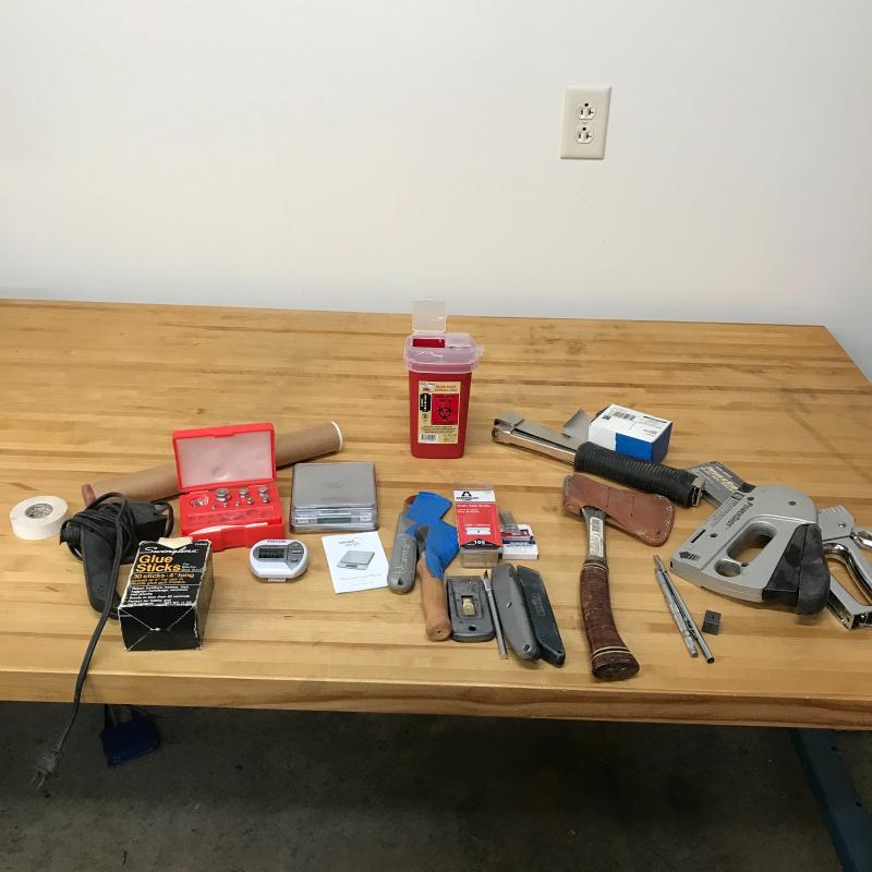 Smart scale and weight set, xacto, box cutters, Estwing hatchet, staple guns, glue guns, magnets, sharps container and more. Lot available for local pick up in Asheville, NC only.