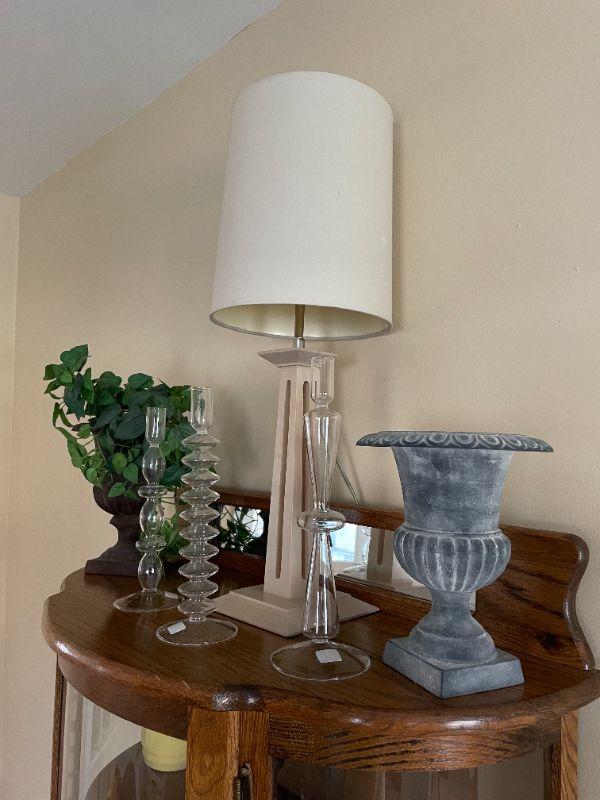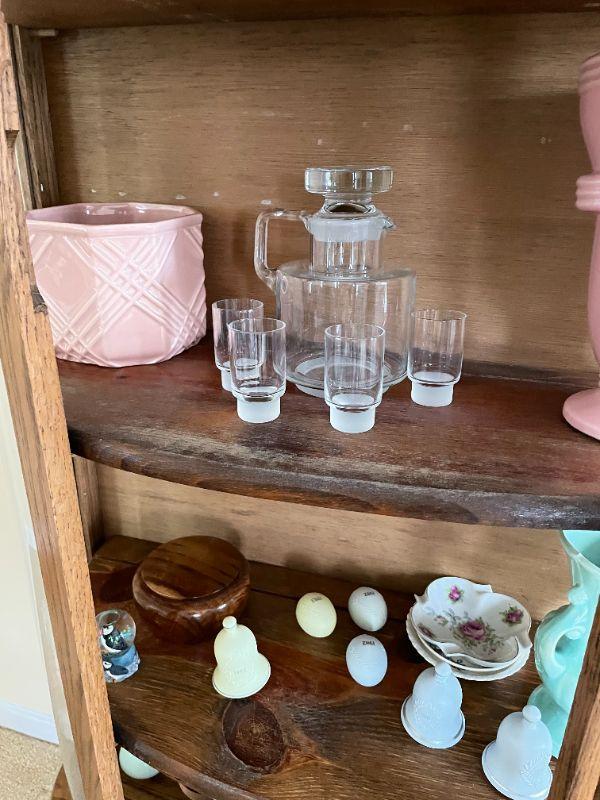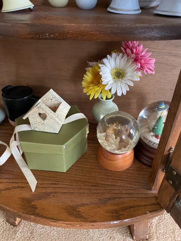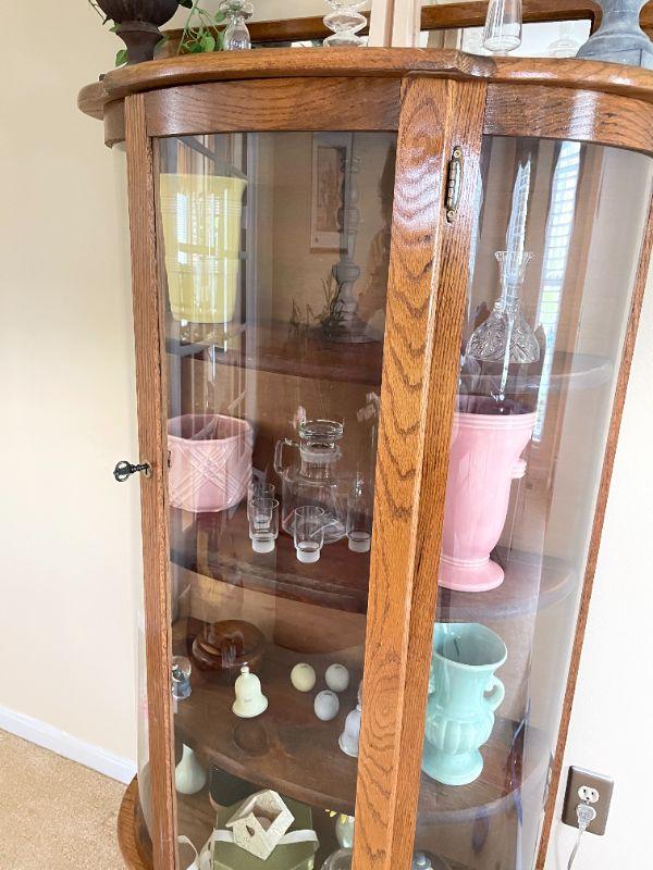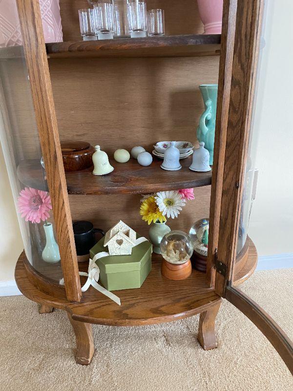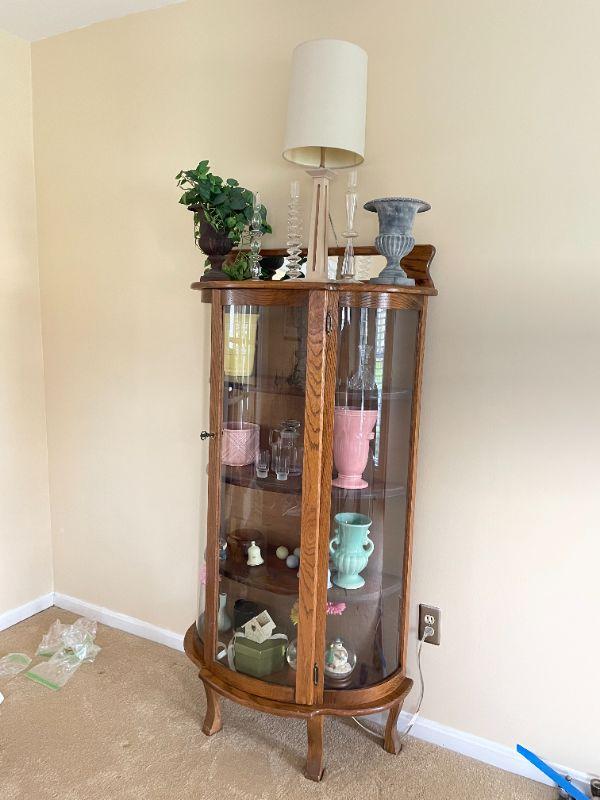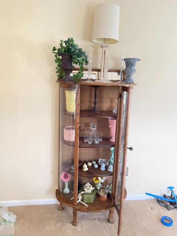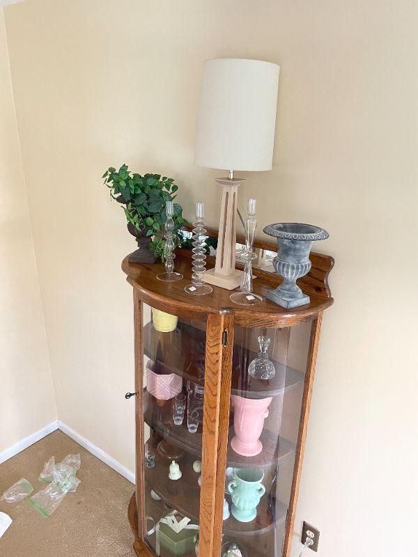 Solid wood showcase (62 1/2'' tall x 29 1/2'' L x 12'' W) includes key for lock, Russian crystal vodka set, (2) flower decor pieces, (4) candle holders.