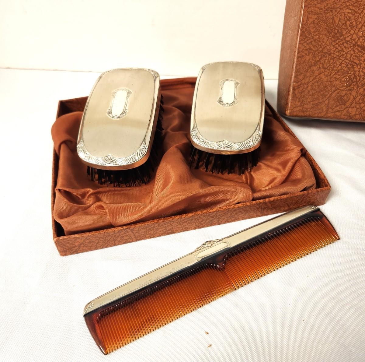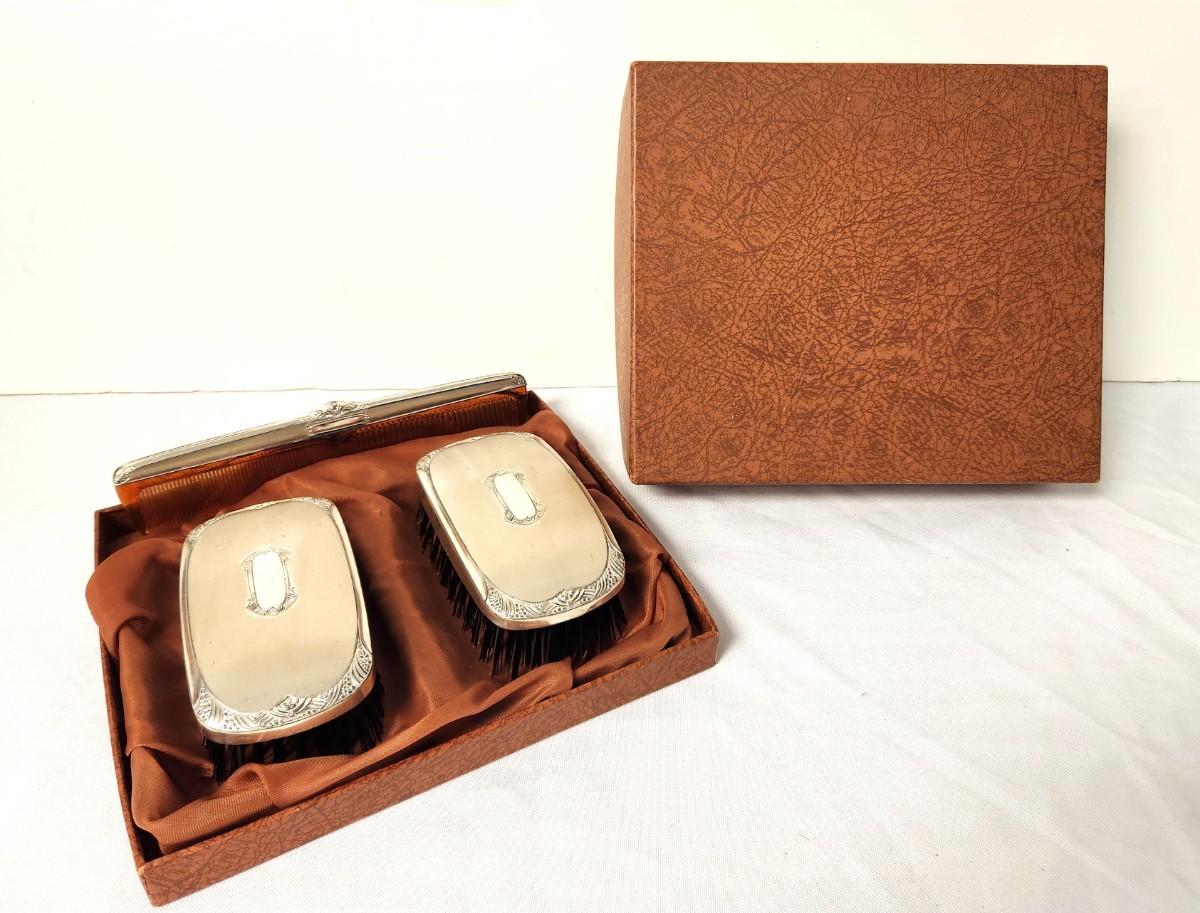 Nice vintage Sterling Silver-backed (marked) men's brush set with comb - original box. Appears unused. Brushes are 4.5" long.