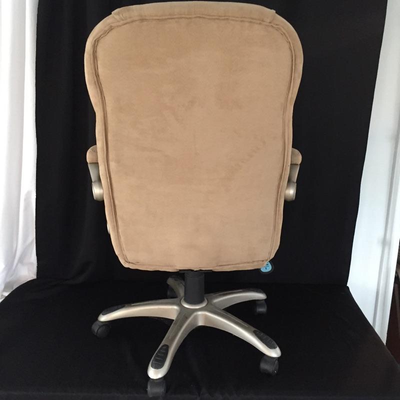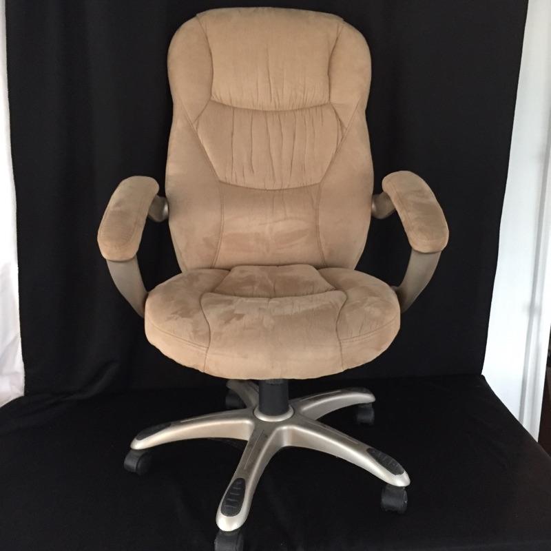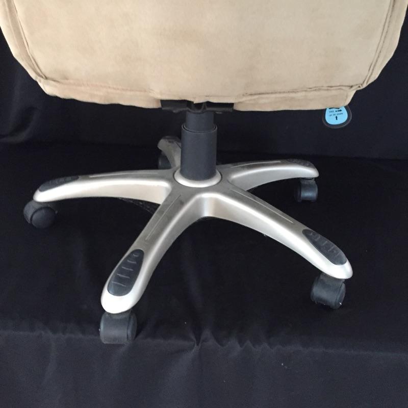 Adjustable suede office chair in neutral color. Great for the cold days when you don’t want to lean back on cold leather. Chair measures 26” x 23” x 46” tall full extended. Seat height is adjustable.