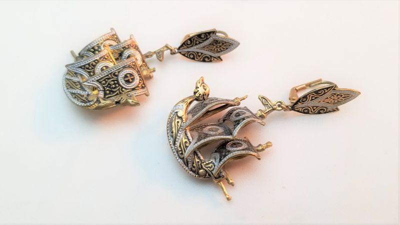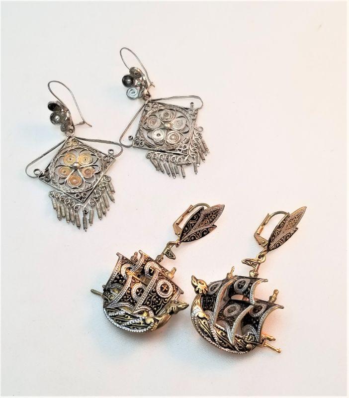 Two pairs of Ethnic Earrings, as shown. The first is a pair of artisan handmade pierced earrings (2.25" long) and the other is a pair of Damascene "ship" earrings (clips - 2.25" long). Both in good vintage condition.