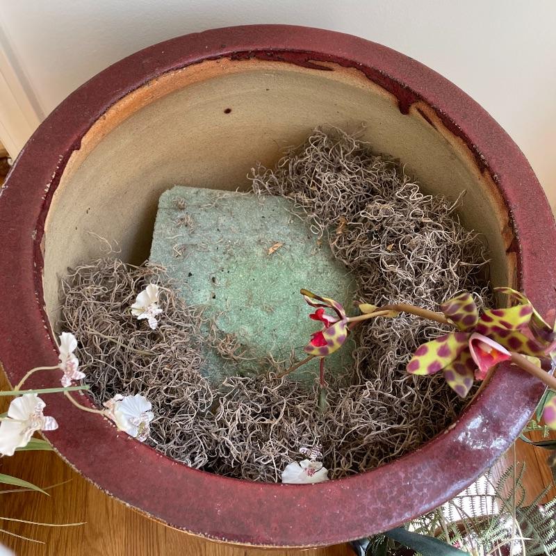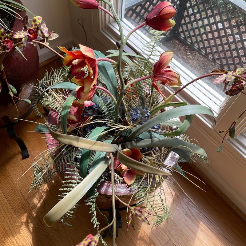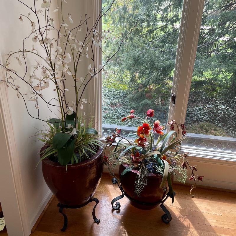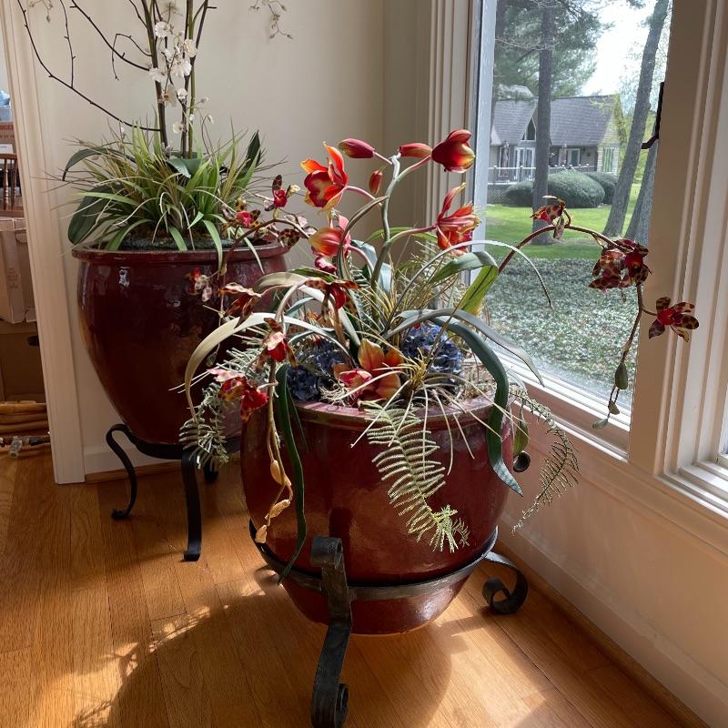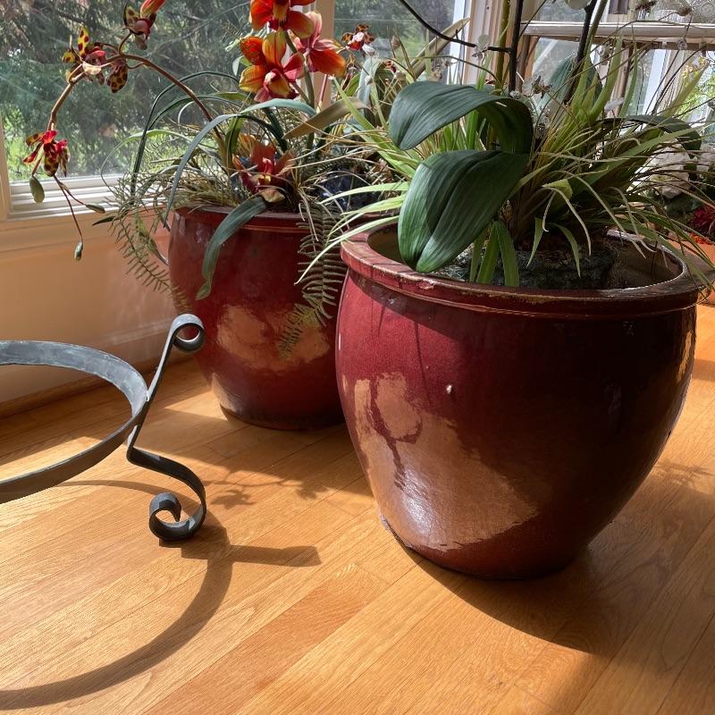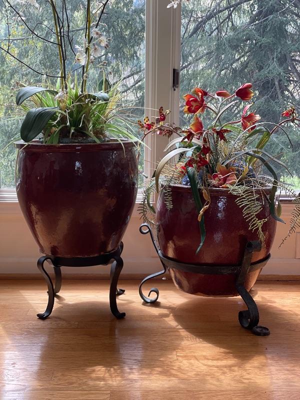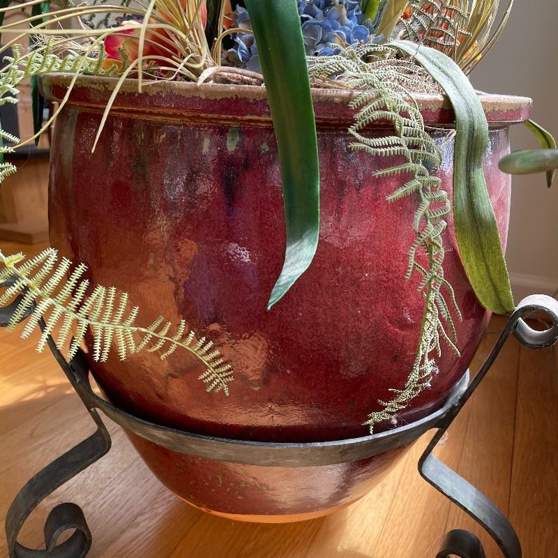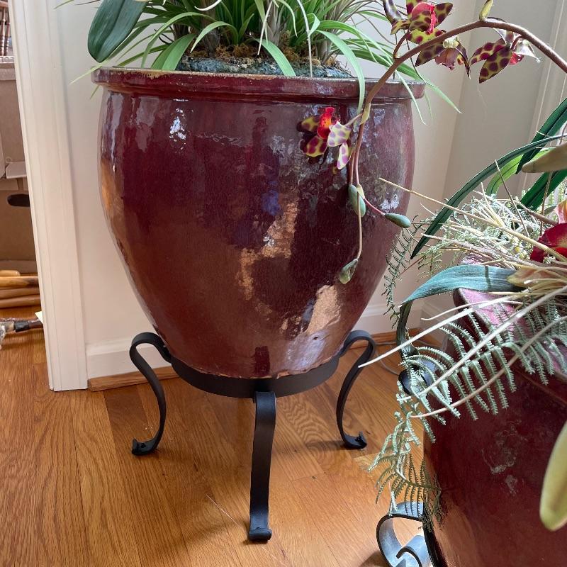 Two ceramic garden planters styled with some beautifully designed faux floral for permanent beauty. These planters were probably made for the outdoors or real soil if you prefer living plants. They have a deep crimson color and appear to be in excellent shape. The larger planter is about 16”d x 14” without its 8” tall stand. See photos. Local pick up only.
