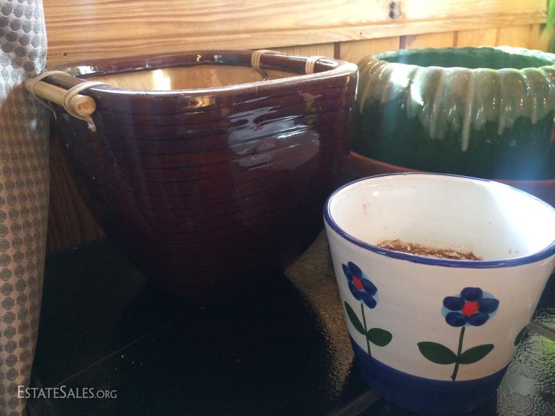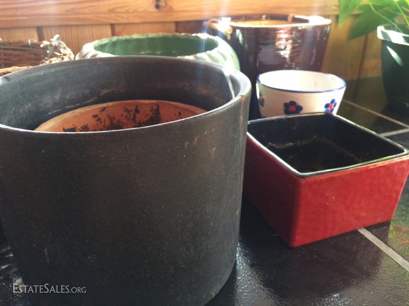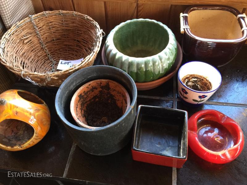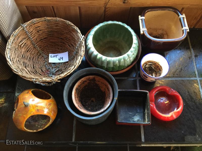 10 misc planters, pots, bird feeder, hanging basket, etc