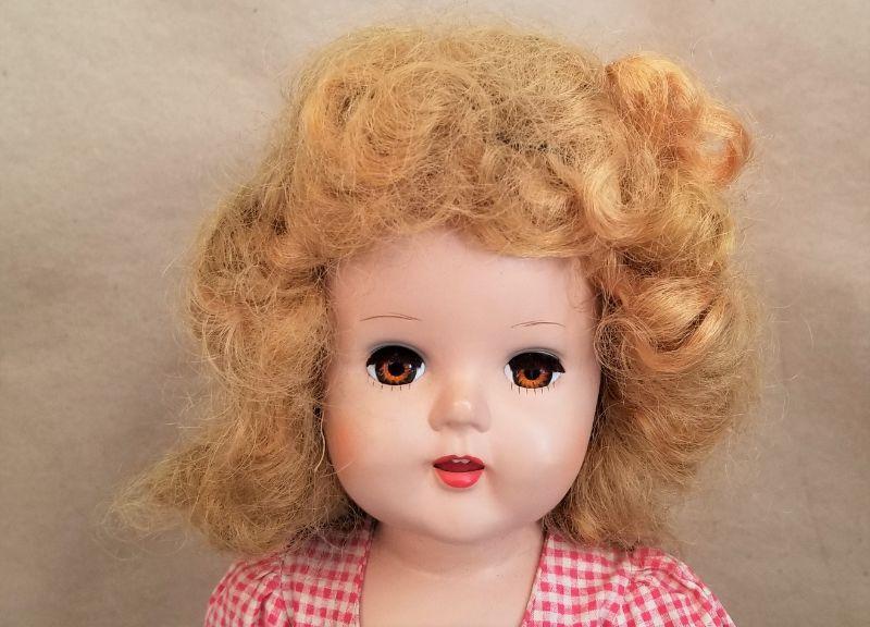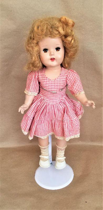 This vintage composition doll is in great condition and she is dressed in what I believe are the original clothes. She stands about 20 inches tall without the stand. Stand is included. From about the 1940's.