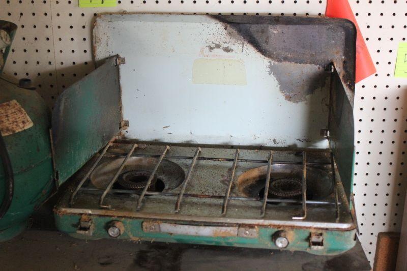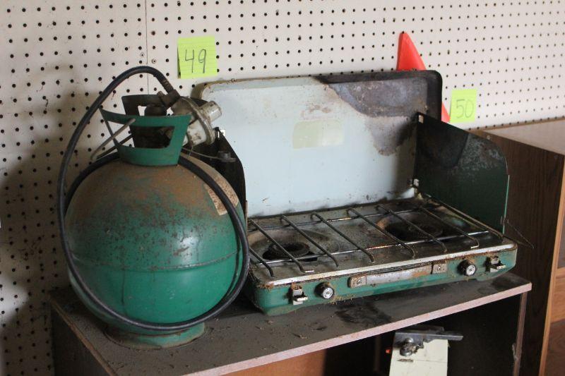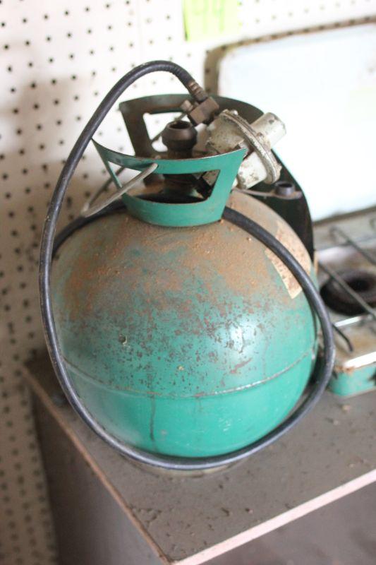 Lot 49 Vintage Green Camping Stove & Propane Tank