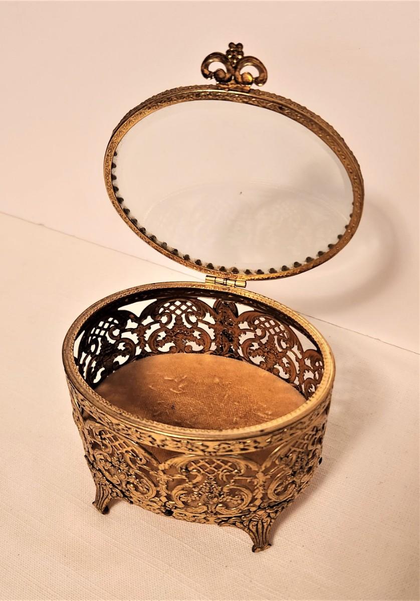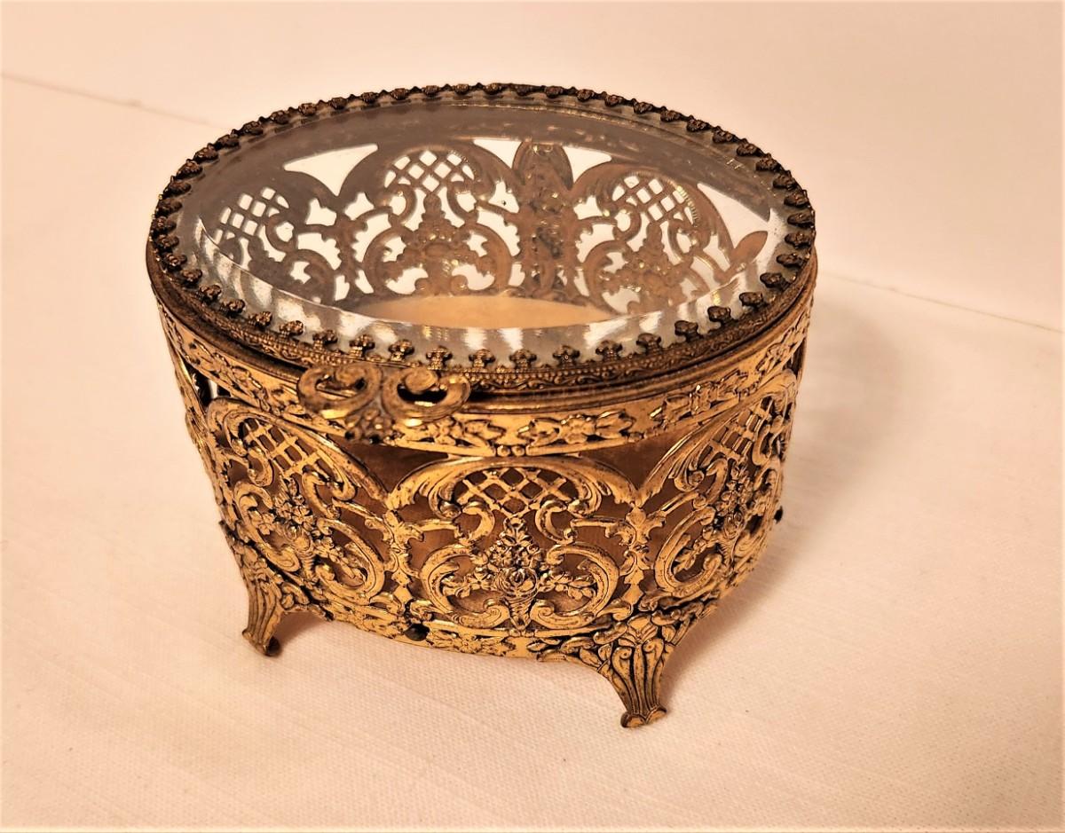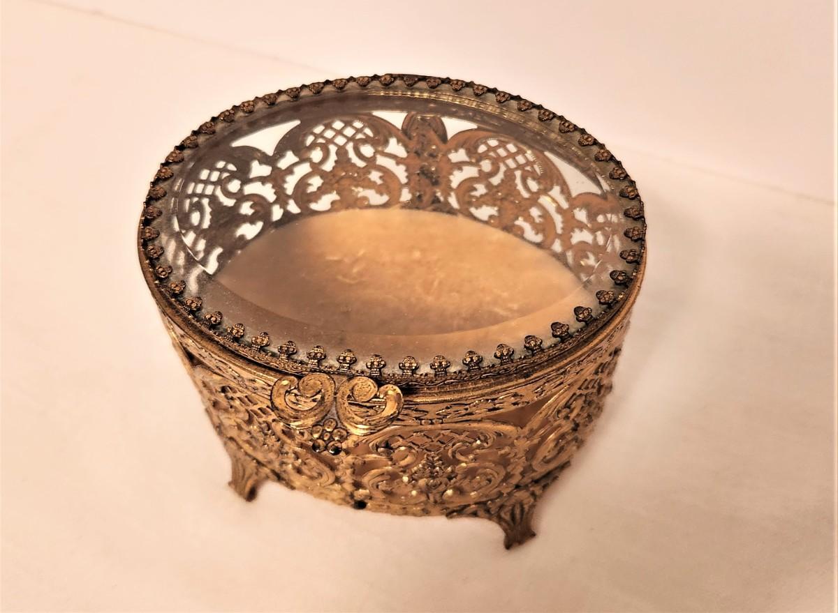 Sweet gold-tone jewelry/trinket box with beveled glass top, oval shape. 4.5" across, 3.25" tall. Good vintage condition.