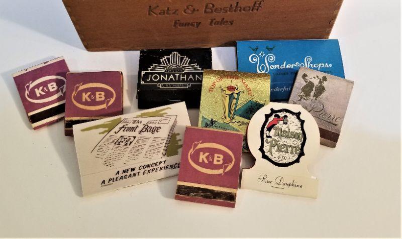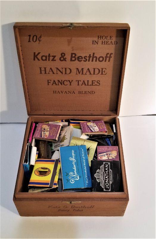 Attic find! Cool vintage Katz & Besthoff (K&B) wooden Havana Blend cigar box - filled with vintage matchbook covers. Some are New Orleans-related, as shown. Box measures about 7.5" x 7" x 3.5".