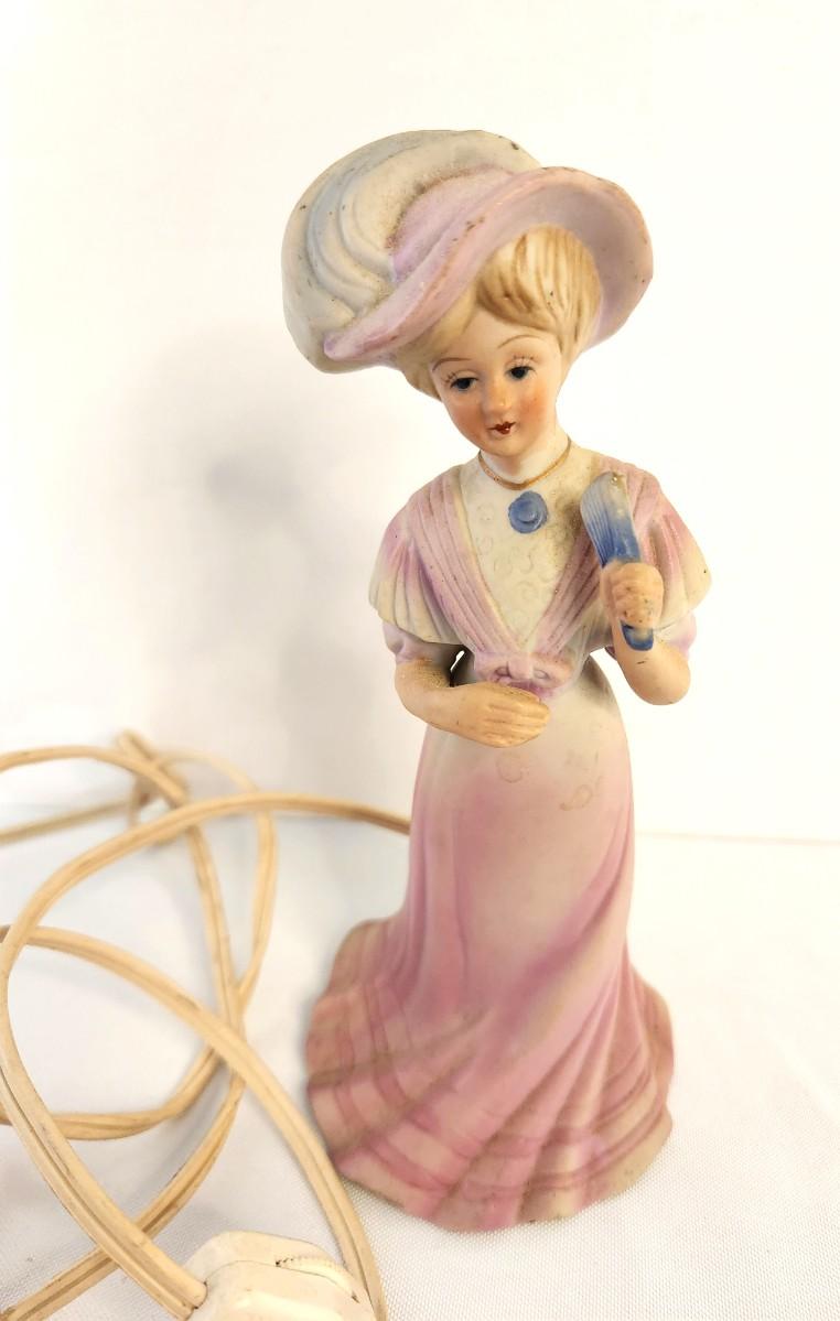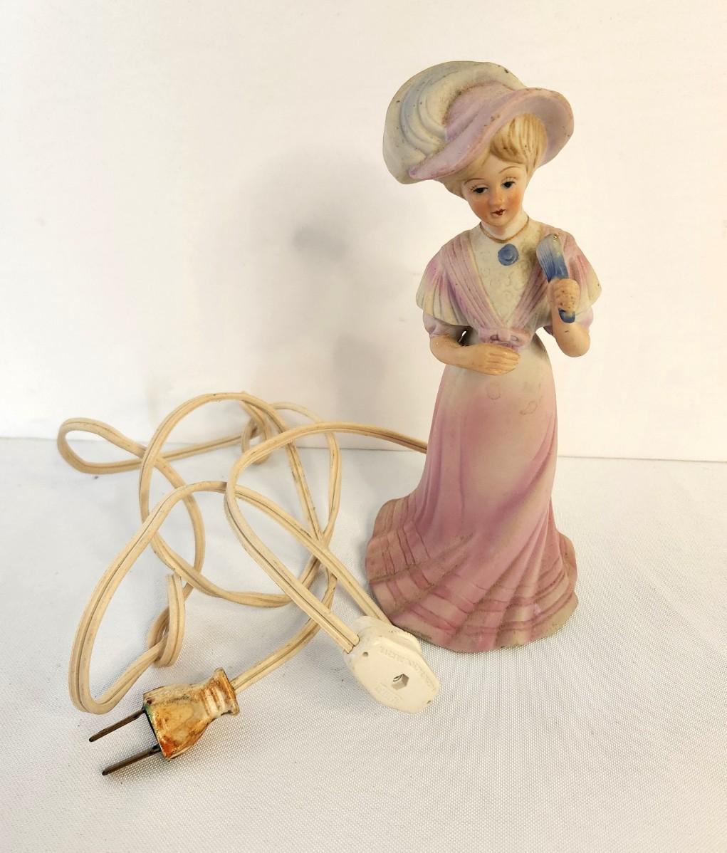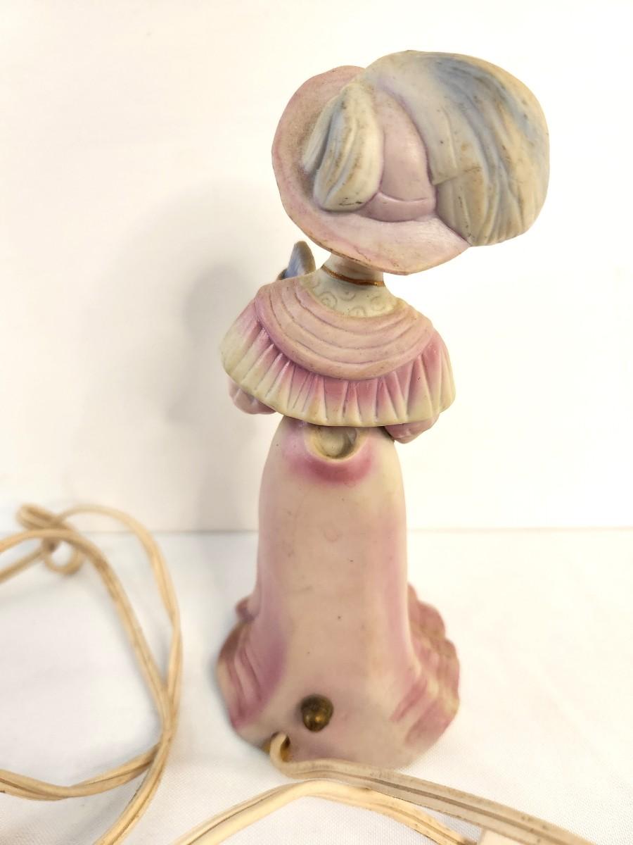 You don't see many of these anymore - cute bisque porcelain perfume lamp/nightlight - works. You put a few drops of your favorite scent in the little well in the back, turn it on, and the low voltage nightlight will waft the scent through the room Very collectible. Good condition. 7" tall.