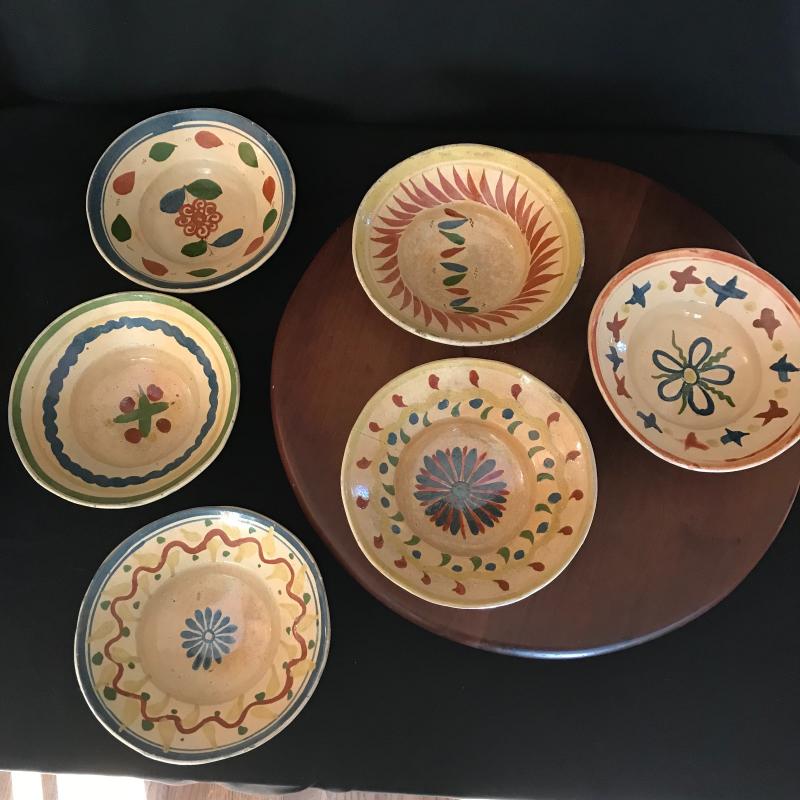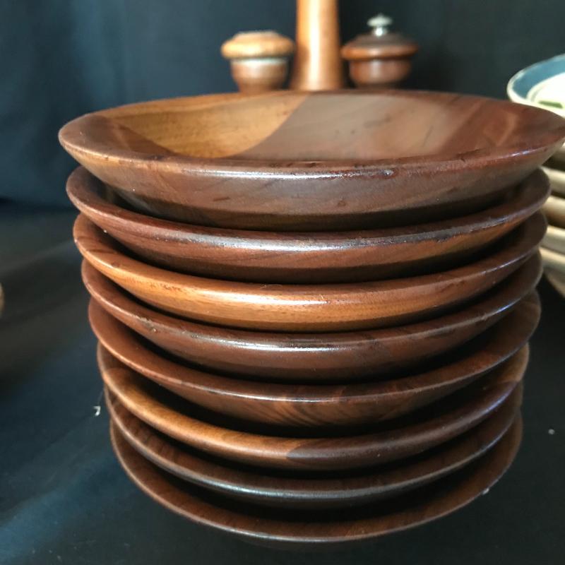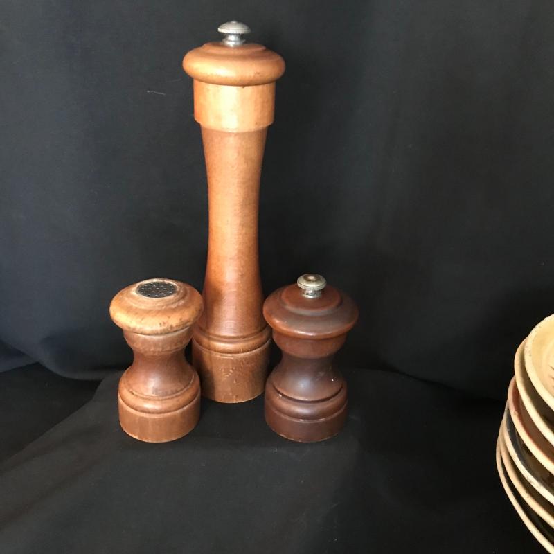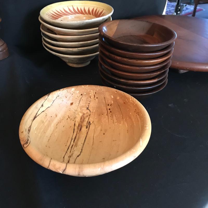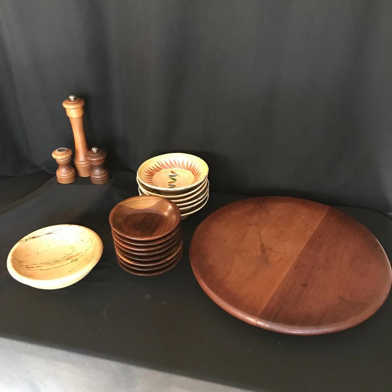6 handmade Mexican bowls with different designs but same size and all matching. Glazing only on the insides. 8 wooden salad bowls. One wooden birch bowl, wood lazy Susan measures 17” in diameter. Also includes two pepper mills and a salt shaker. This lot is available for shipping or local pick up in Flat Rock, NC.
