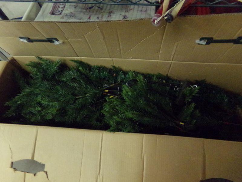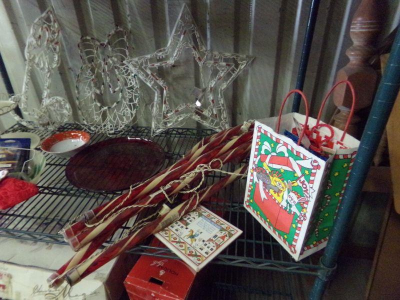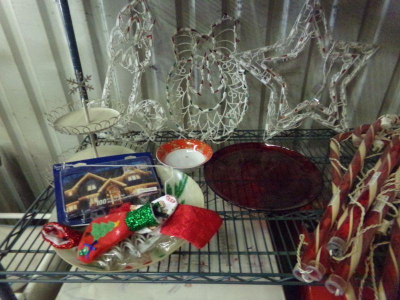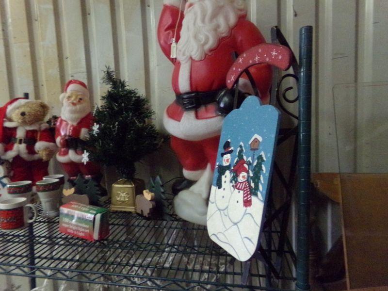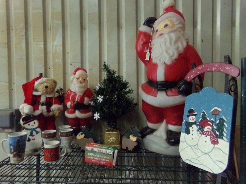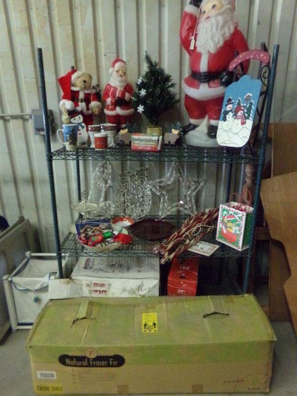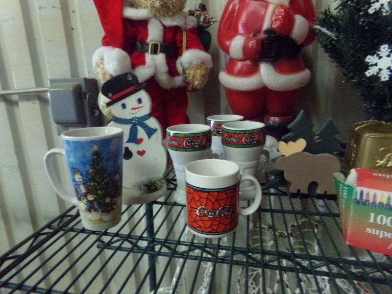7" FRASER FIR CHRISTMAS TREE, SMALL TREE, XMAS COKE MUGS, SLED, PLASTIC SANTA, X-MAS BEAR, 2-WOODEN CARVED DEER, LIT STAR/WREATH/CANDLE, BOWL & SERVING PLATE