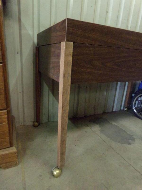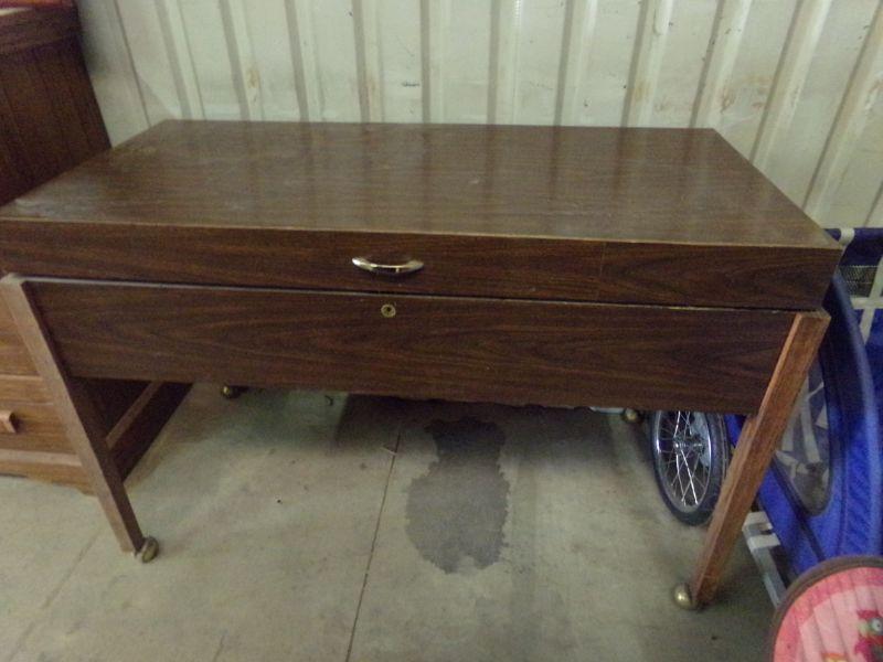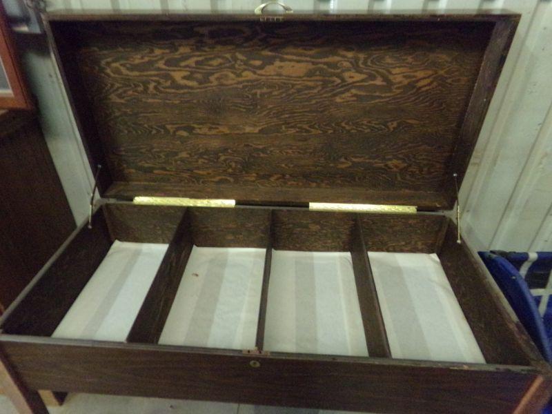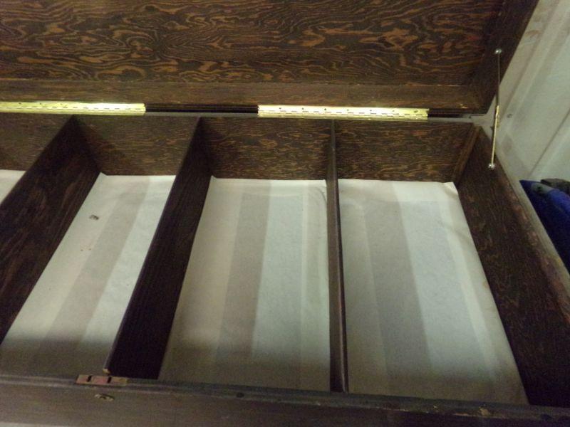 HINGED TOP LIFTS UP ON THIS TABLE AND INSIDE IS SECTIONED INTO 4 PARTS