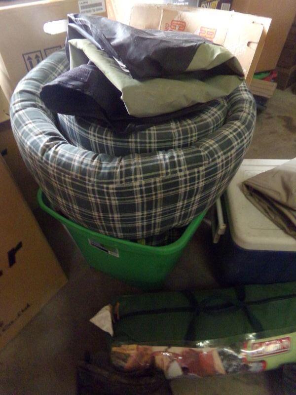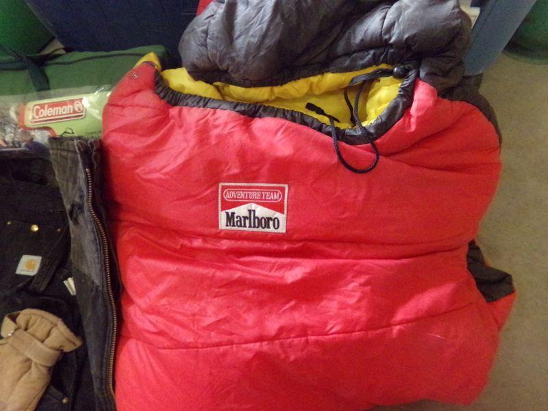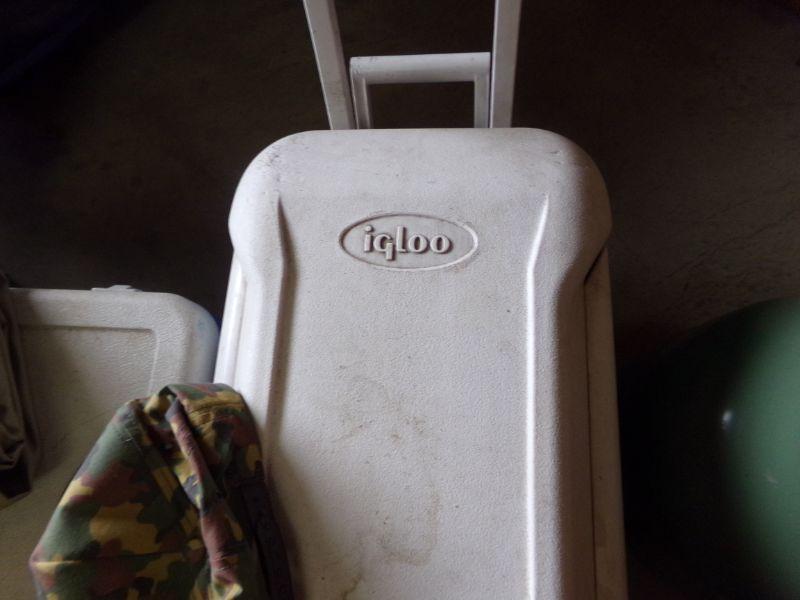 TWO COOLERS, AIR MATTRESS, SLEEPING BAGS, GLOVES, COVERALLS , PROPANE TANK, CAMOURFLAGE CAP,