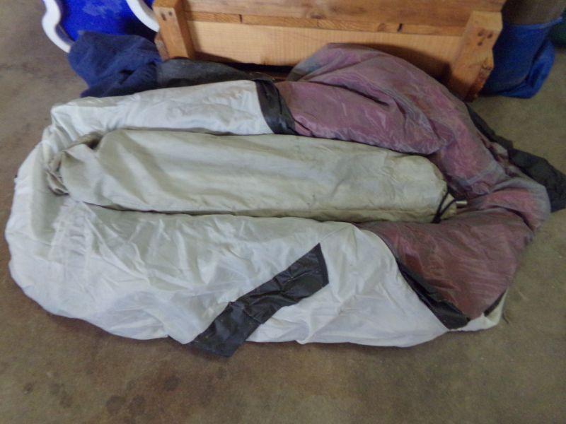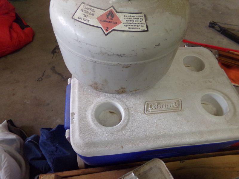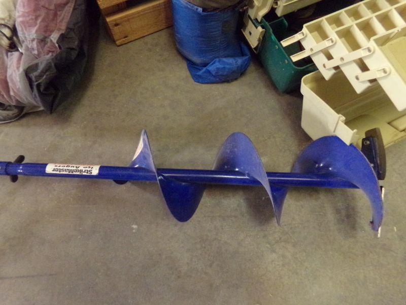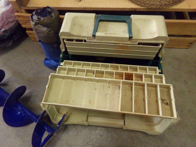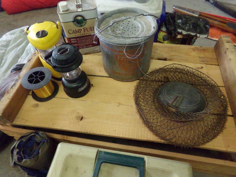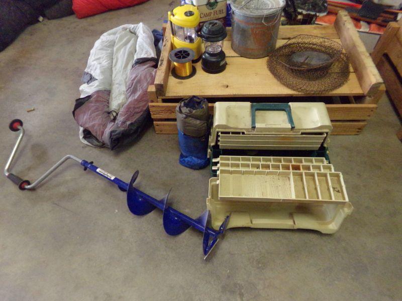 HAND HELD AUGER, WIRE, LANTERNS, TARP, BUCKET, FISH NET, CAMP FUEL TACKLE BOX,