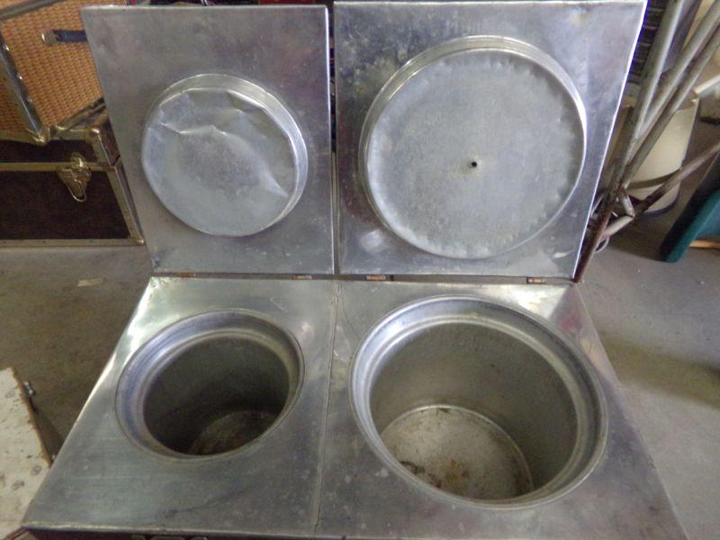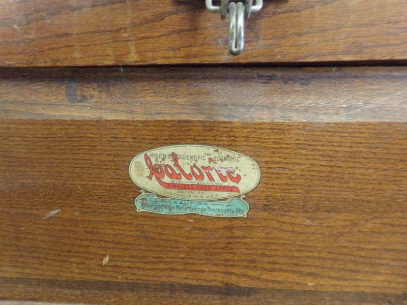 FIRELESS COOK STOVE, ROYAL CREST ICEBOX. BROWN COOK STOVE MEASURES 15"H x 26-1/2"W x 15" D