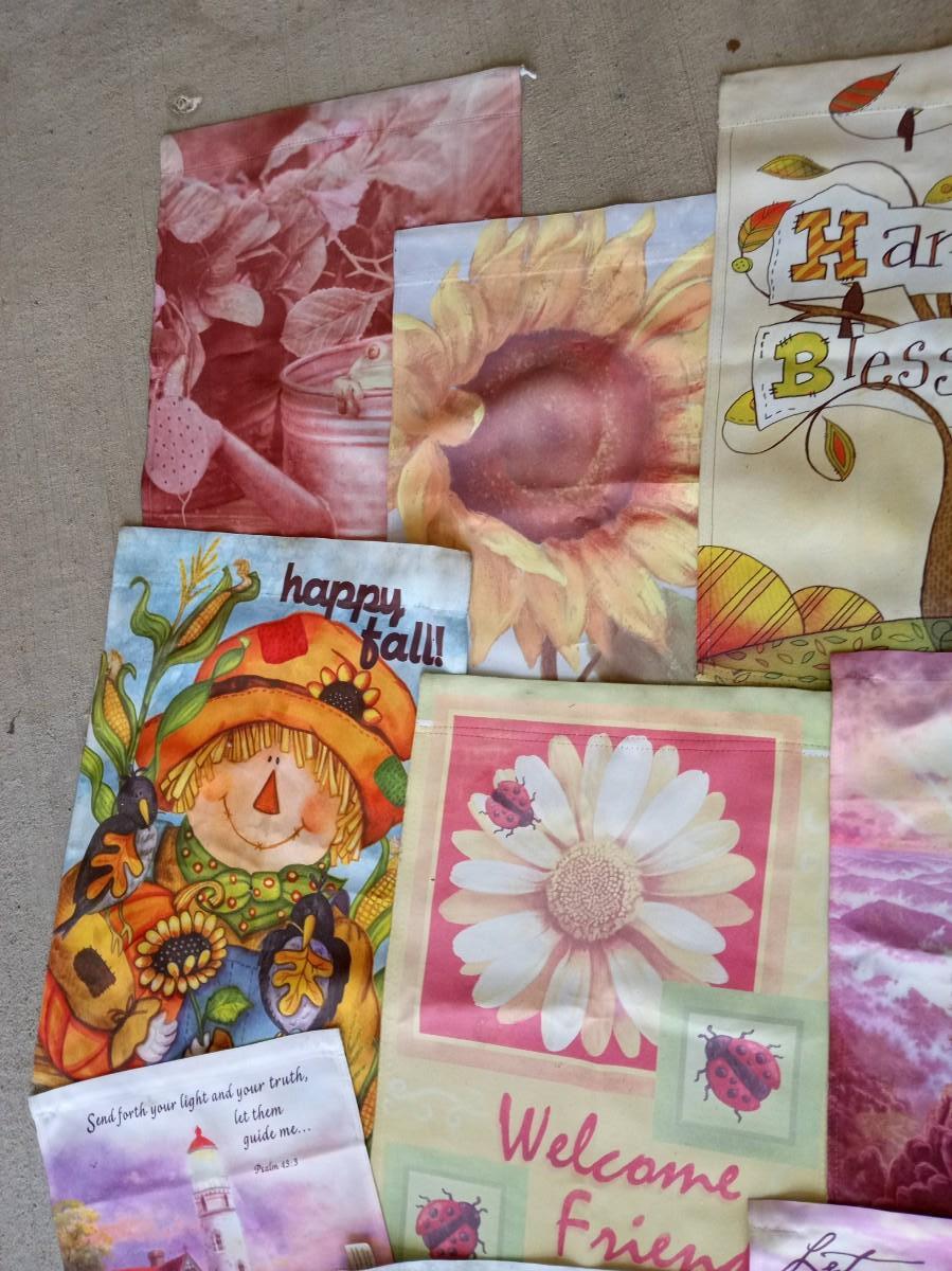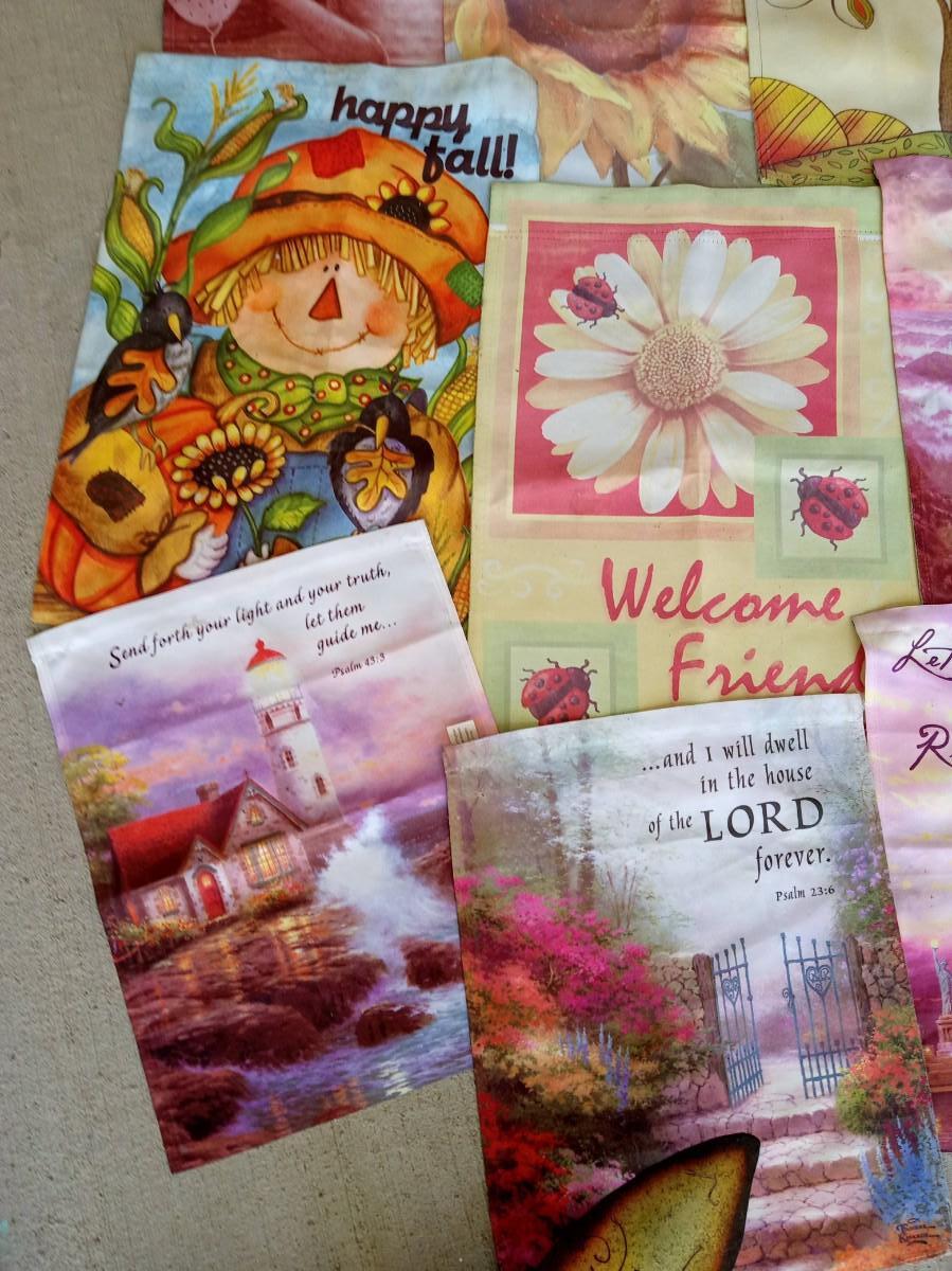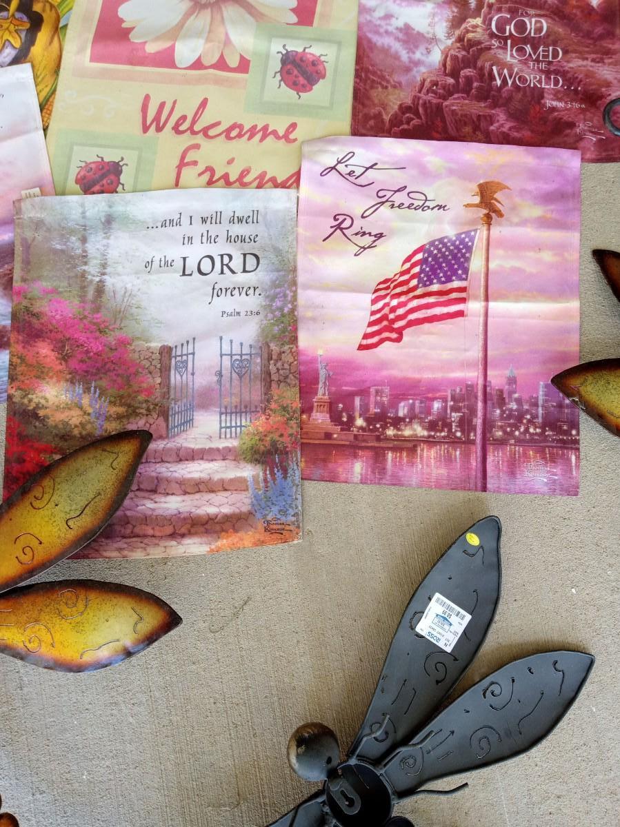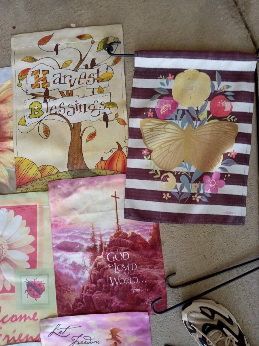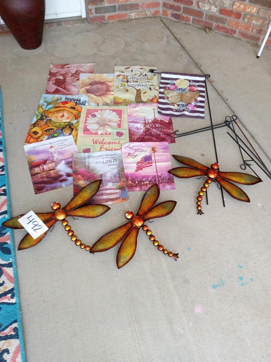 LOT 492 THREE 14" DRAGONFLIES AND GARDEN FLAGS WITH POLES (OB)