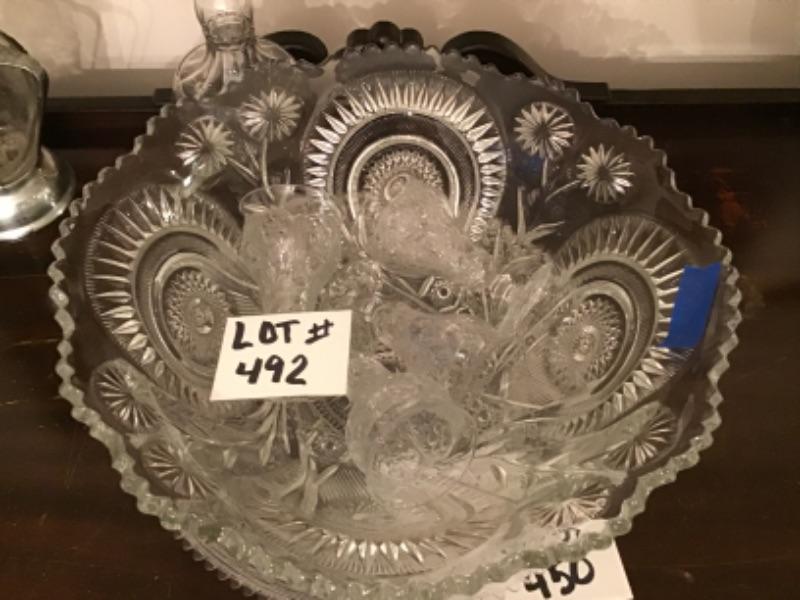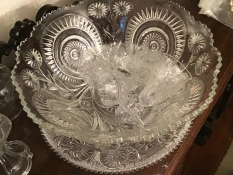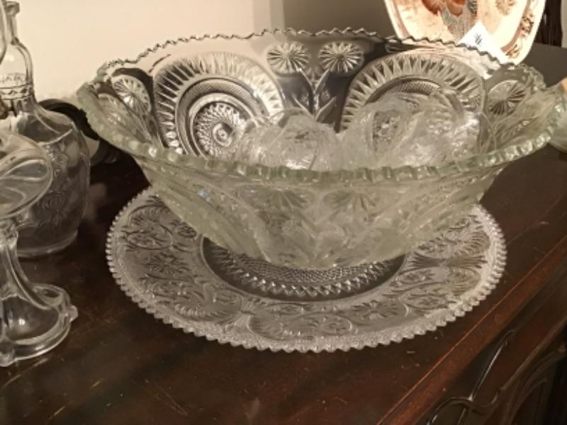 Antique PATTERNED Pressed GLASS PUNCH BOWL 17 1/2” DIAMETER