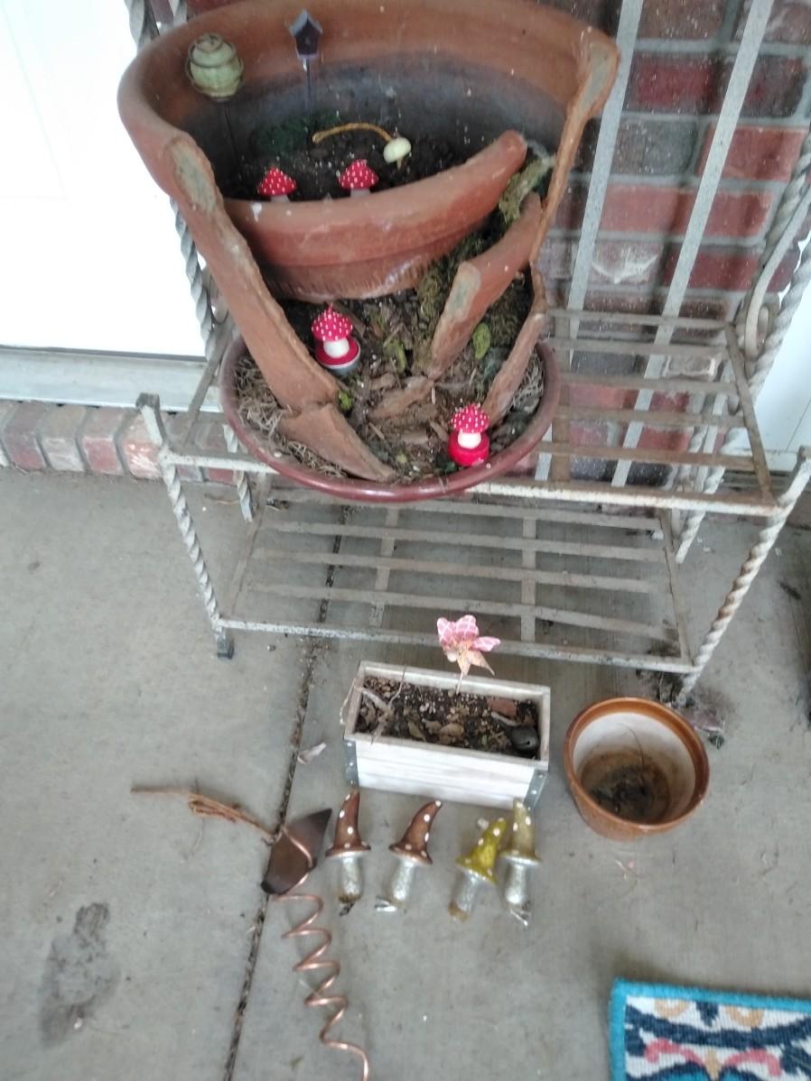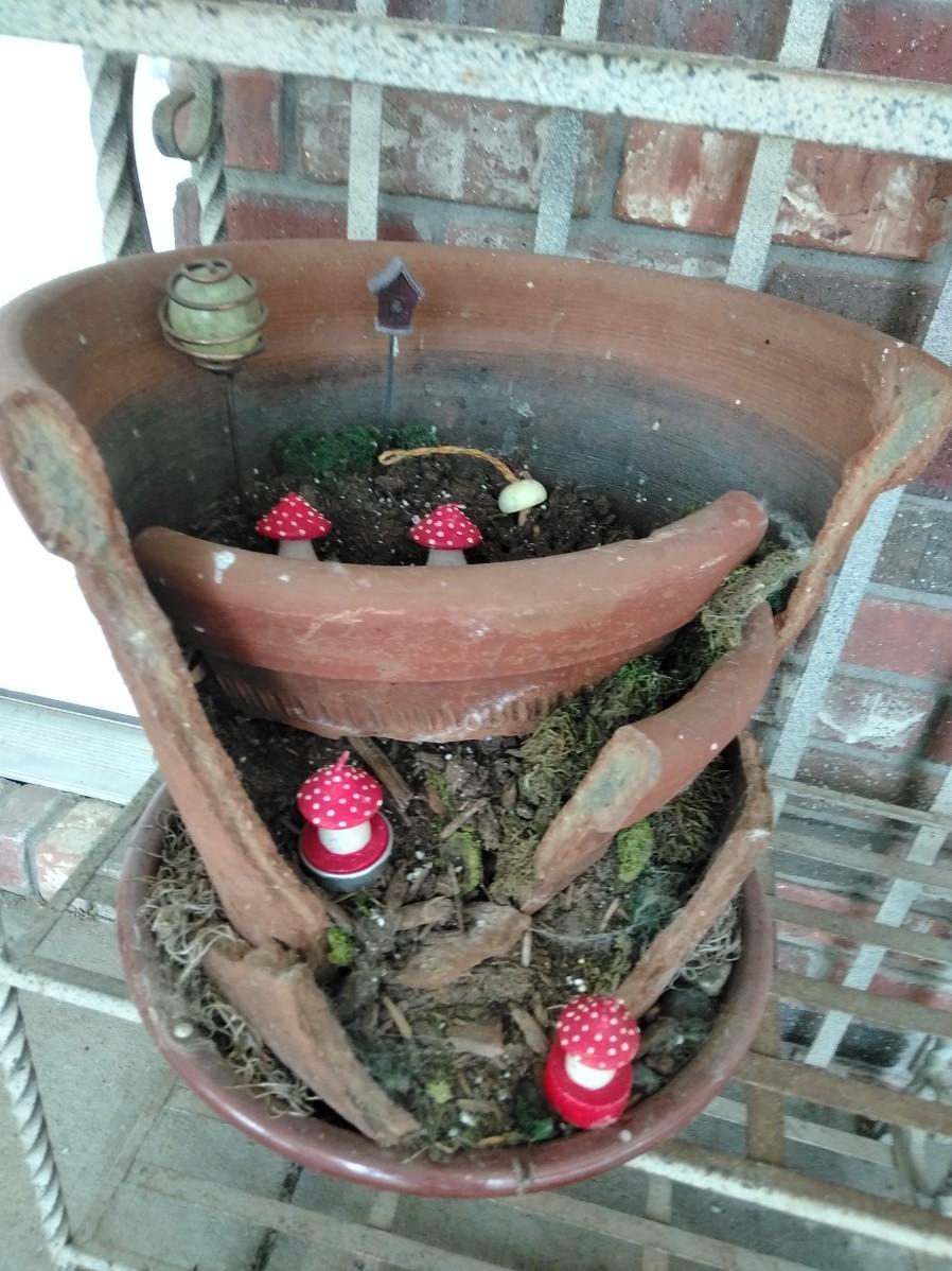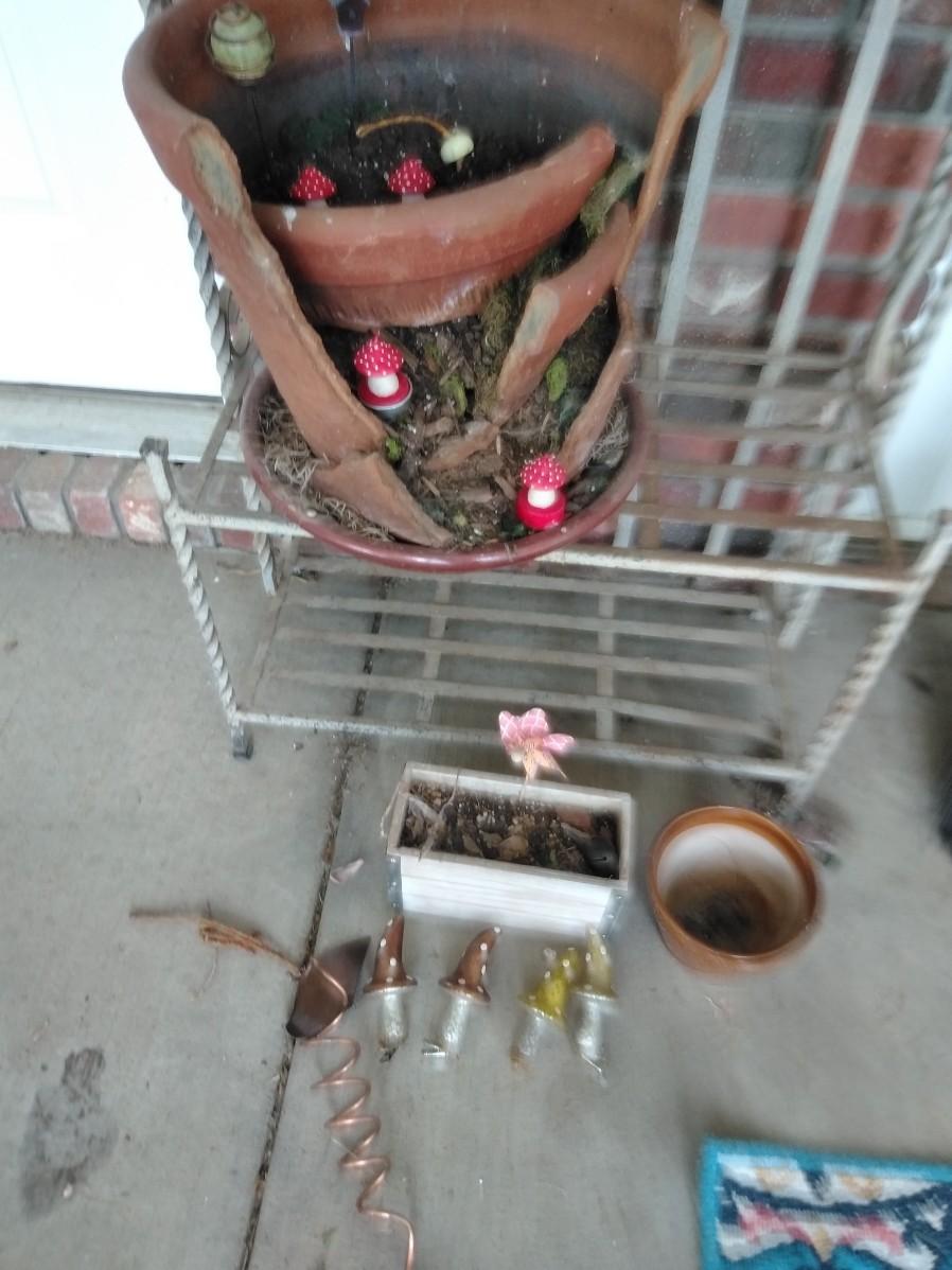 FAIRY GARDEN FLOWERPOT, SEVERAL DIFFERENT MUSHROOMS, AND SOME SMALLER POTS (Fairy-garden pot needs better assembly)