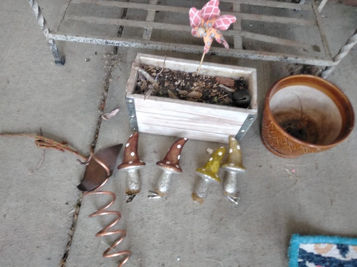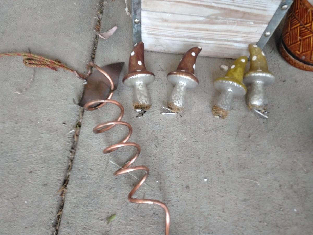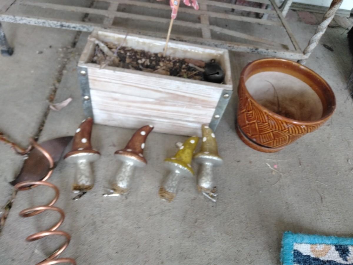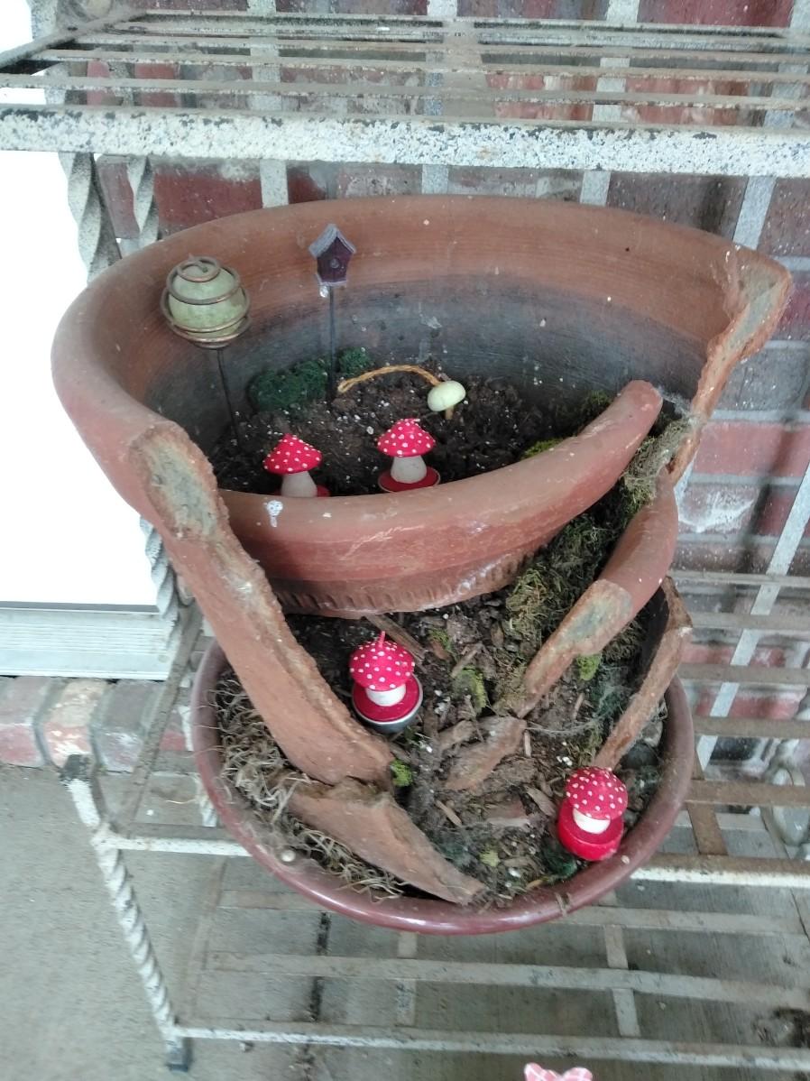 FAIRY GARDEN FLOWERPOT, SEVERAL DIFFERENT MUSHROOMS, AND SOME SMALLER POTS (Fairy-garden pot needs better assembly)
