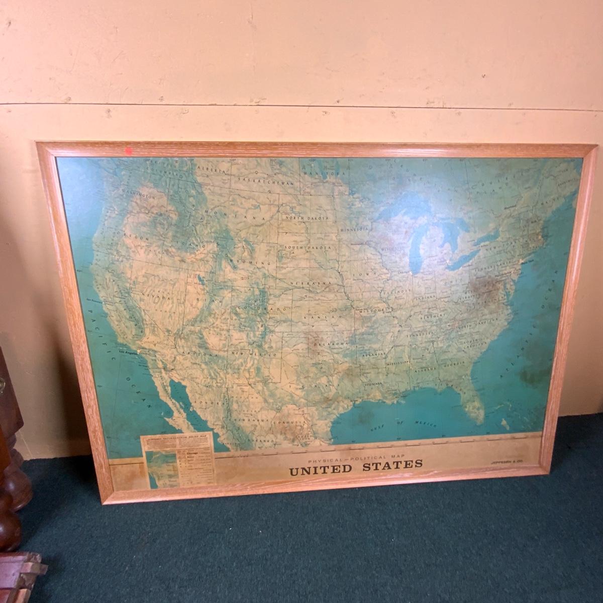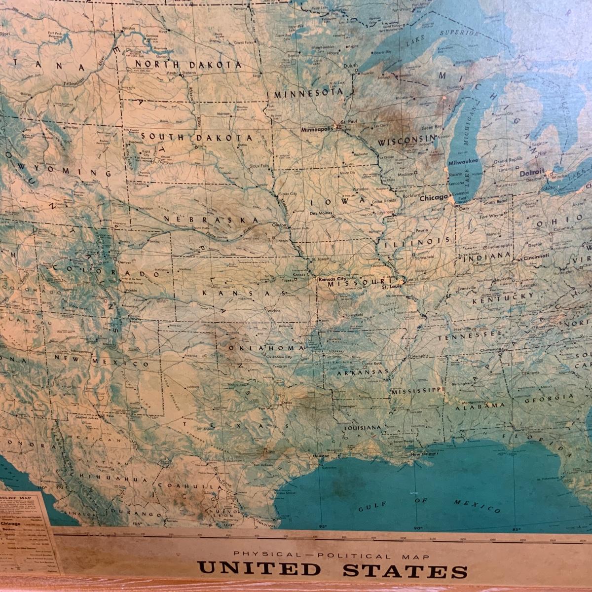 Vintage Physical and Political Wall Map. Where have you gone?! Put a pin in it!! //::\\ Please see photos for details and condition. No attempt has been made to hide any imperfections. All items listed in this auction are warehouse items, and need to be cleaned. A majority of the items need restoration as well. All items are sold AS IS and WITHOUT GUARANTEE. If you are uncertain about an item, DO NOT BID. Due to the nature of this online auction in-person inspection is HIGHLY recommended. All Sales are FINAL. Pick Up Times are FIRM. Please confirm with your own schedule that you can pick up in the scheduled times listed in the Terms and Conditions. Any questions please message the auctioneer. DO NOT Contact The Harp Gallery.