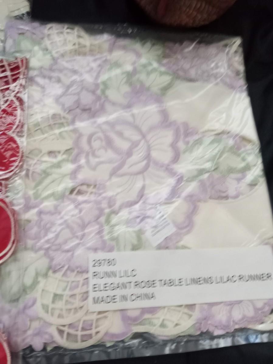 LOT 494  FOUR NEW TABLE RUNNERS, CANDY GARLAND AND MORE