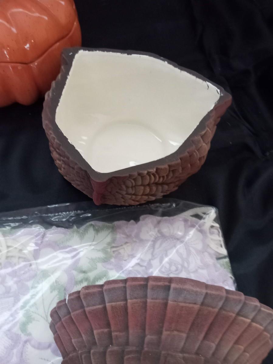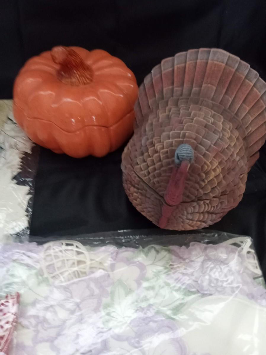 CERAMIC PUMPKIN AND TURKEY DISHES WITH LIDS