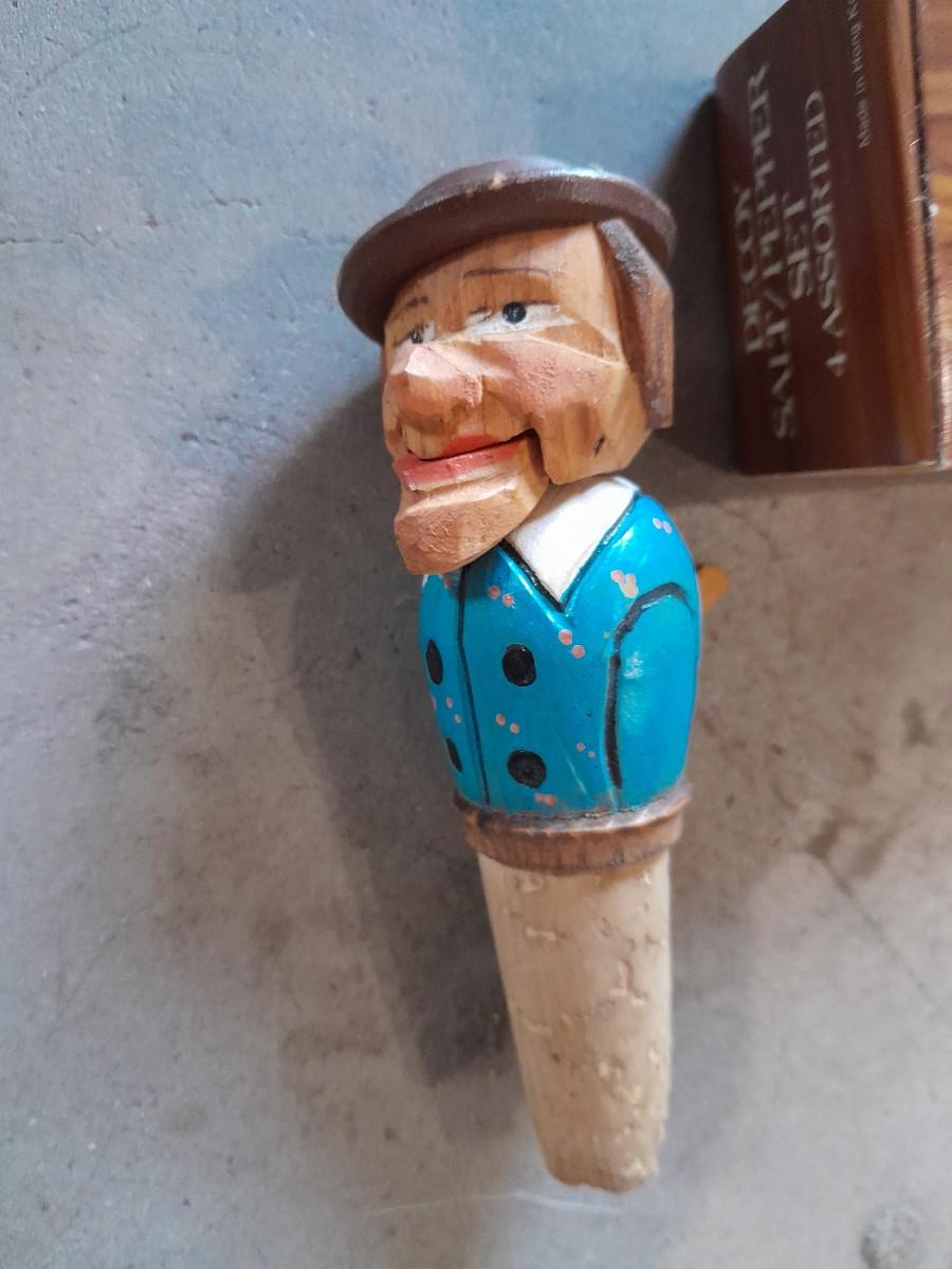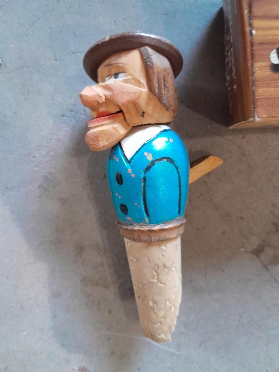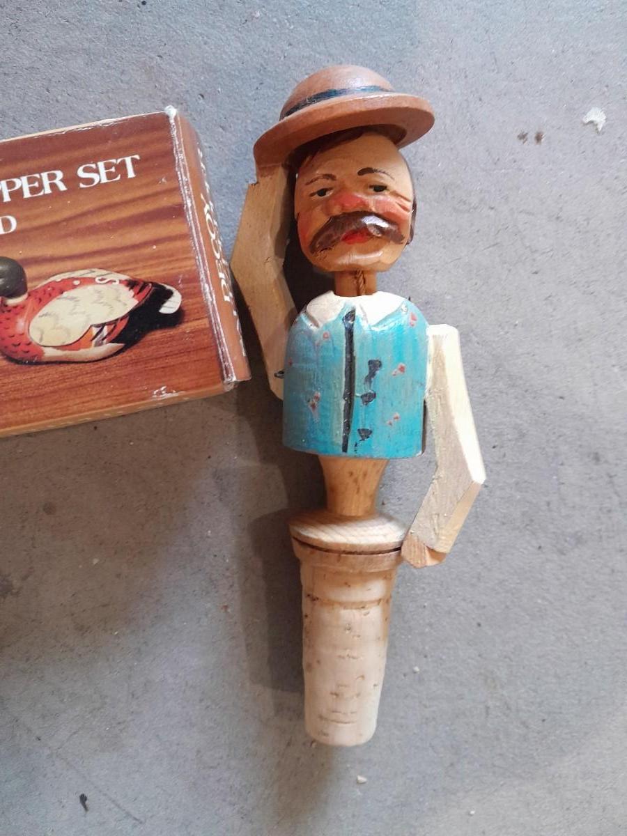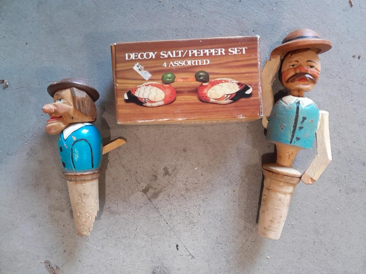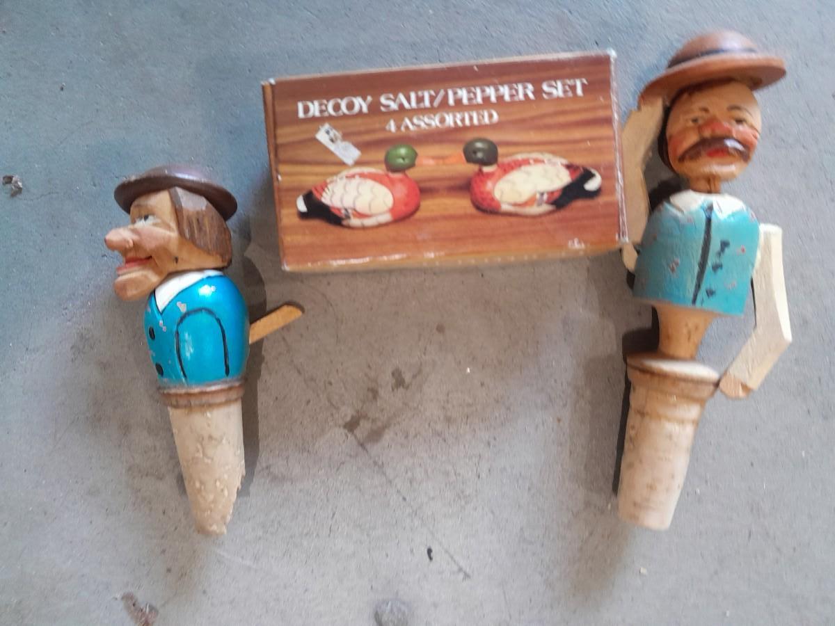 VINTAGE ANIMATED WOOD FIGURE WINE CORKS AND SALT & PEPPER DUCKS (one cork broke as shown)