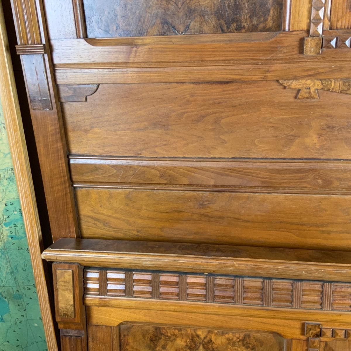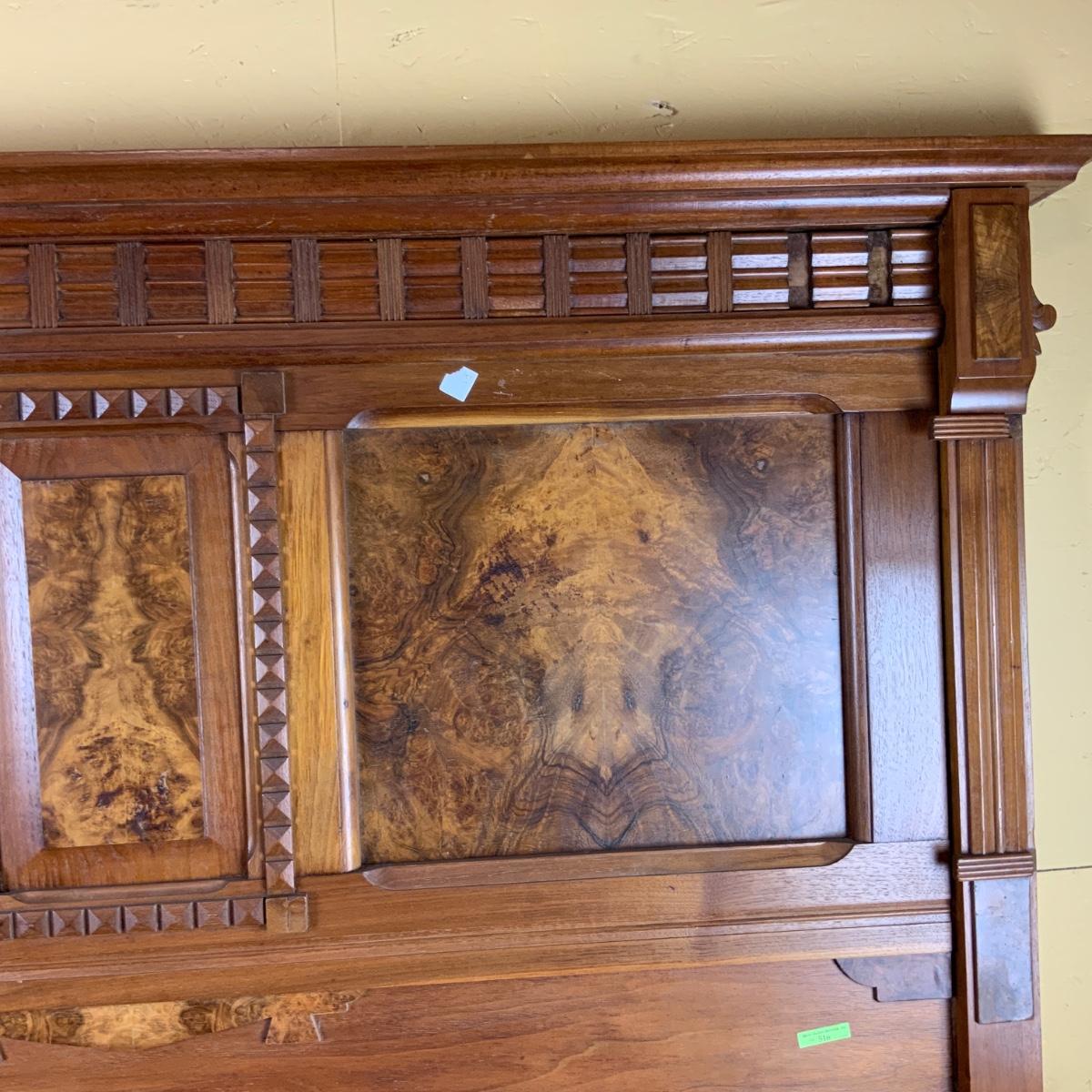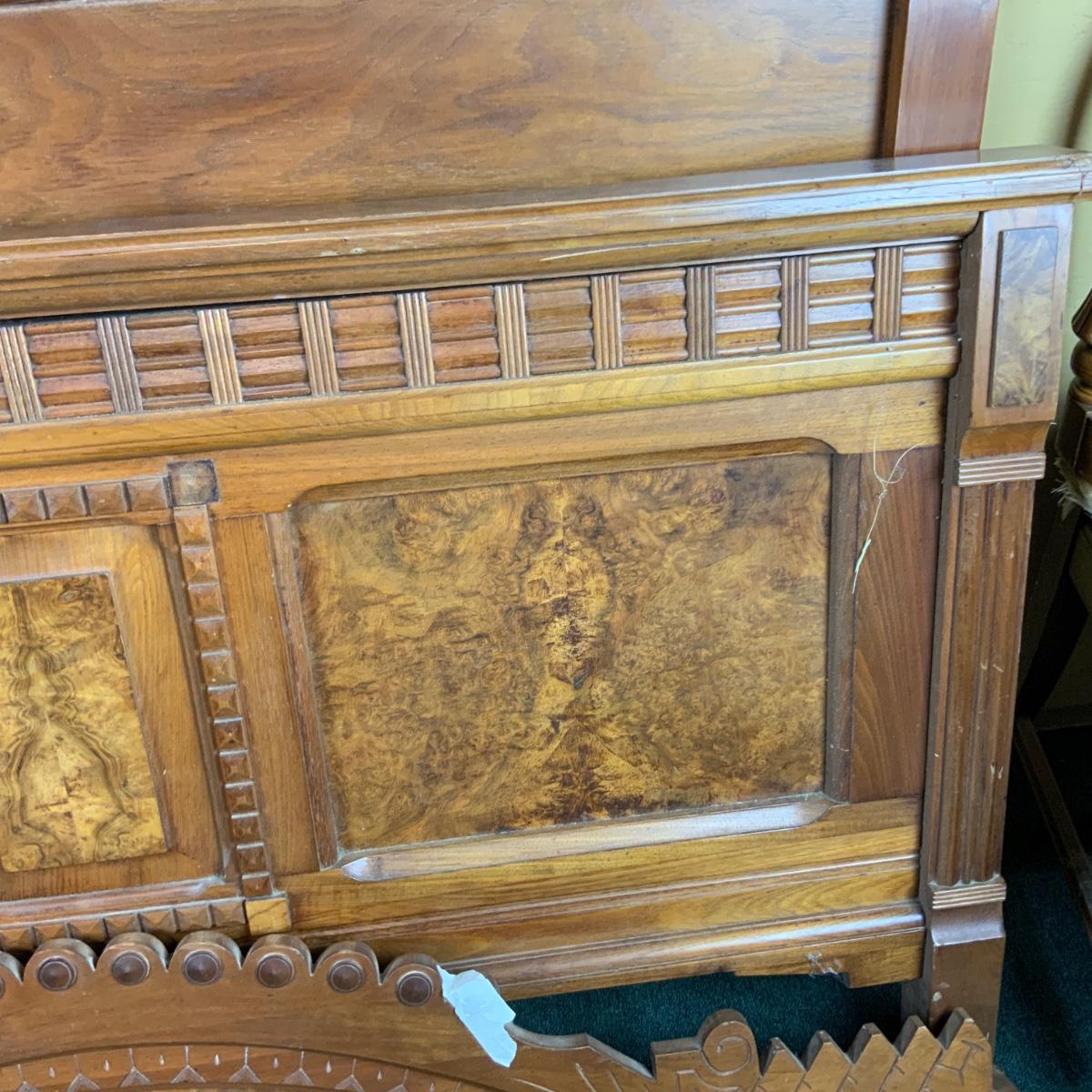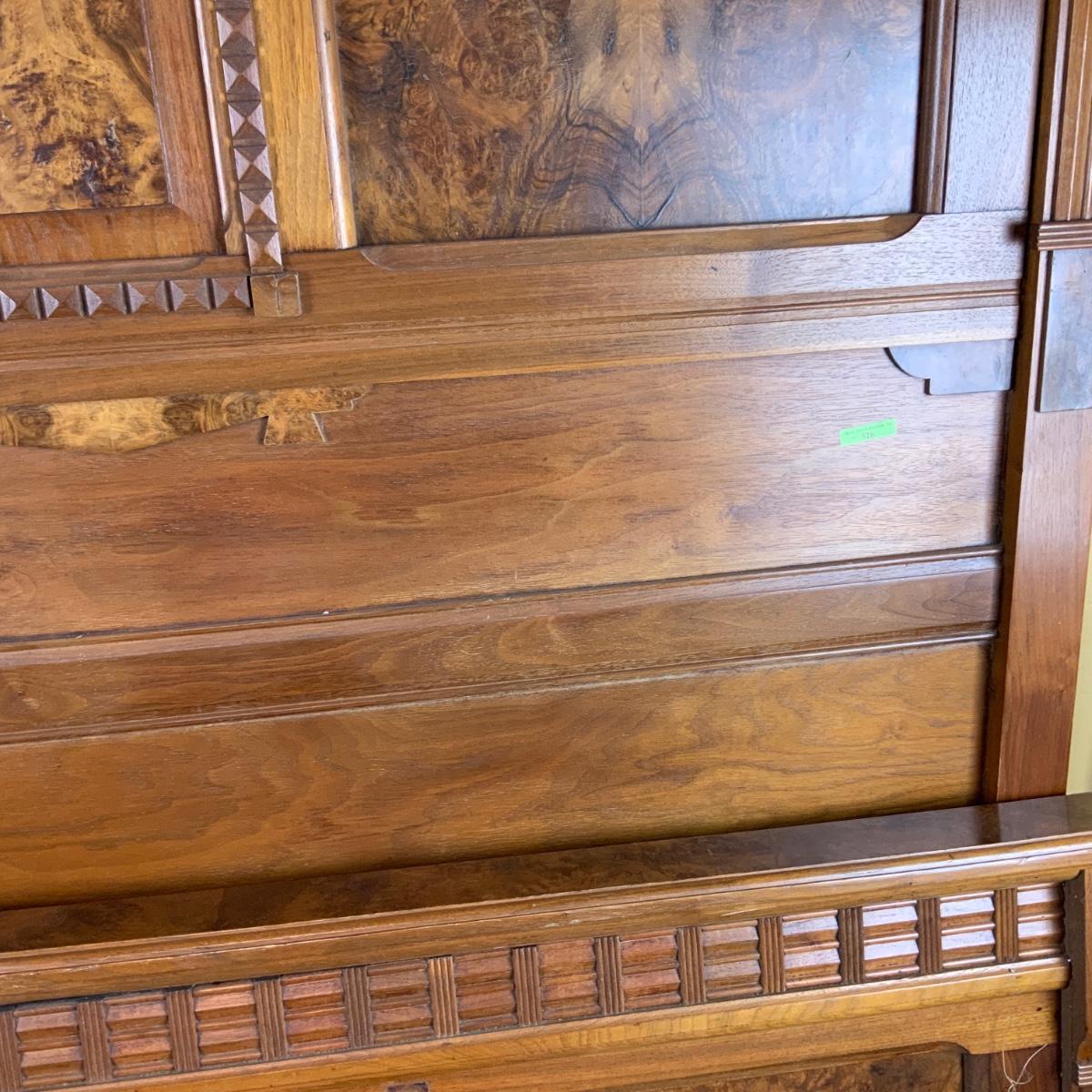 Victorian Bed with Burled Walnut Panels. This will really make an impression when you give the house your. Scalloped piece in the front gets attached to the top of the headboard. //::\\ Please see photos for details and condition. No attempt has been made to hide any imperfections. All items listed in this auction are warehouse items, and need to be cleaned. A majority of the items need restoration as well. All items are sold AS IS and WITHOUT GUARANTEE. If you are uncertain about an item, DO NOT BID. Due to the nature of this online auction in-person inspection is HIGHLY recommended. All Sales are FINAL. Pick Up Times are FIRM. Please confirm with your own schedule that you can pick up in the scheduled times listed in the Terms and Conditions. Any questions please message the auctioneer. DO NOT Contact The Harp Gallery.