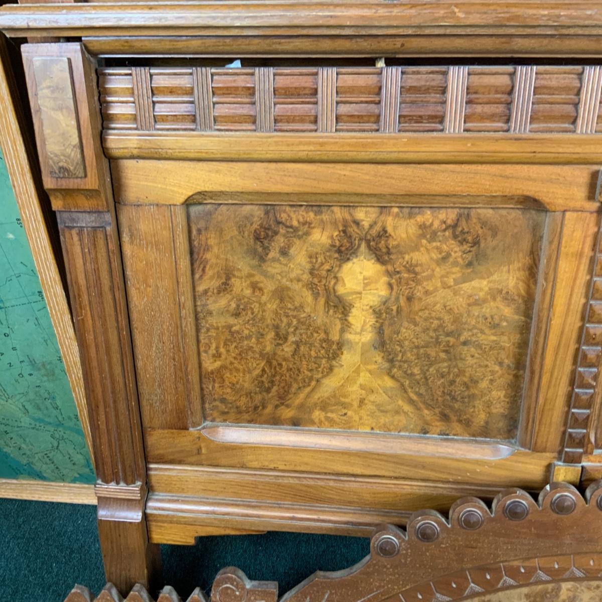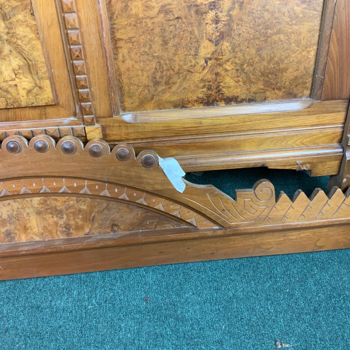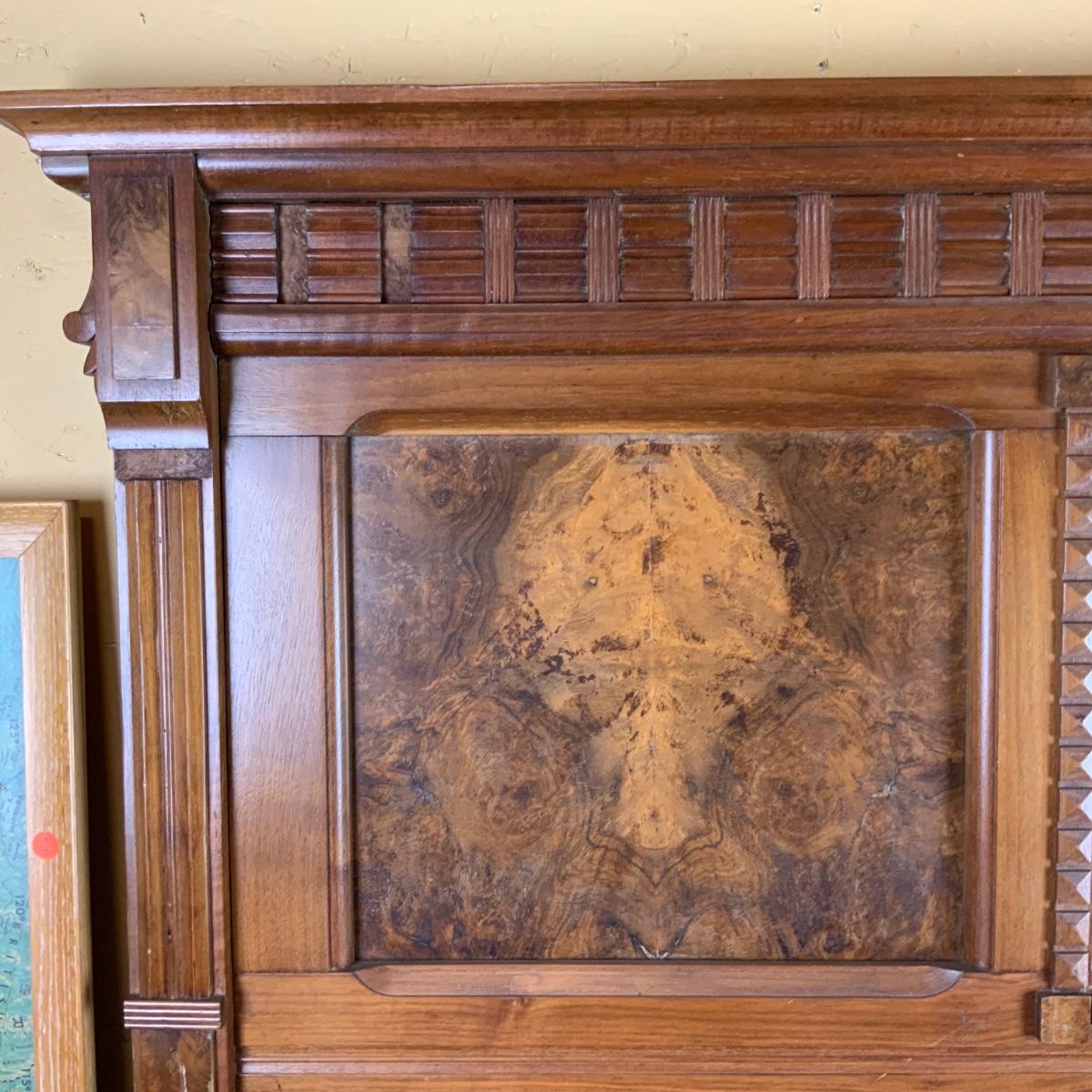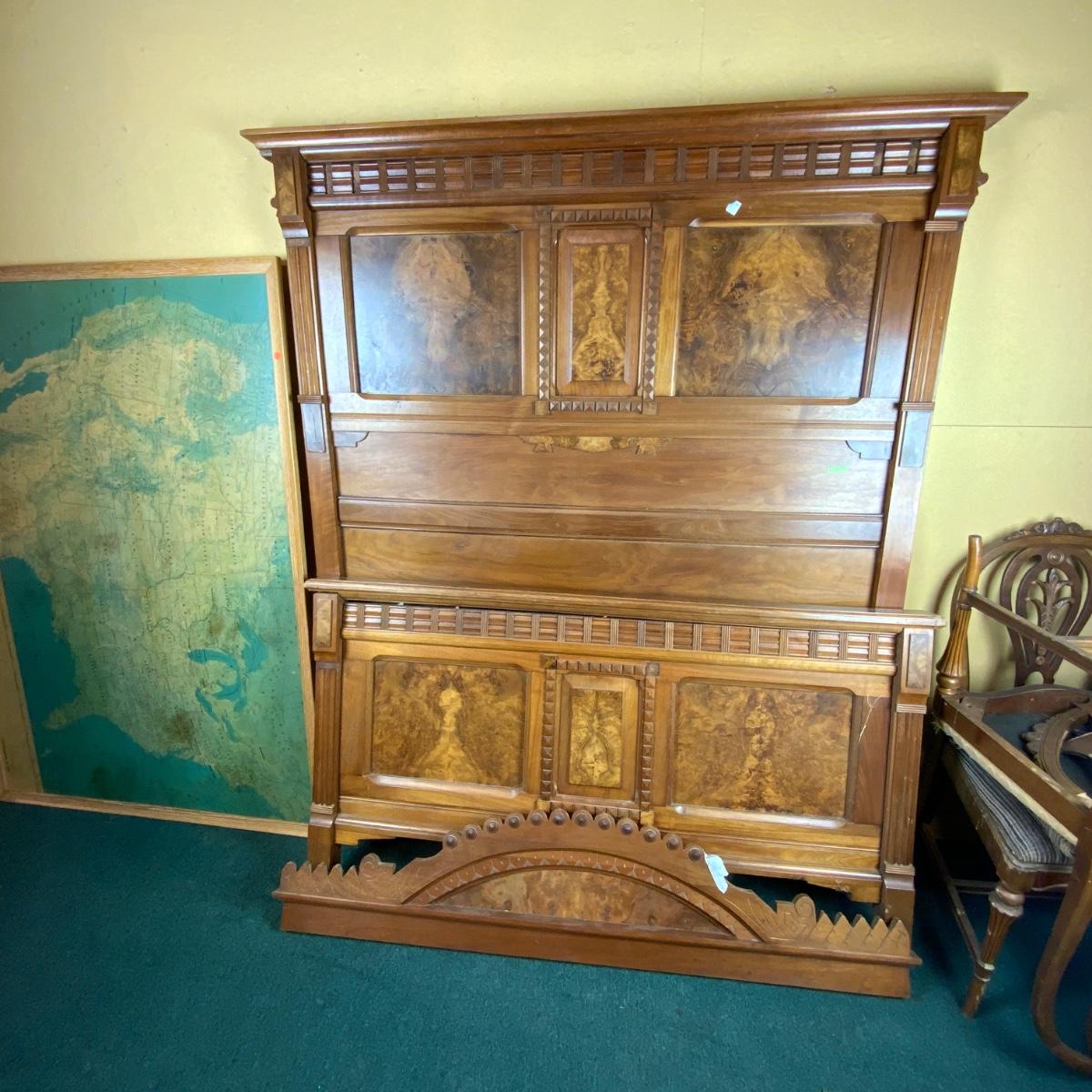 Victorian Bed with Burled Walnut Panels. This will really make an impression when you give the house your. Scalloped piece in the front gets attached to the top of the headboard. //::\\ Please see photos for details and condition. No attempt has been made to hide any imperfections. All items listed in this auction are warehouse items, and need to be cleaned. A majority of the items need restoration as well. All items are sold AS IS and WITHOUT GUARANTEE. If you are uncertain about an item, DO NOT BID. Due to the nature of this online auction in-person inspection is HIGHLY recommended. All Sales are FINAL. Pick Up Times are FIRM. Please confirm with your own schedule that you can pick up in the scheduled times listed in the Terms and Conditions. Any questions please message the auctioneer. DO NOT Contact The Harp Gallery.