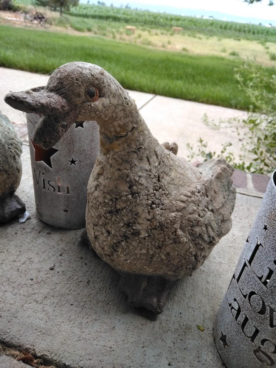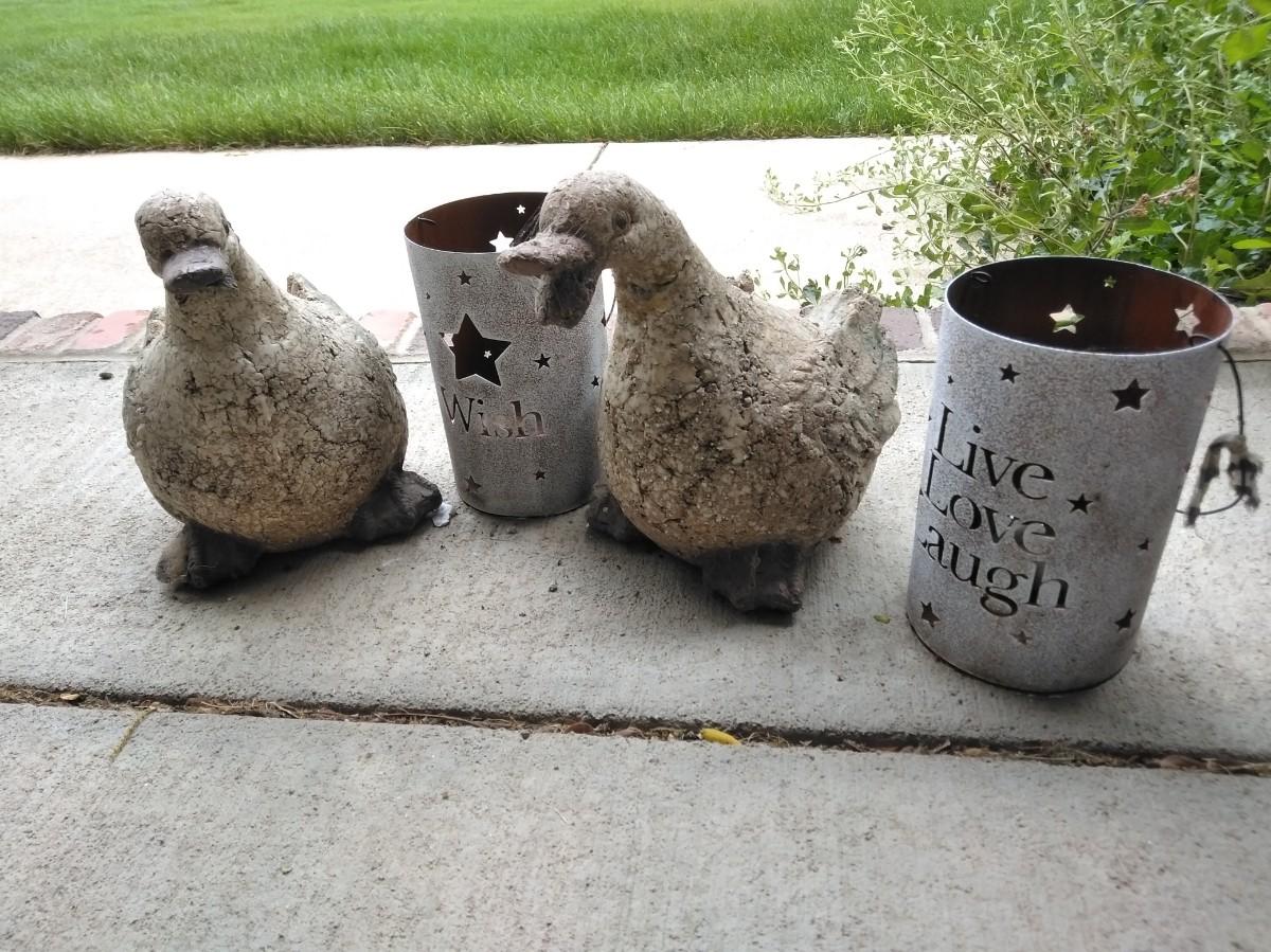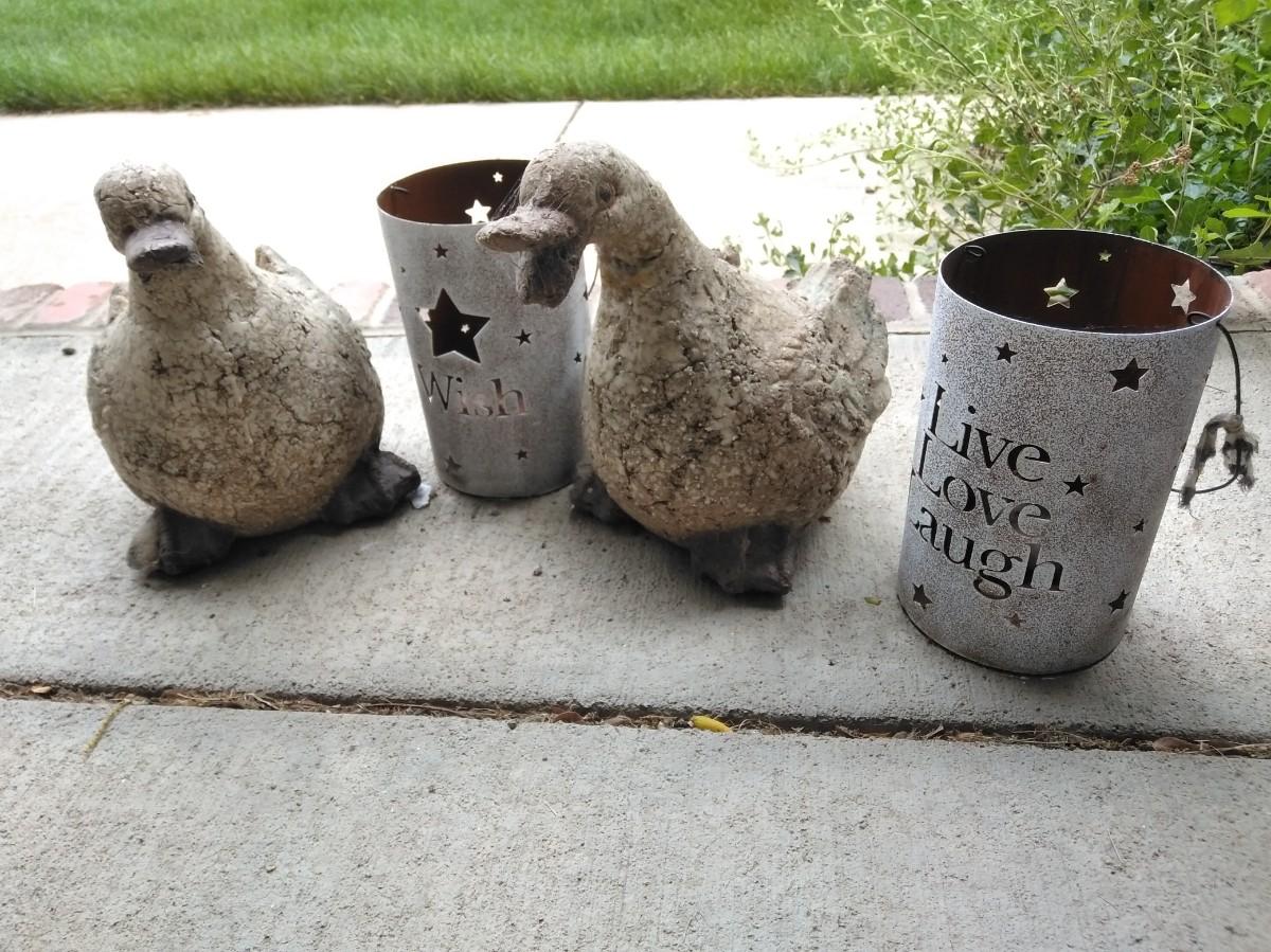 TWO GARDEN GEESE (one with bottom broken beak) AND TWO CANDLE HOLDERS WITH SAYINGS.