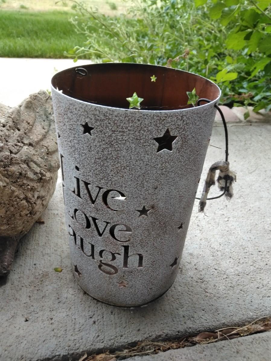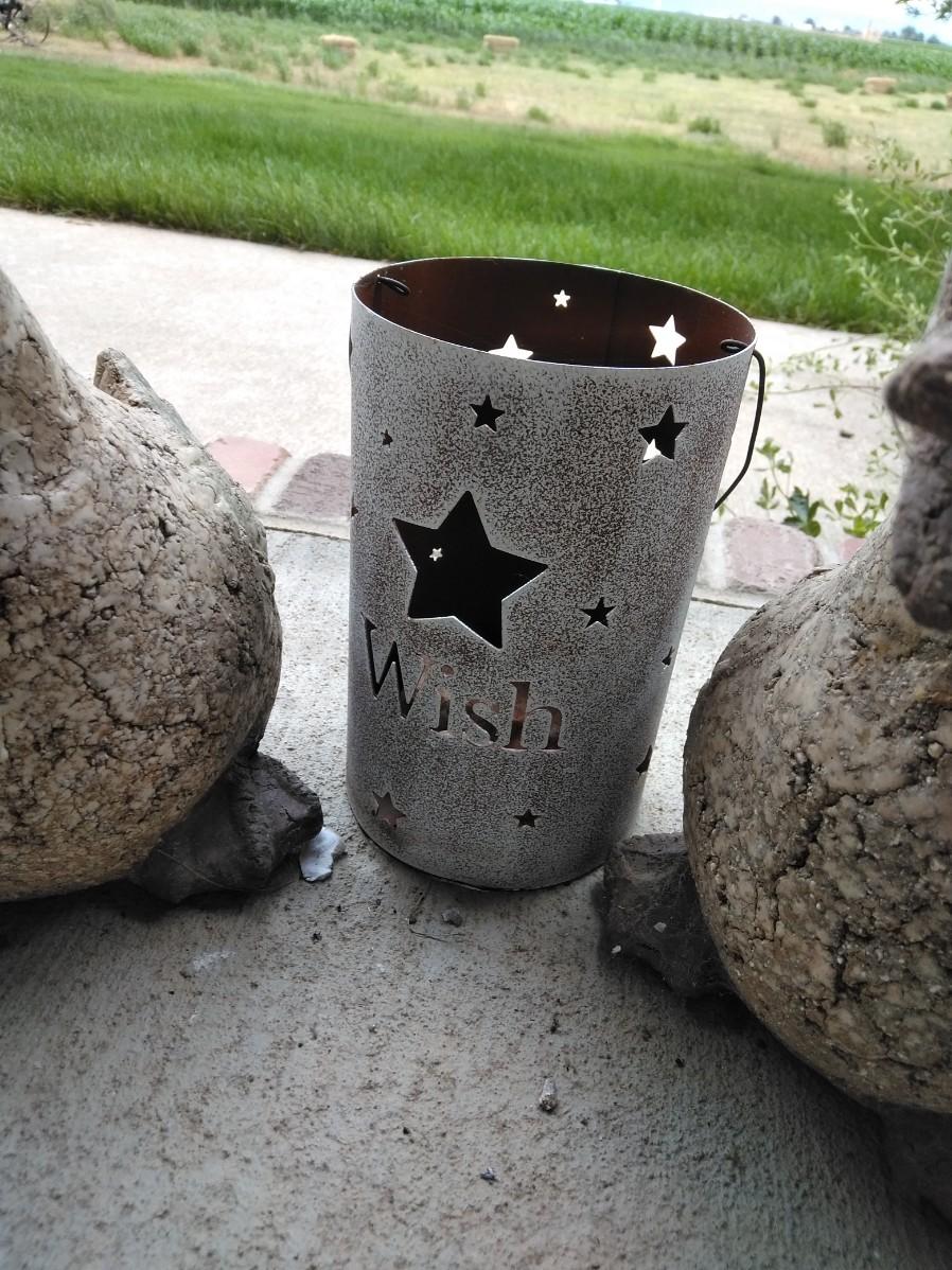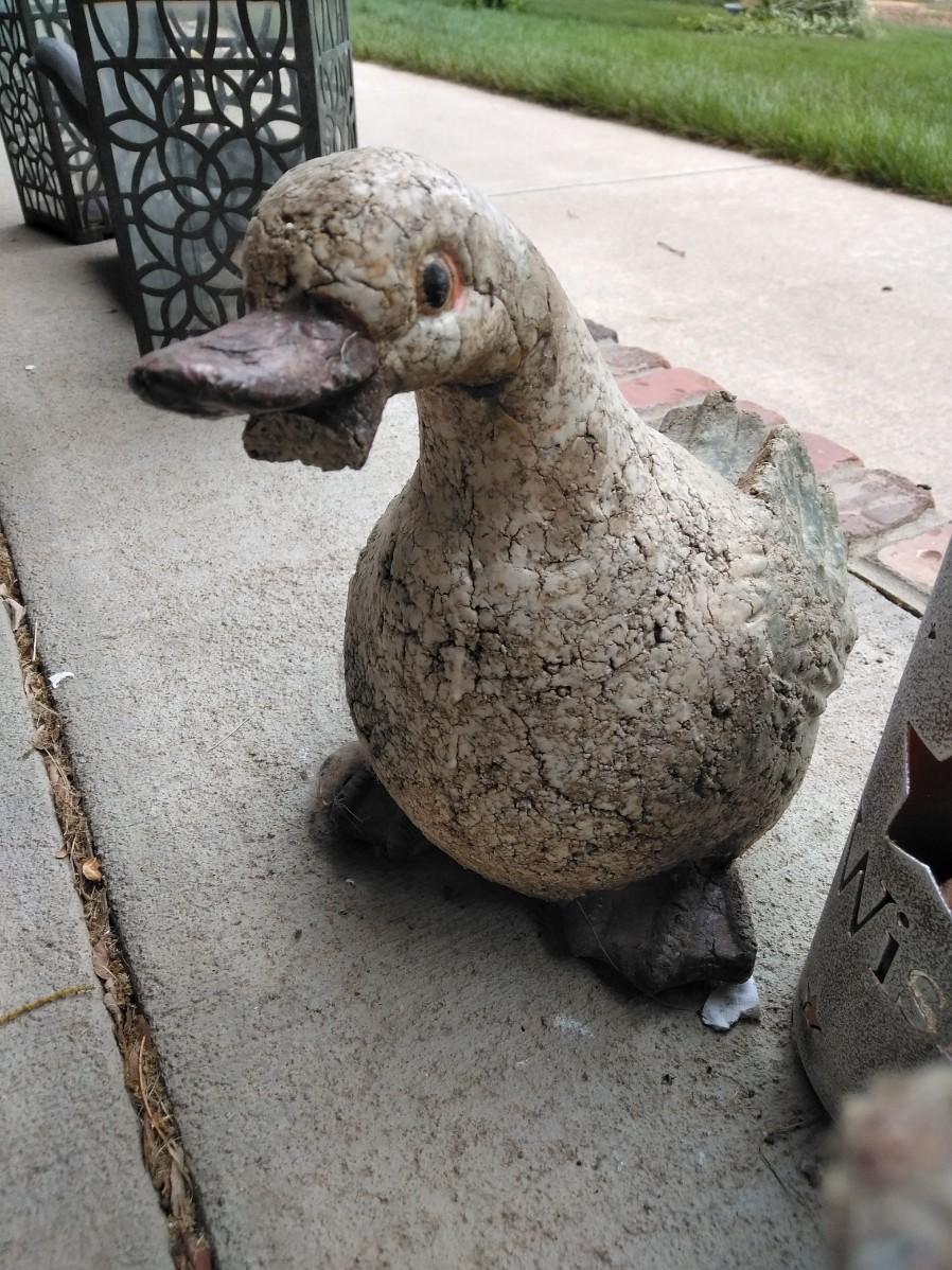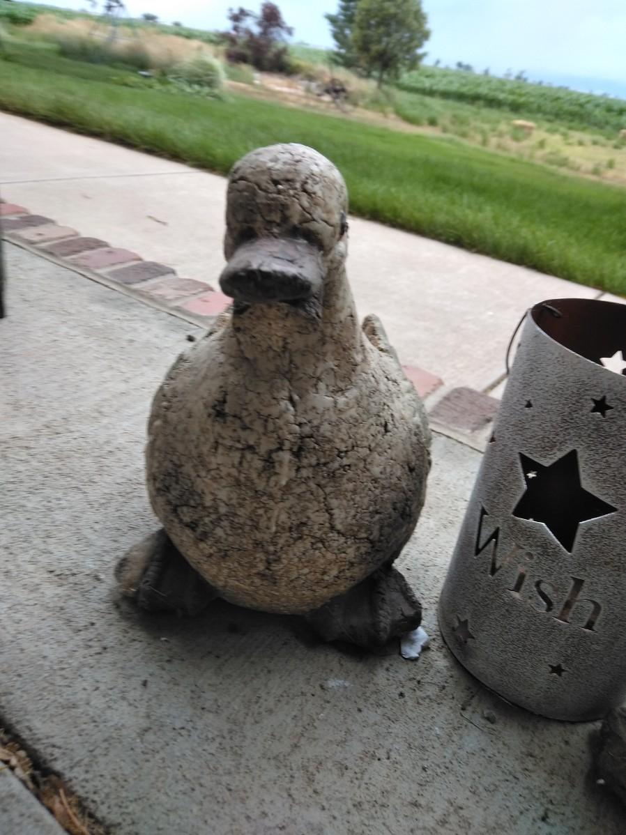 TWO GARDEN GEESE (one with bottom broken beak) AND TWO CANDLE HOLDERS WITH SAYINGS.