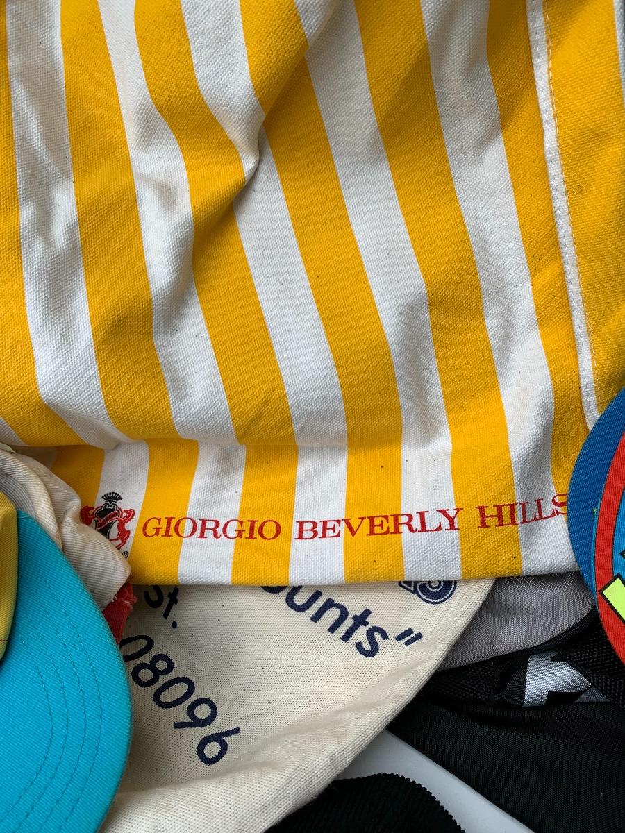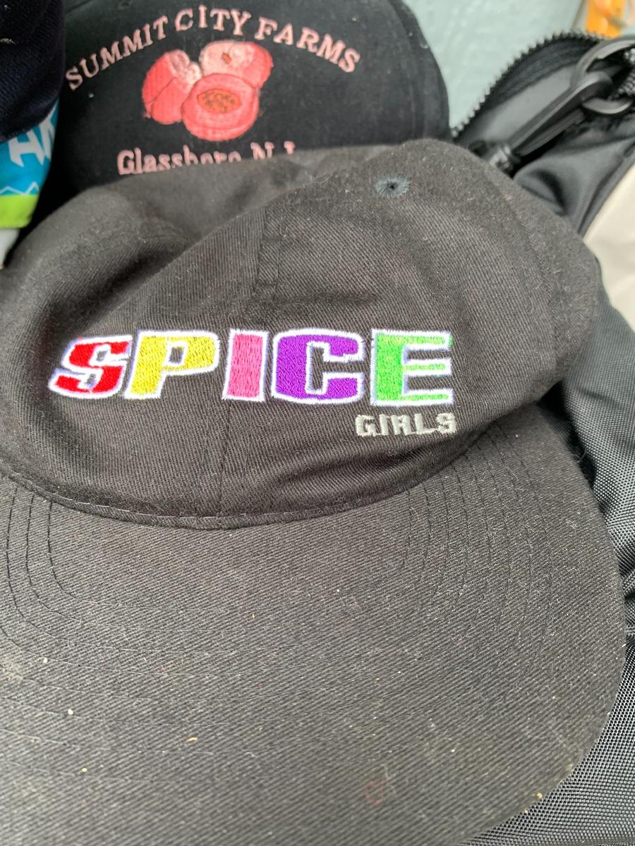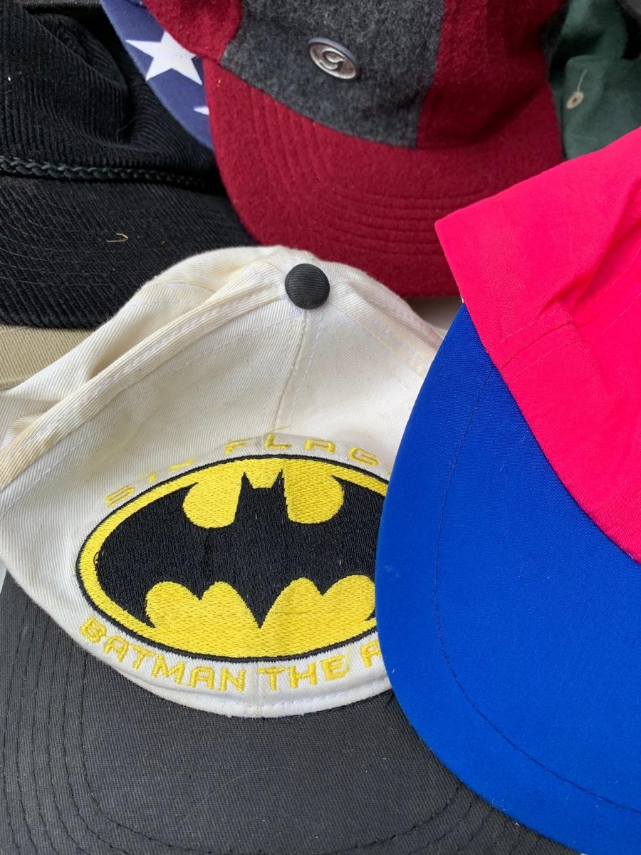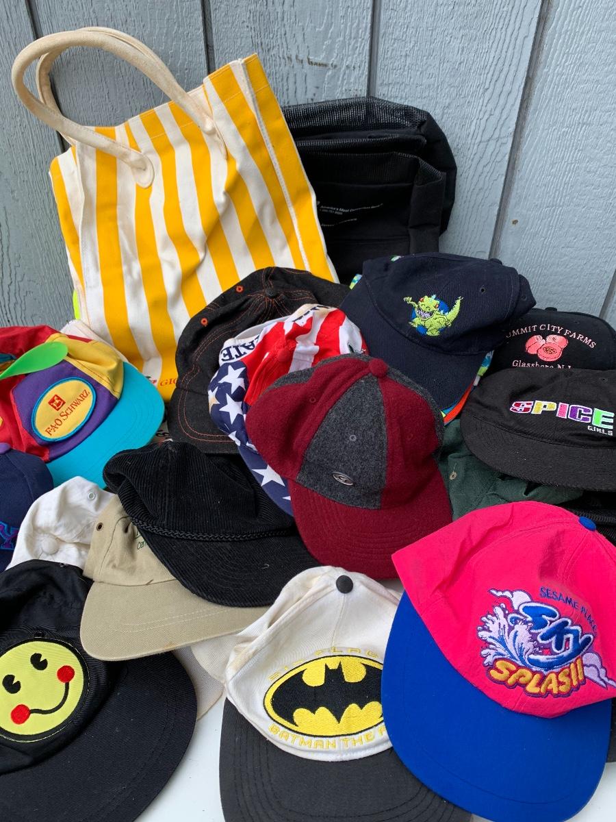 Hats: Spice Girls, Harley Davidson, Sesame Place, Batman to name a few in this lot of hats & bags. There is a new with tag Foot-Joy duffle bag, Giorgio Beverly Hills Bag, local Simpkins Cleaners, Woodbury NJ an more