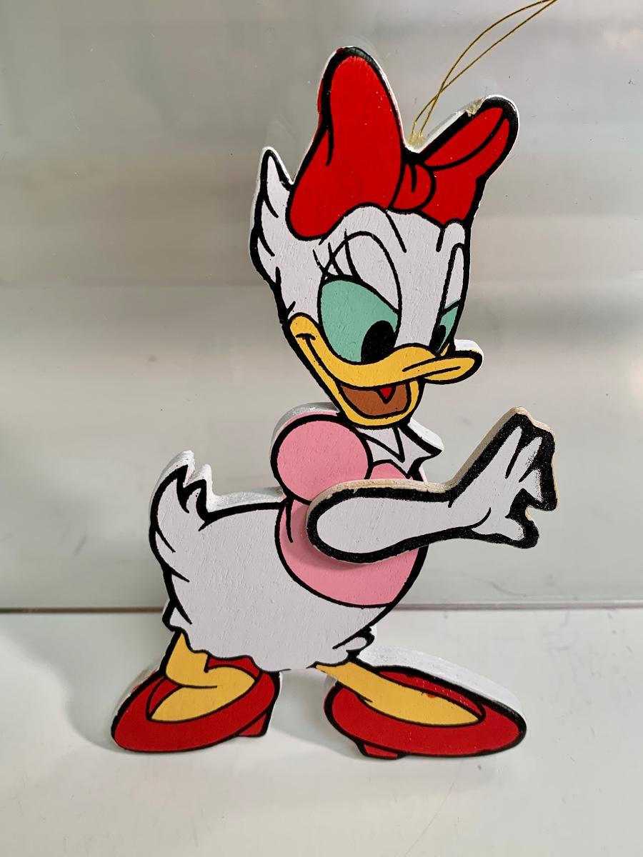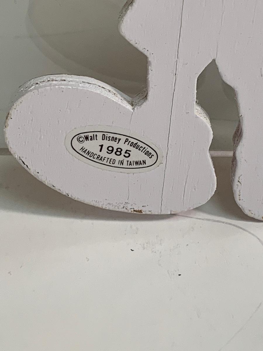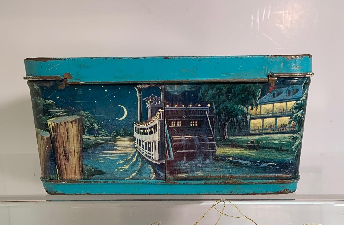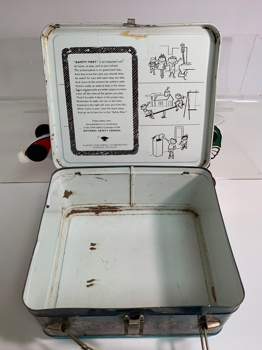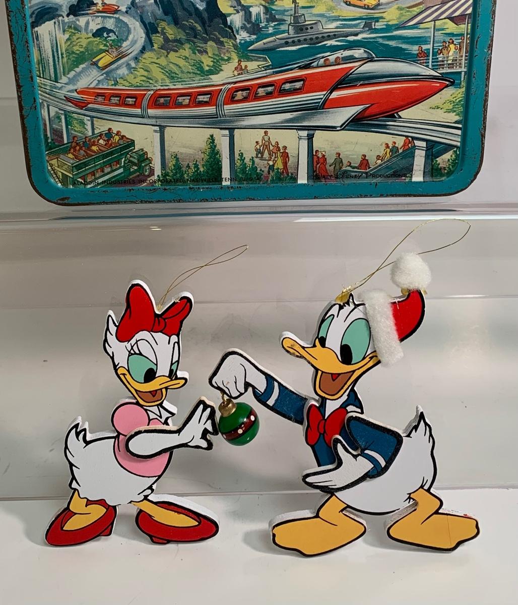 Vintage Disneyland metal lunchbox along with wooden Disney character ornaments. Lunchbox shows wear.