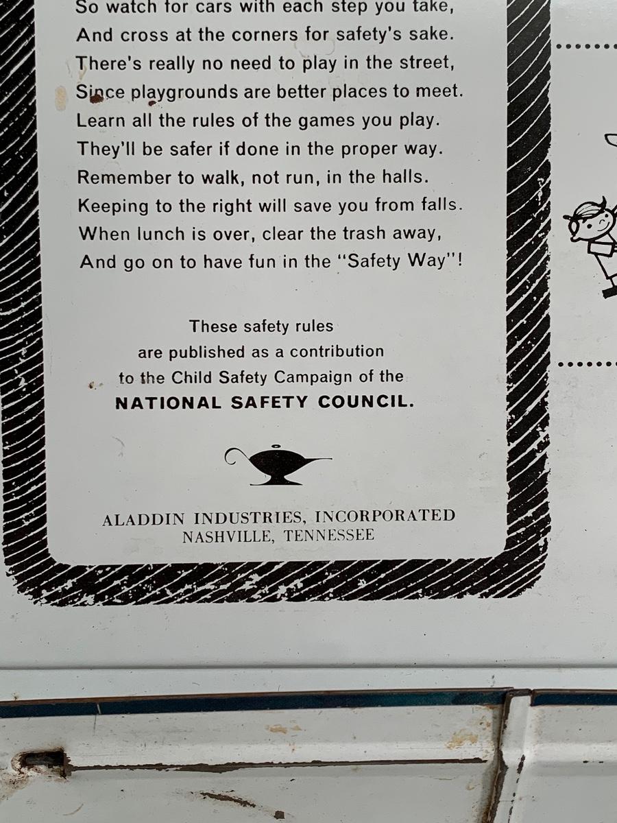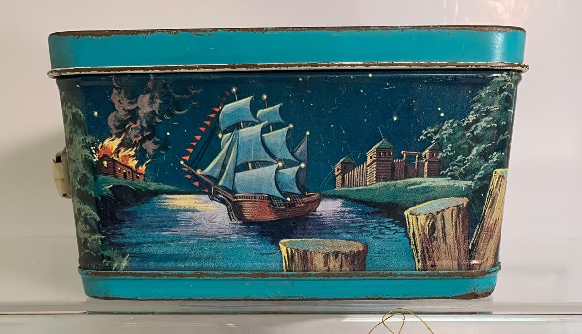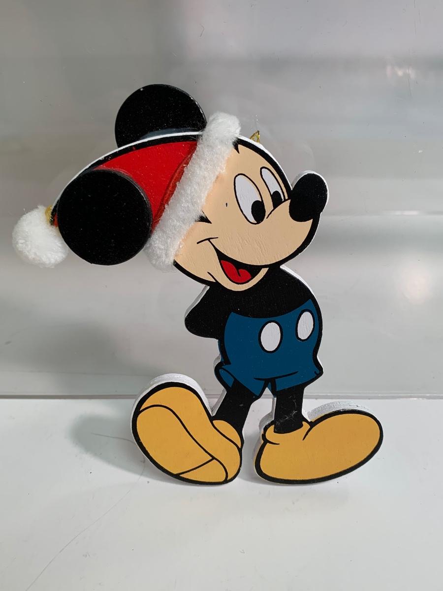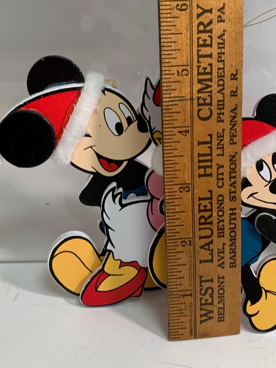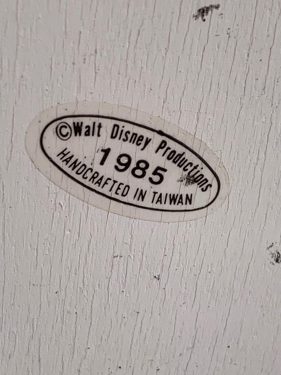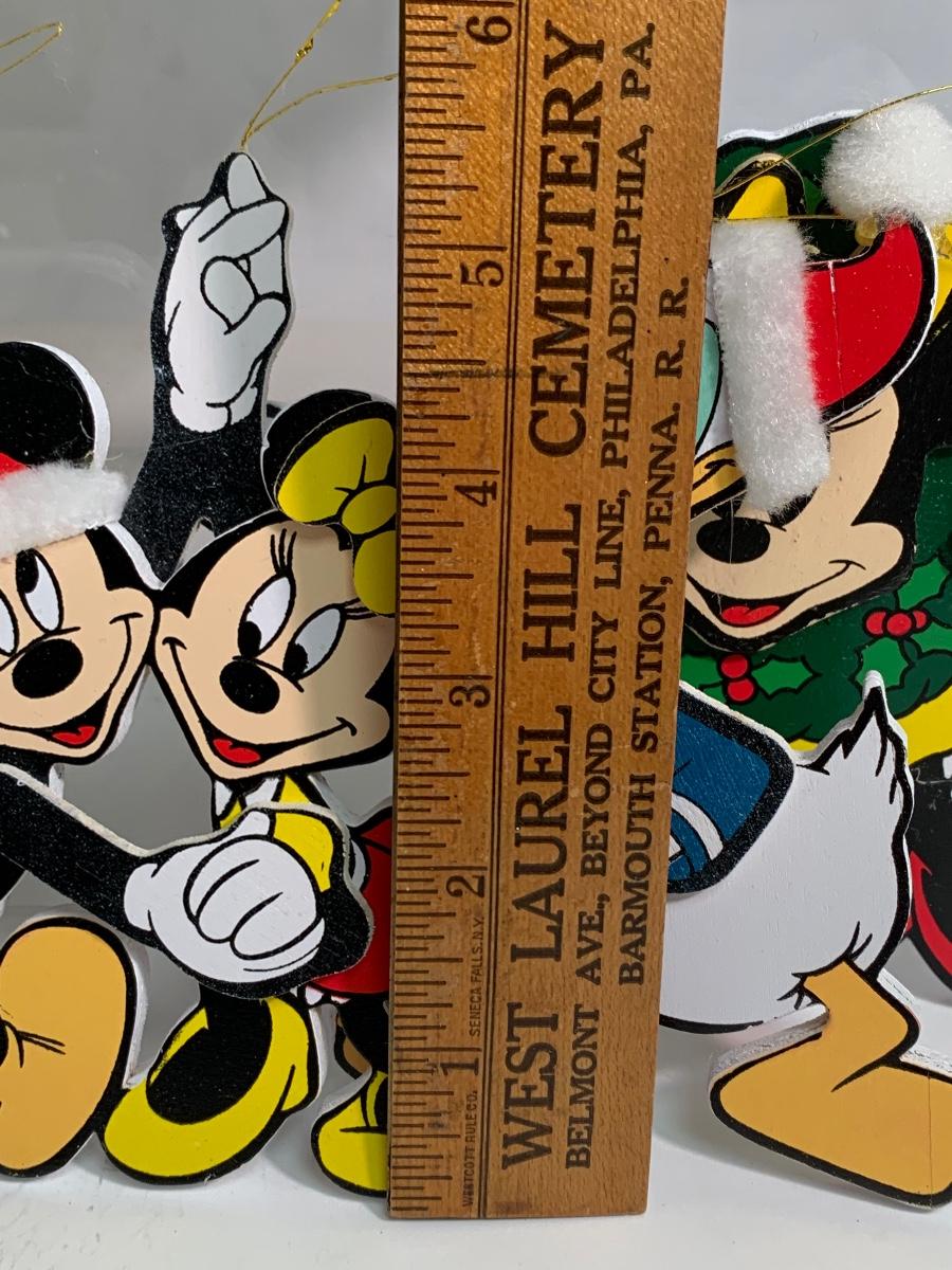 Vintage Disneyland metal lunchbox along with wooden Disney character ornaments. Lunchbox shows wear.