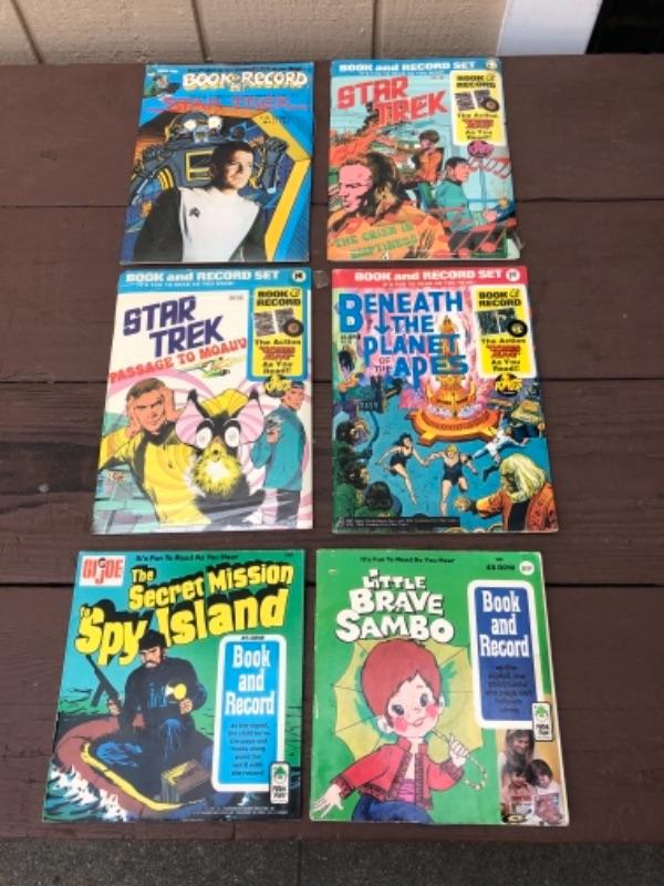 Lot 498: 6 Book and Record Sets: 3 Star Trek 1975,1979; Planet of the Apes, 1974; Peter Pan Records: GI Joe Spy Island, 1973; Brave Sambo, 1971