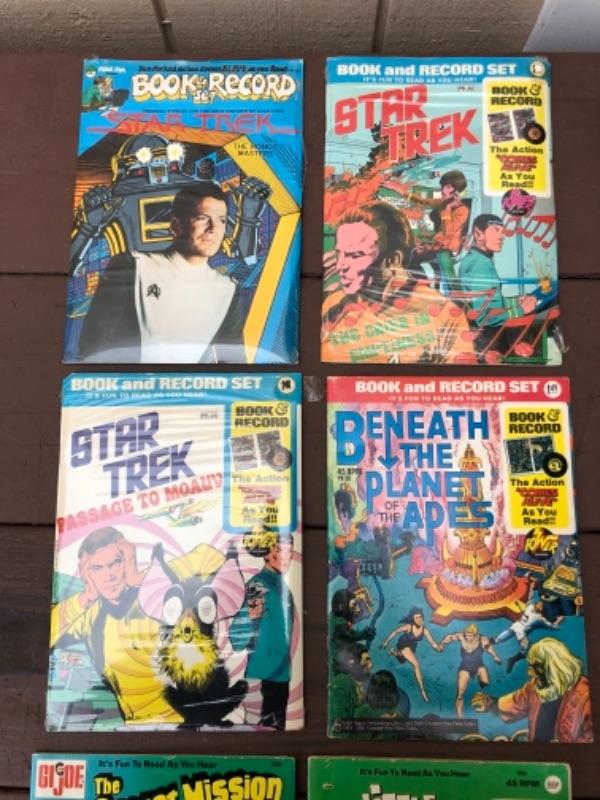 Lot 498: 6 Book and Record Sets: 3 Star Trek 1975,1979, still in shrink wrap; Planet of the Apes, 1974; Peter Pan Records: GI Joe Spy Island, 1973; Brave Sambo, 1971