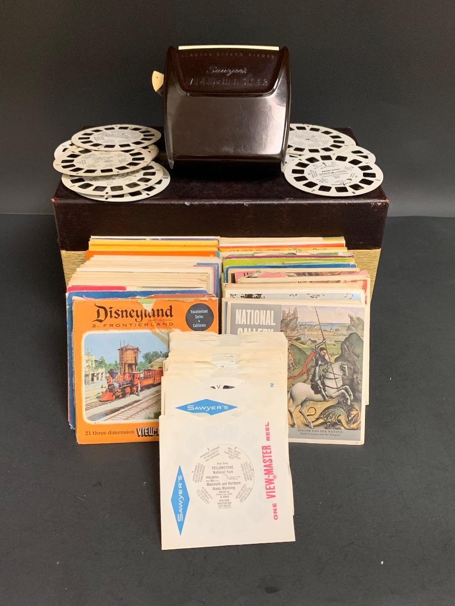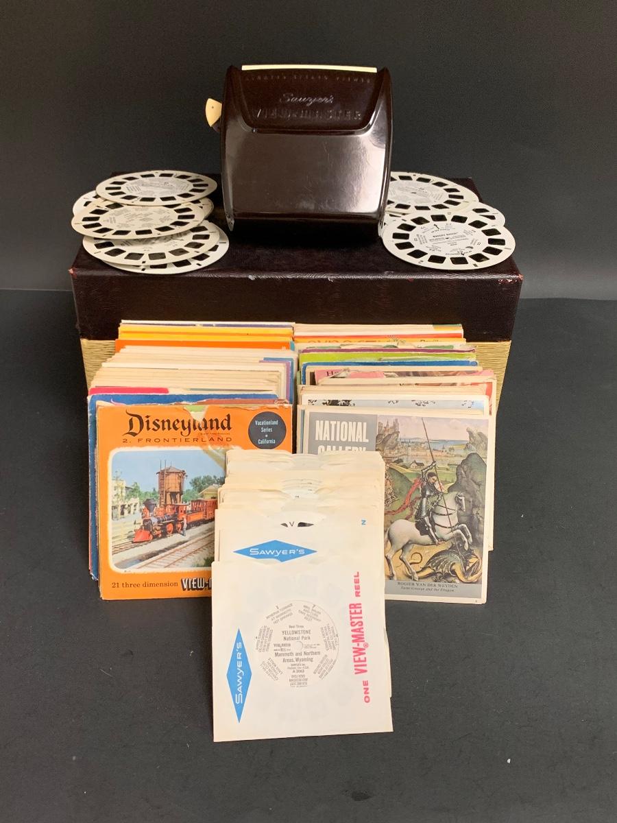 Vintage Sawyer "lighted stereo viewer" View Master. There is a large collection of reels and the carrying case.. The lighted compartment was not checked and untested.